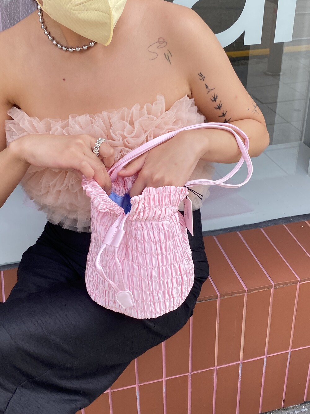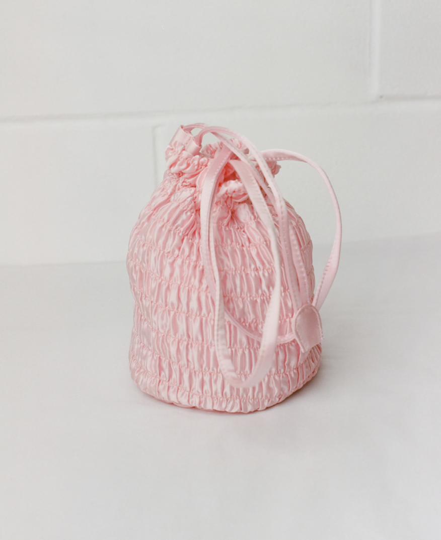 실크 플리츠 원단으로 만들어진 스트링 버킷백 Puff GIna Bag을 소개합니다.