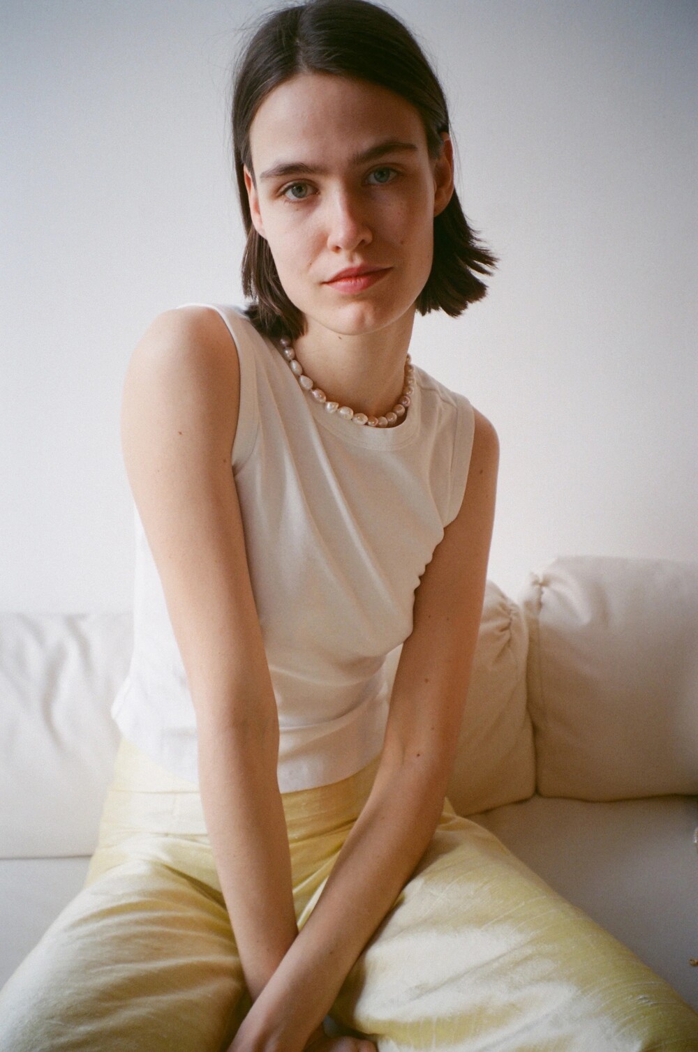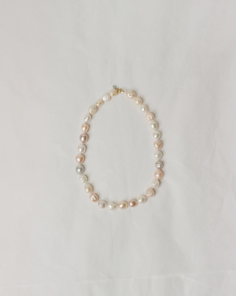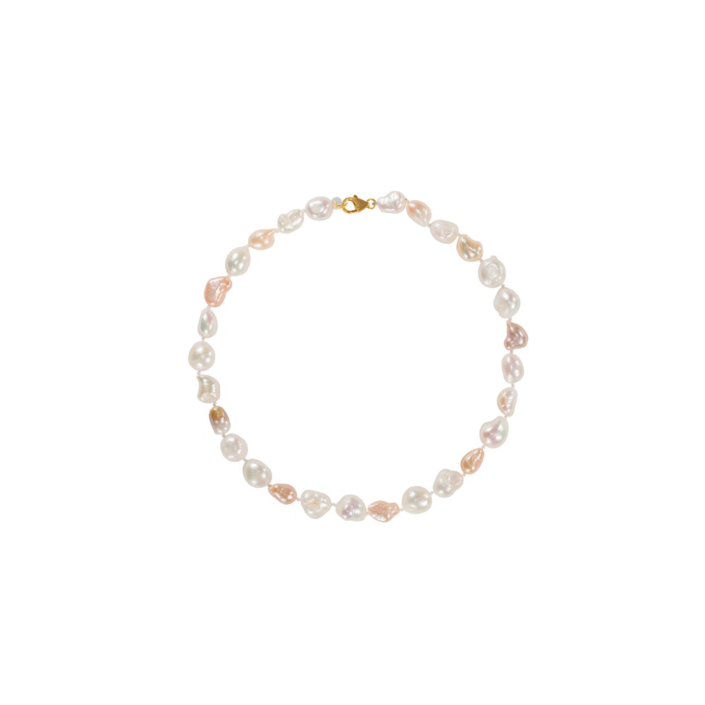 Jean Necklace는 상아색, 핑크색, 라일락색 담수 진주와 파란 빛깔의 칼세도니 원석 이루어진 목걸이입니다.
