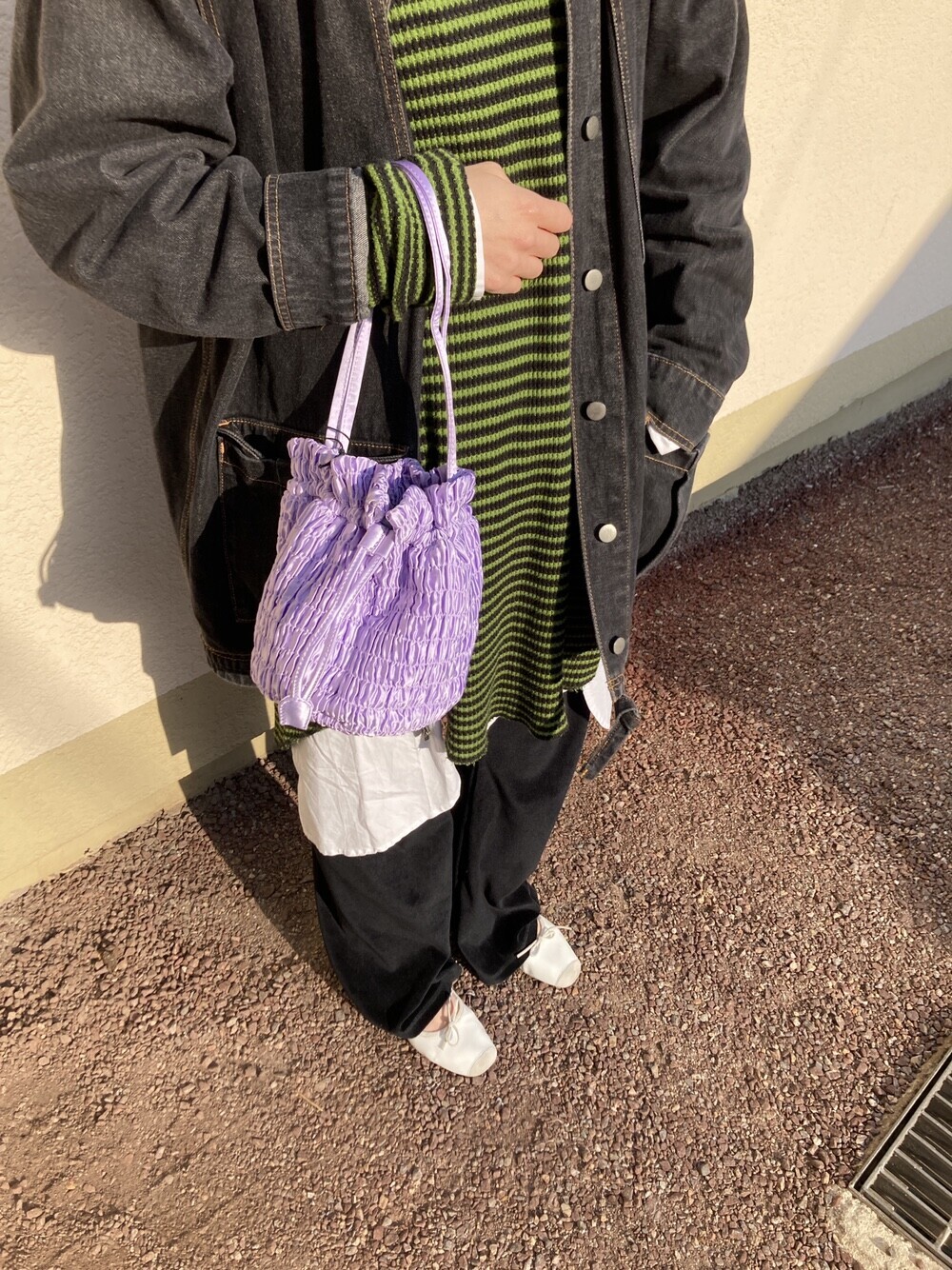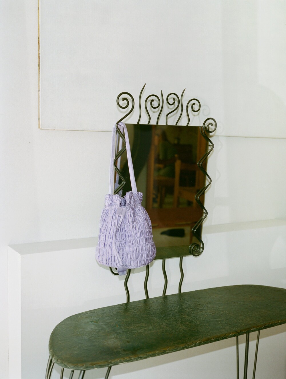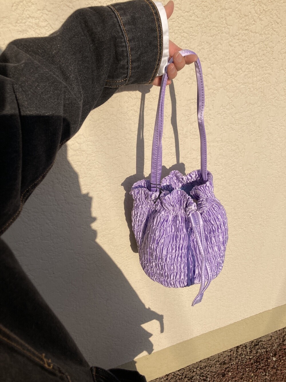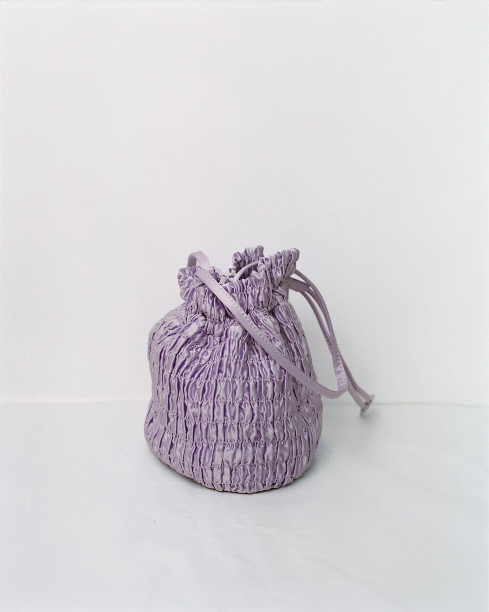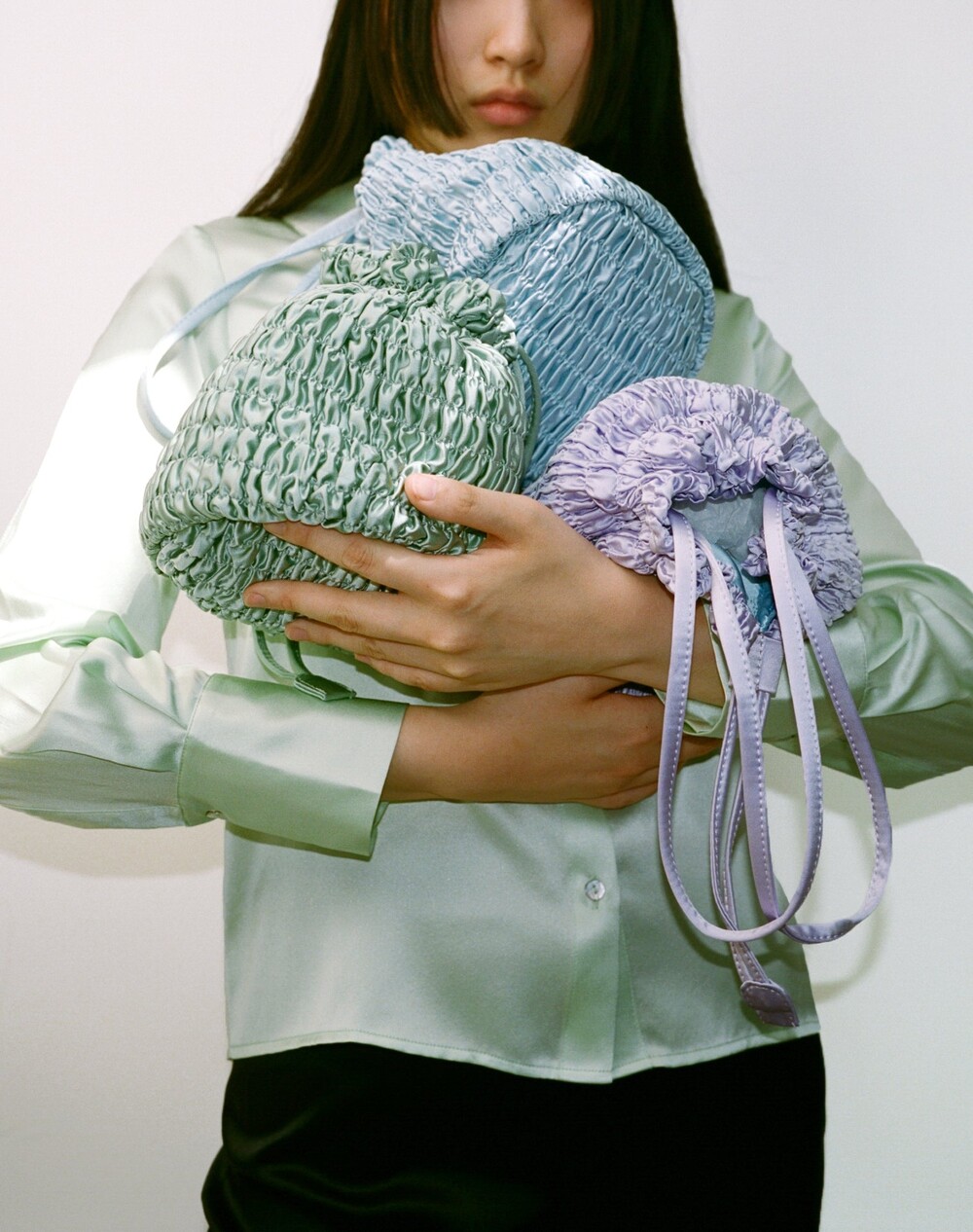 실크 플리츠 원단으로 만들어진 스트링 버킷백 Puff GIna Bag을 소개합니다.