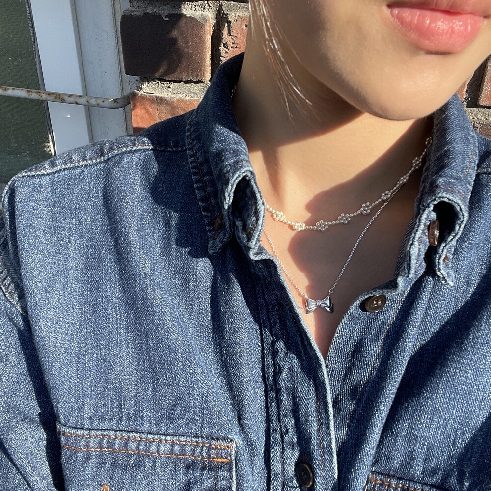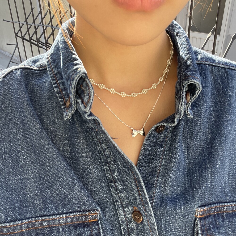실버인 만큼 진주 목걸이랑 레이어드해도 부담스럽지 않아 데일리로 착용하실 수 있을거예요:)