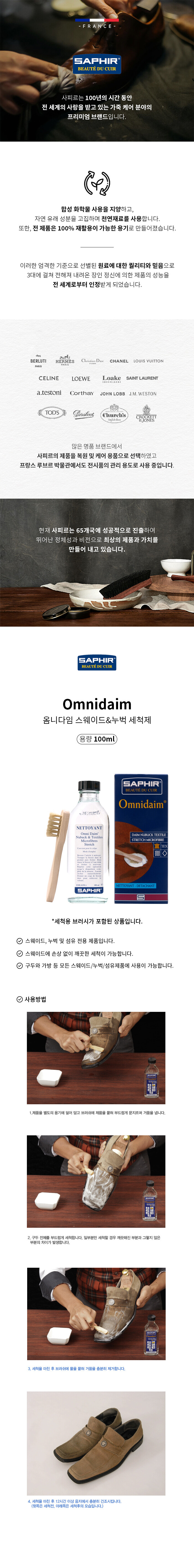 SAPHIR(사피르)는 1920년 프랑스 파리에서 설립된 프랑스를 대표하는 가죽케어 브랜드입니다. 꾸준한 연구와 최고의 재료의 결과로 가죽의 보존과 관리, 품질과 다양성으로 세계 여러나라로 수출하고 있습니다. 1925년 가죽제품의 장인정신을 오래 즐길 수 있도록 본래의 특성을 살린 케어제품 프리미엄라인을 출시하여 더욱 완벽한 제품을 선보이고 있습니다.