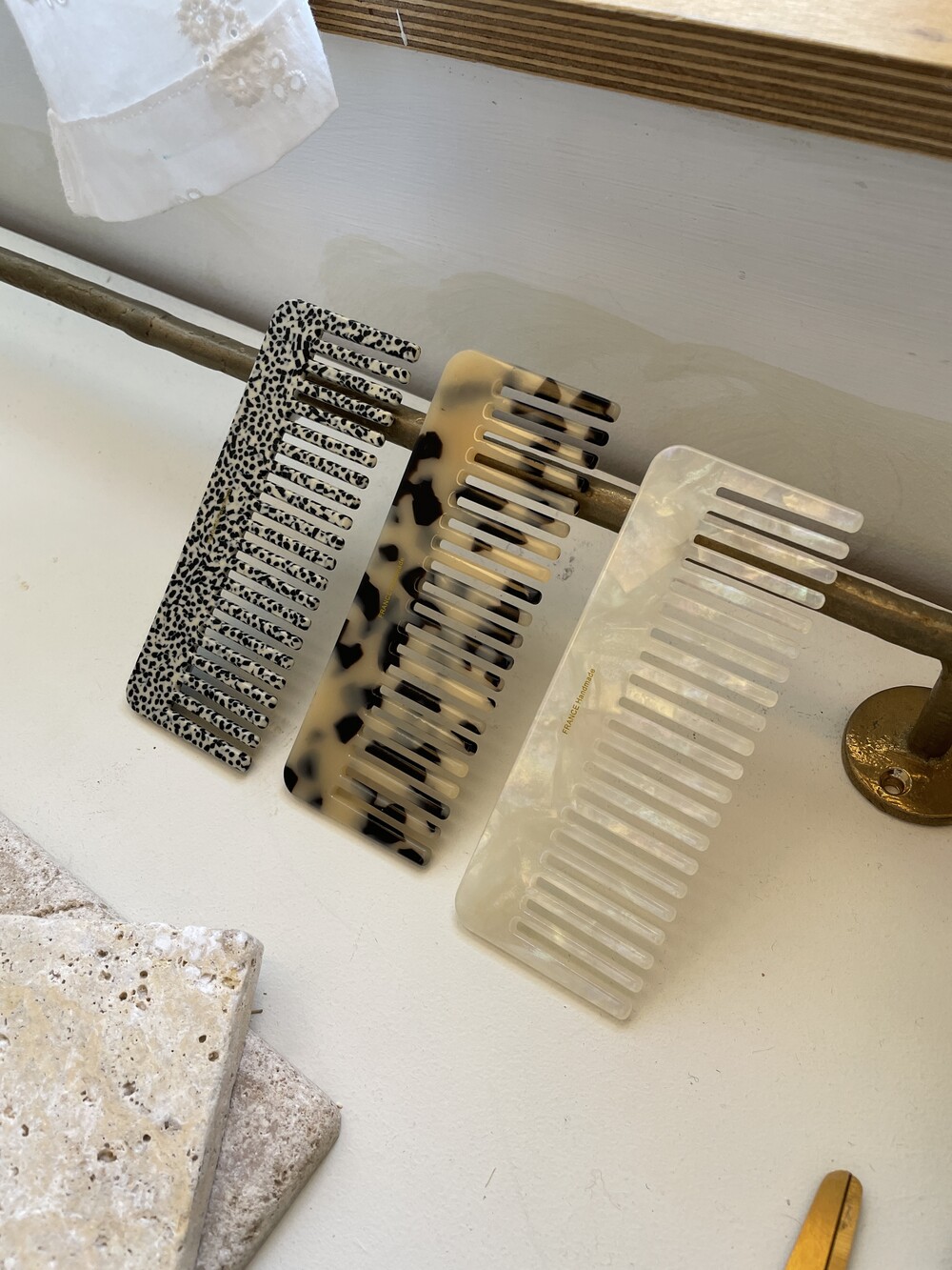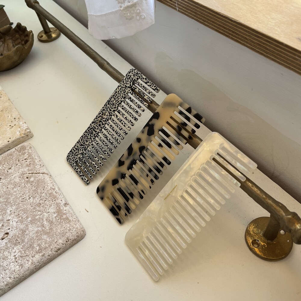 세가지 컬러의 빗을 소개해드립니다 :) 여성 손사이즈 정도의 큼직한 빗으로 매장에서 많은 분들이 구매하시는 제품중 하나입니다. 부드럽게 잘 빗겨지며, 가벼운 소재로 휴대하기 좋은 아이템 입니다. 화장대 위 센스있는 브러쉬 제품으로 추천해드려요!