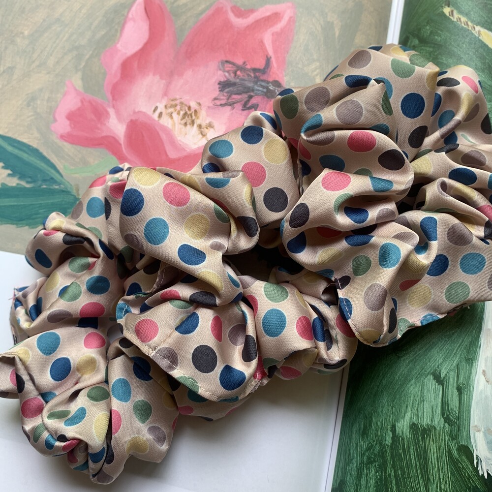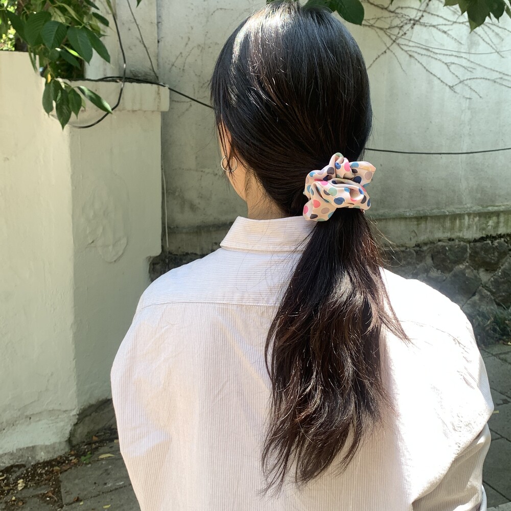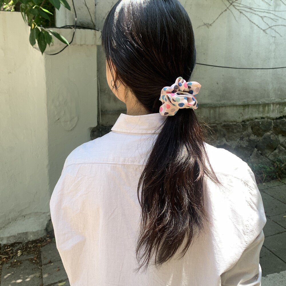 베이지 컬러 베이스의 웜한 색감의 도트 포인트가 사랑스러운 Bubble Gum Scrunchie를 소개합니다.