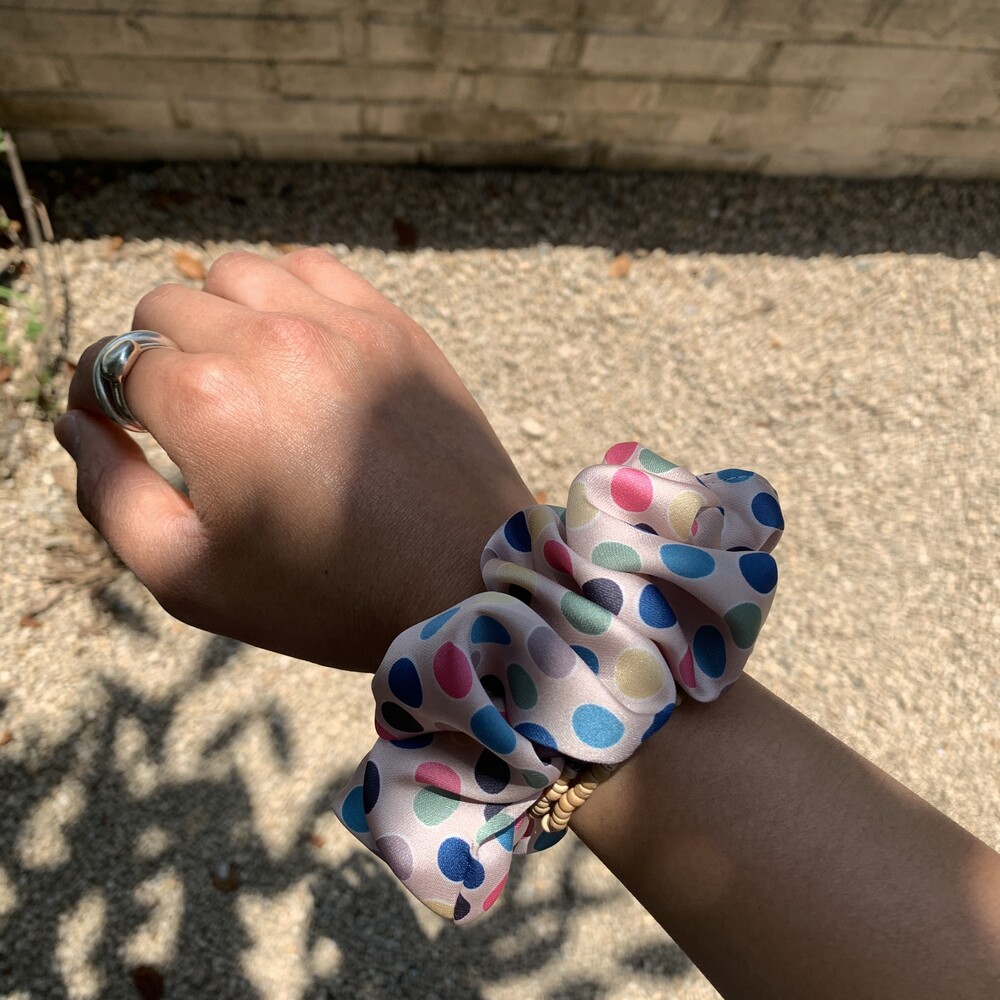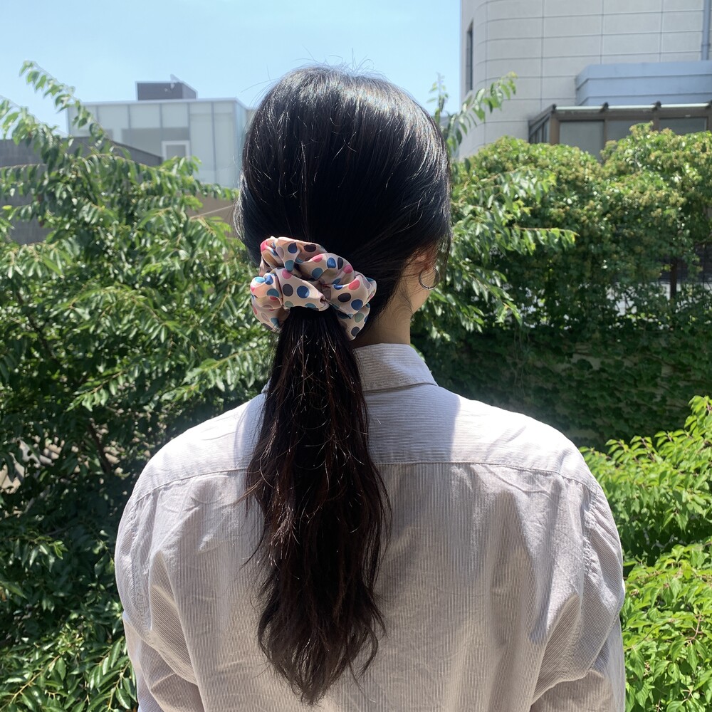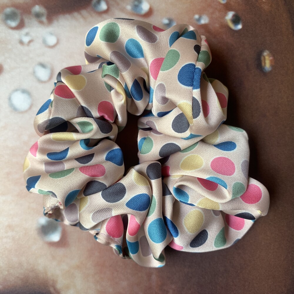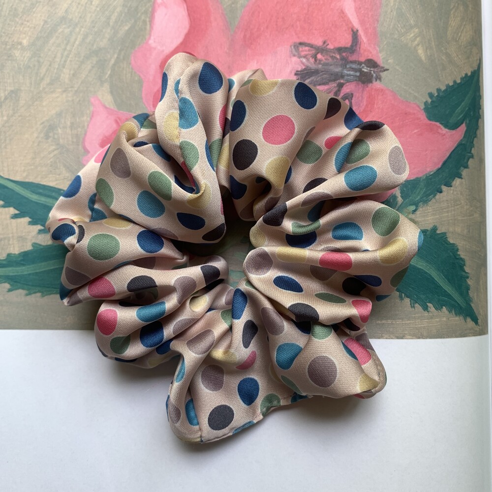 베이지 컬러 베이스의 웜한 색감의 도트 포인트가 사랑스러운 Bubble Gum Scrunchie를 소개합니다.