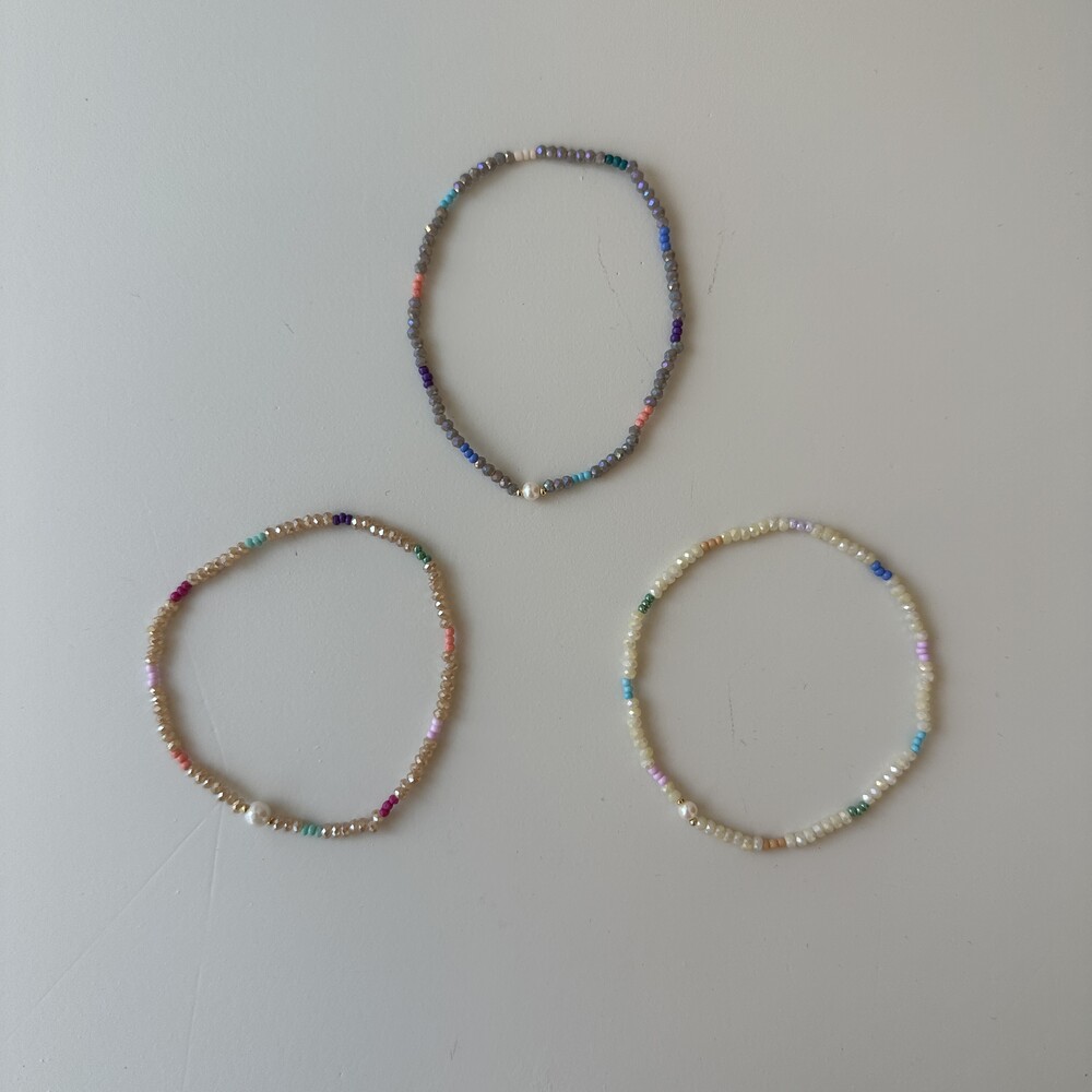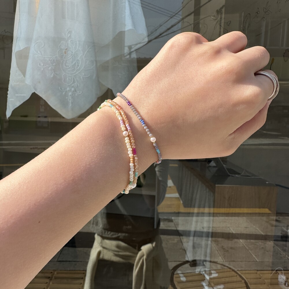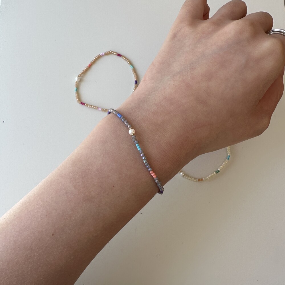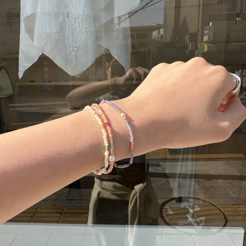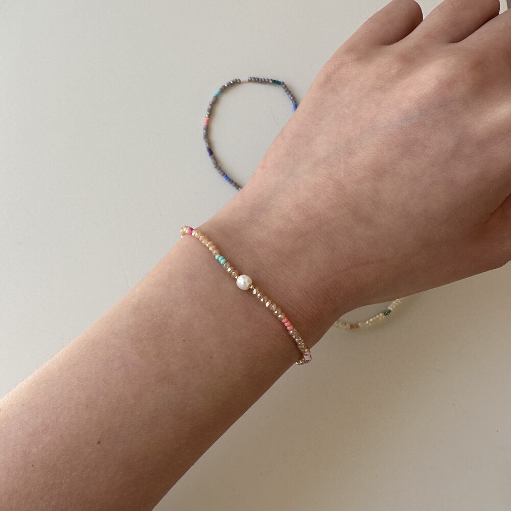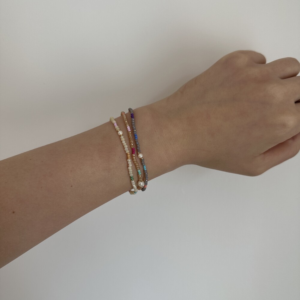 가장 베이스가 되는 비즈가 각도에 따라서 반짝이는 비즈 팔찌입니다.