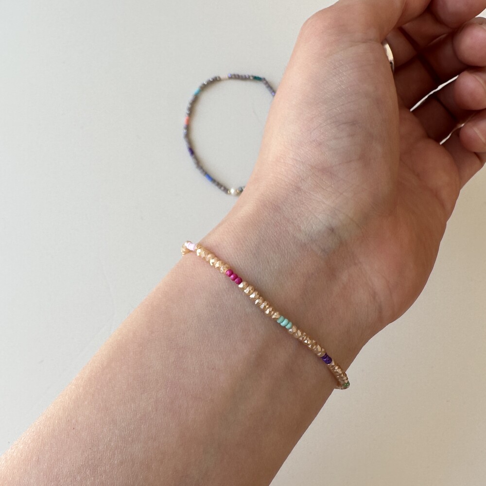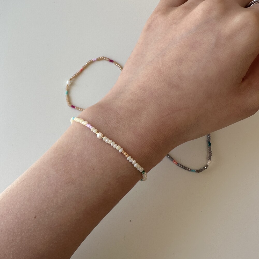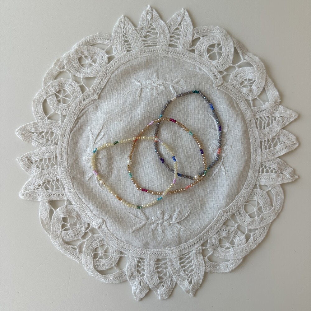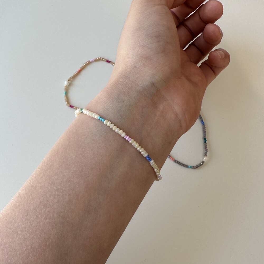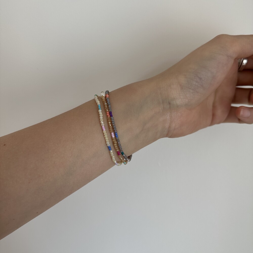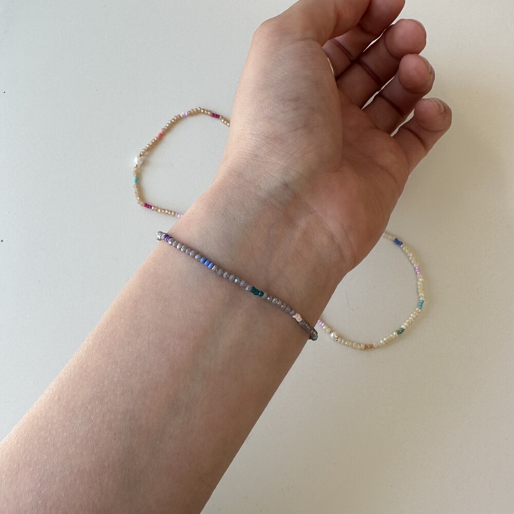 가장 베이스가 되는 비즈가 각도에 따라서 반짝이는 비즈 팔찌입니다.