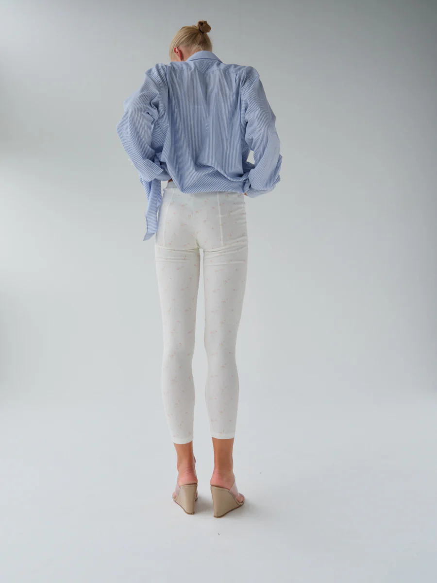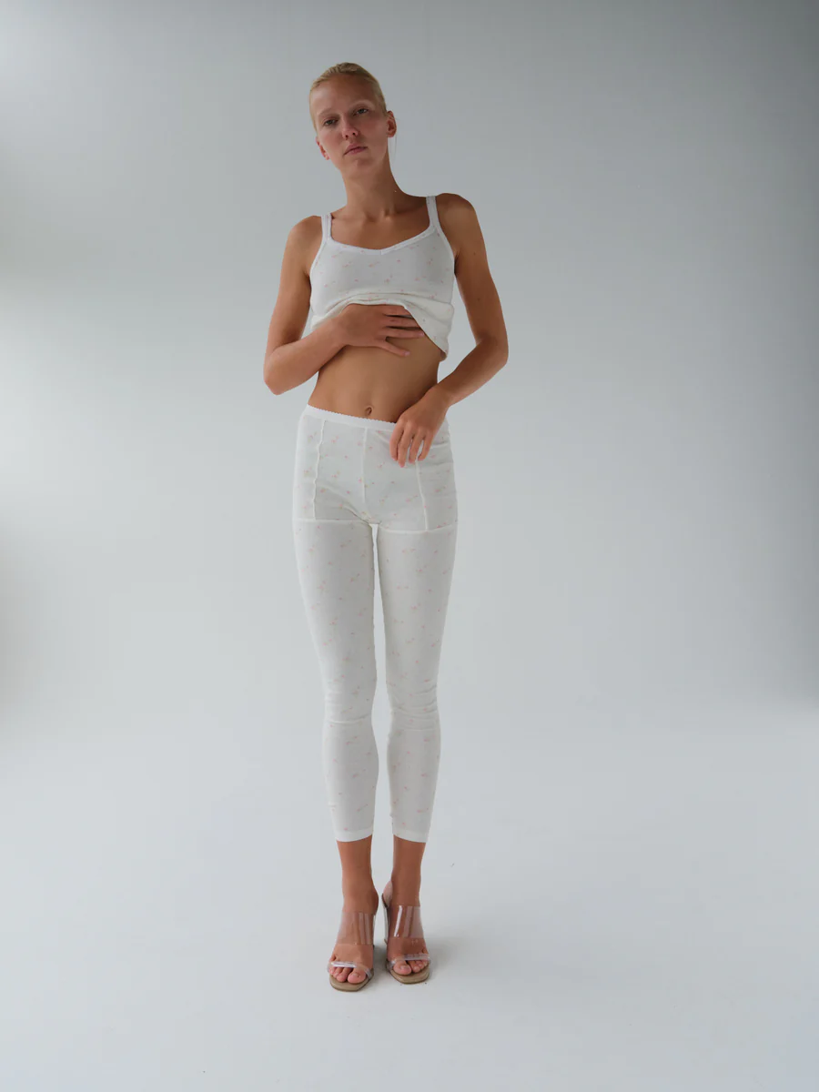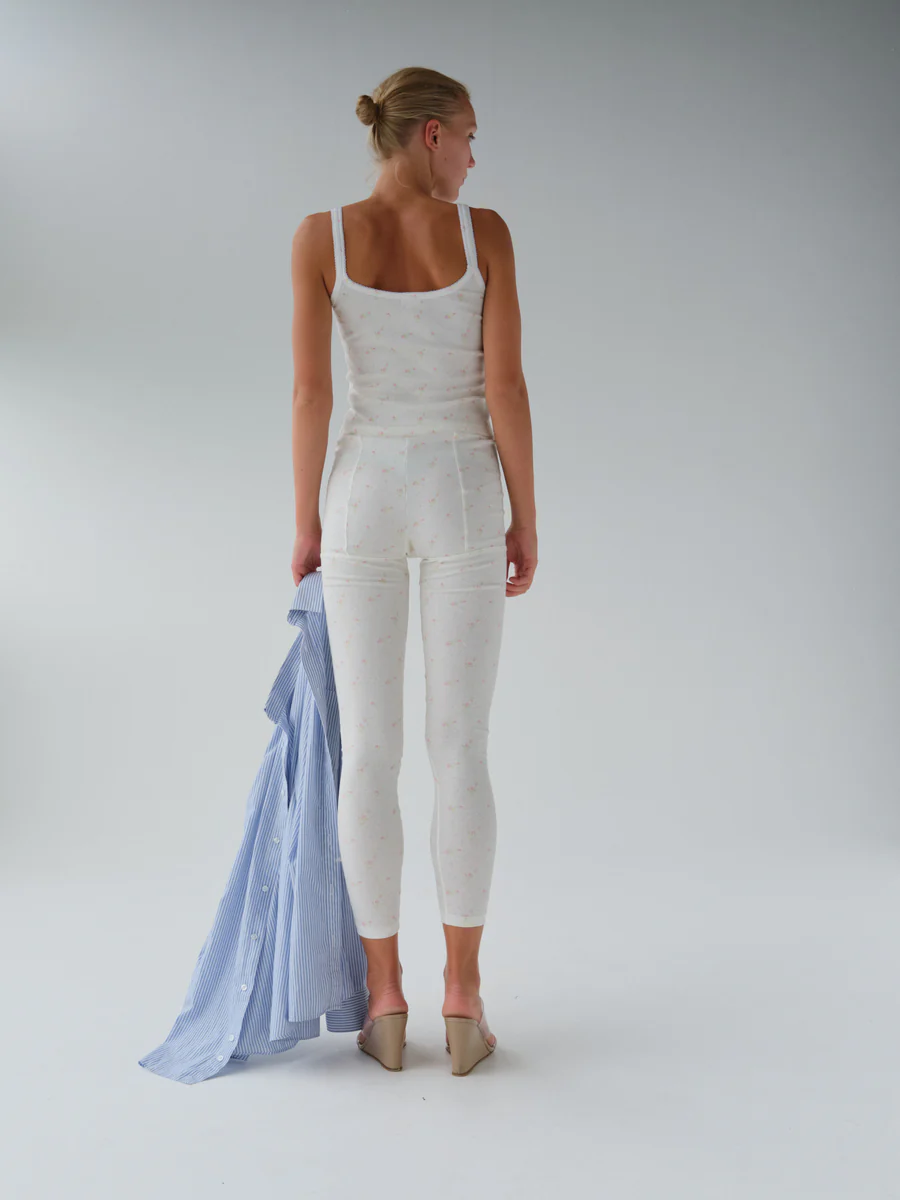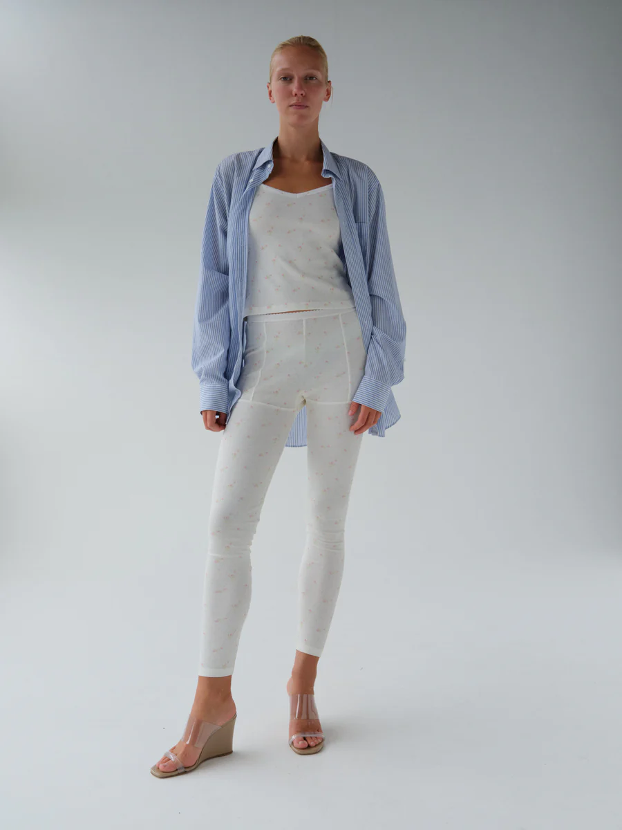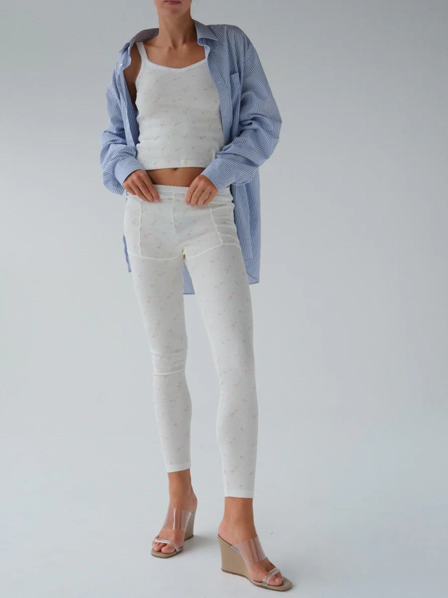 가장 부드러운 코튼 골지 소재로 제작된 레깅스입니다. 빈티지 벽지에서 영감을 받은 커스텀 플로럴 프린트가 포인트입니다.