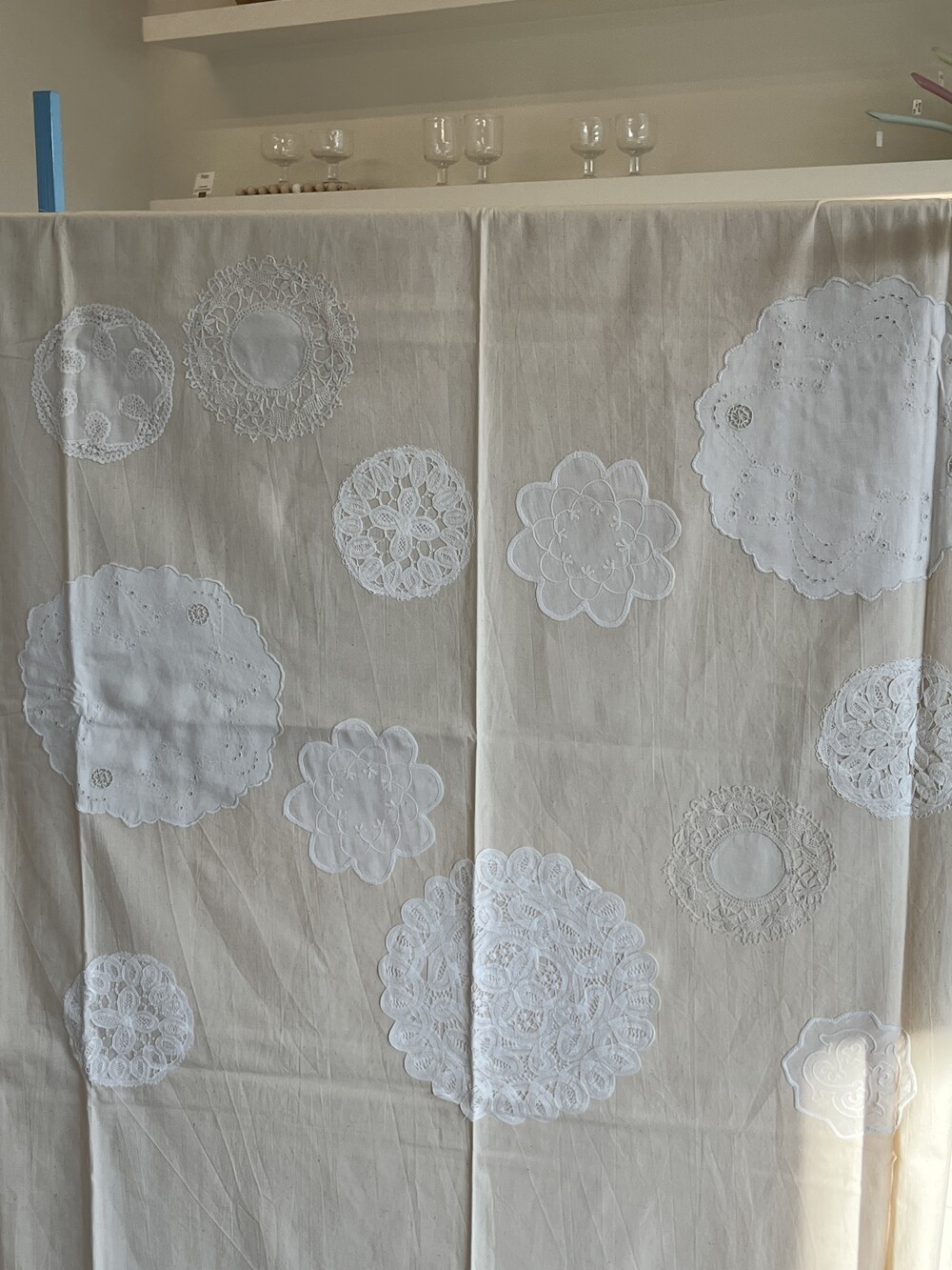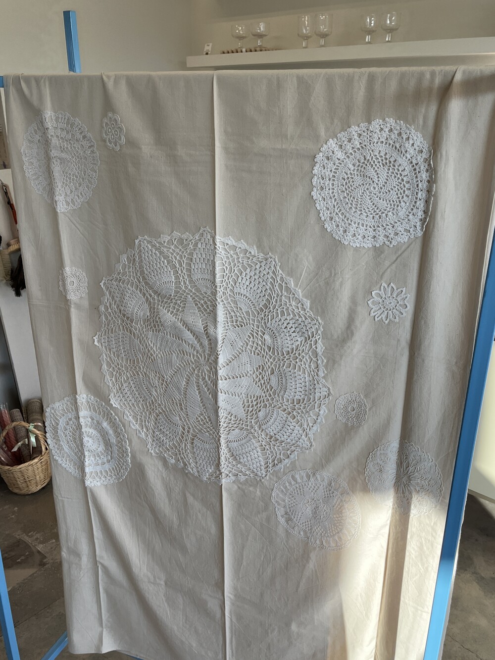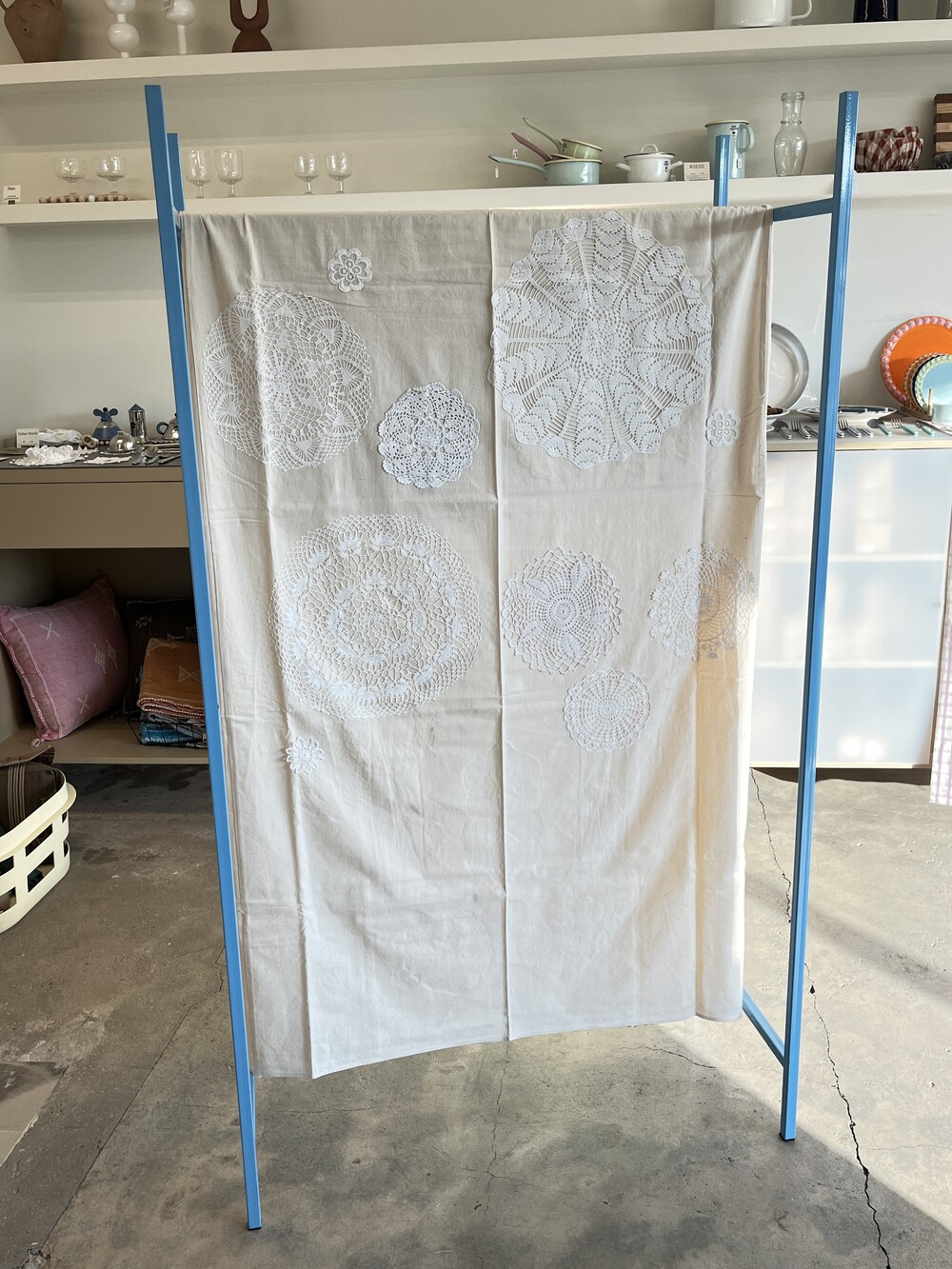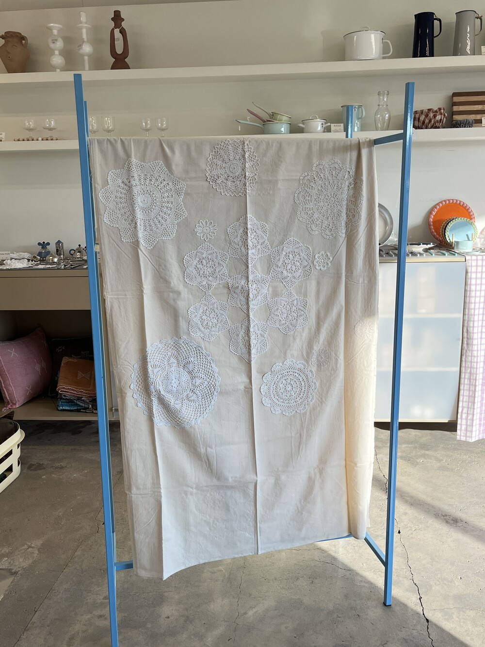 꽃 모양 크로쉐 자수 유닛이 수놓아진 테이블클로스입니다. 자수는 패브릭 중간에만 위치해있습니다.