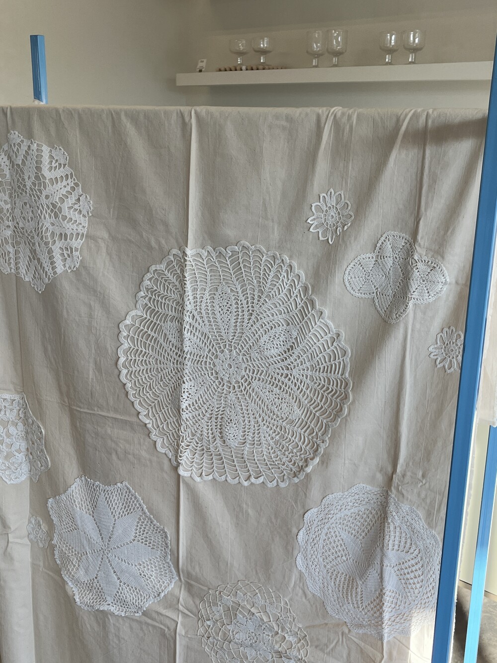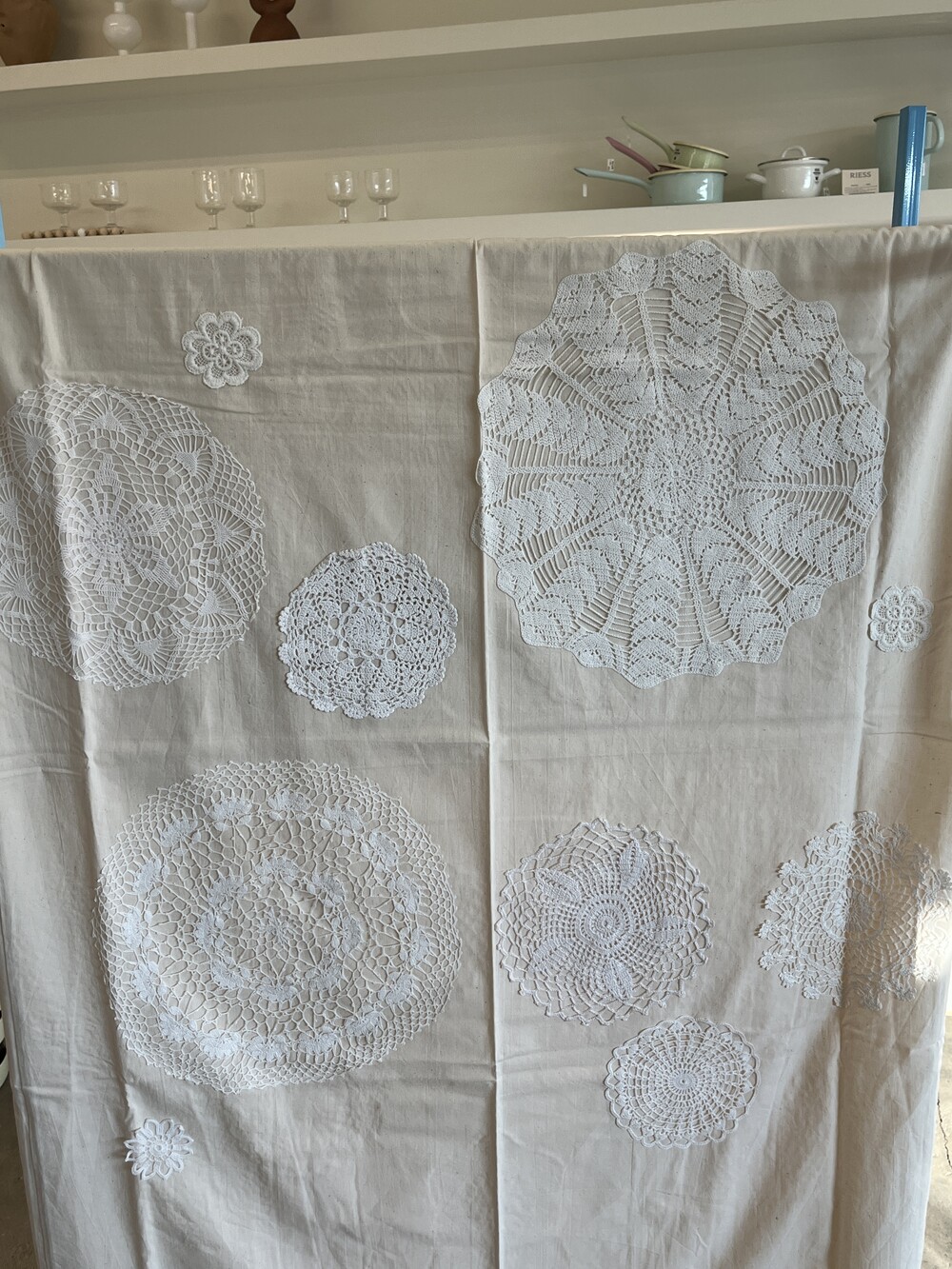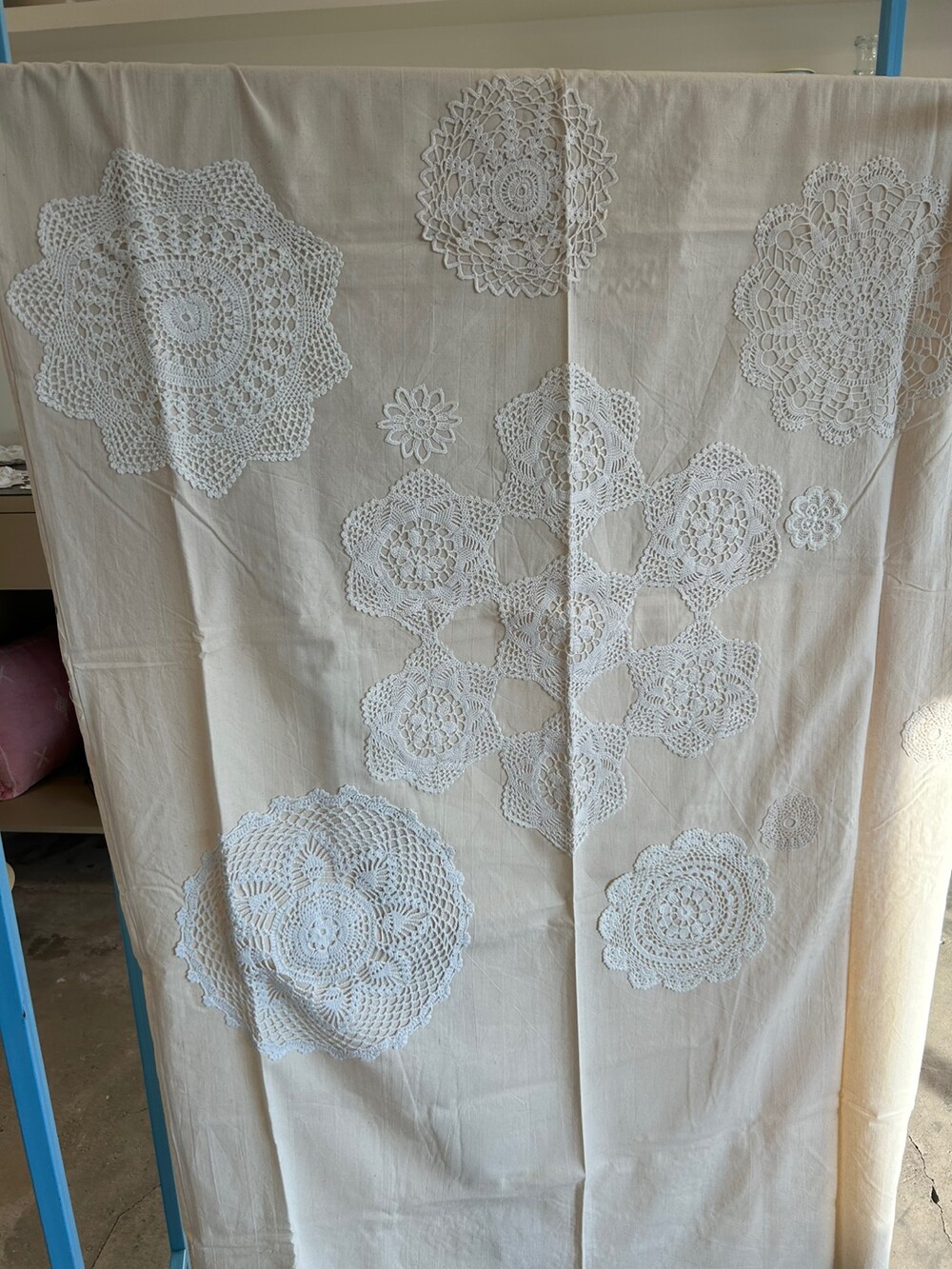 꽃 모양 크로쉐 자수 유닛이 수놓아진 테이블클로스입니다. 자수는 패브릭 중간에만 위치해있습니다.