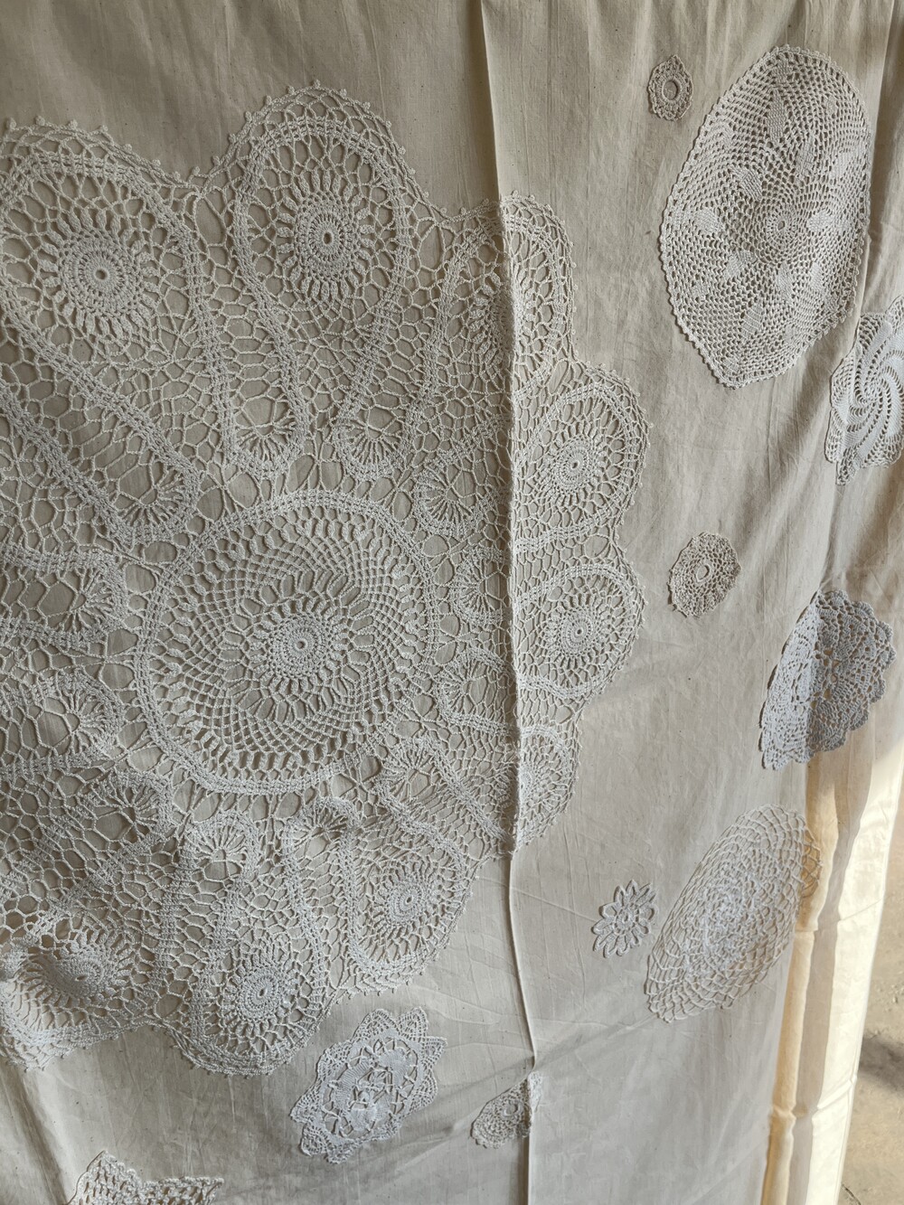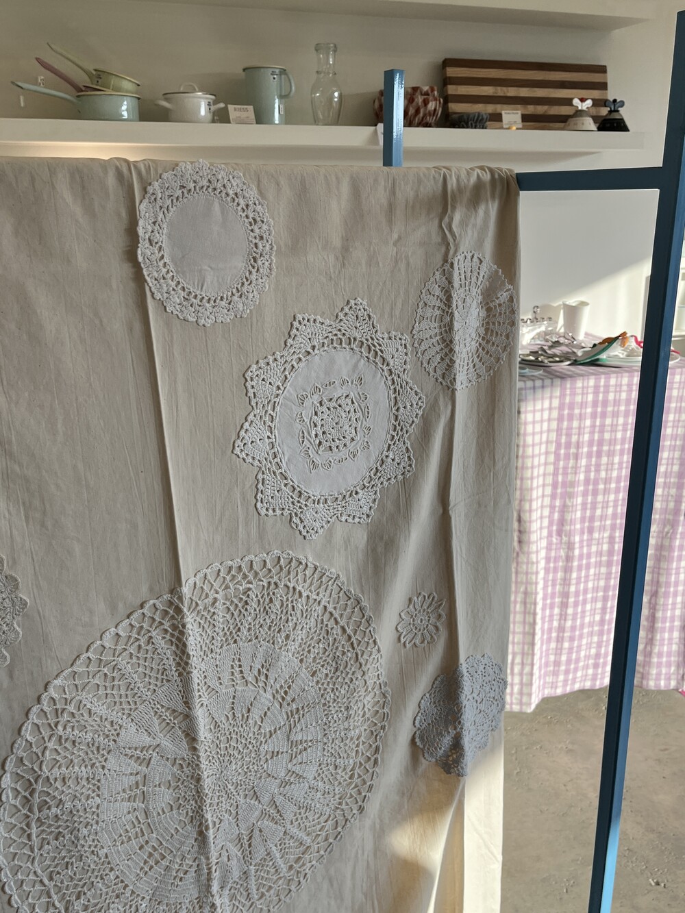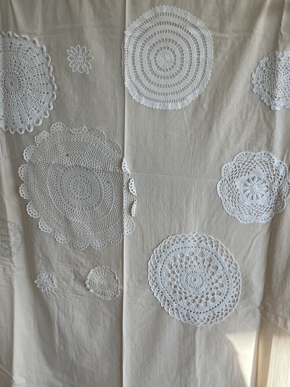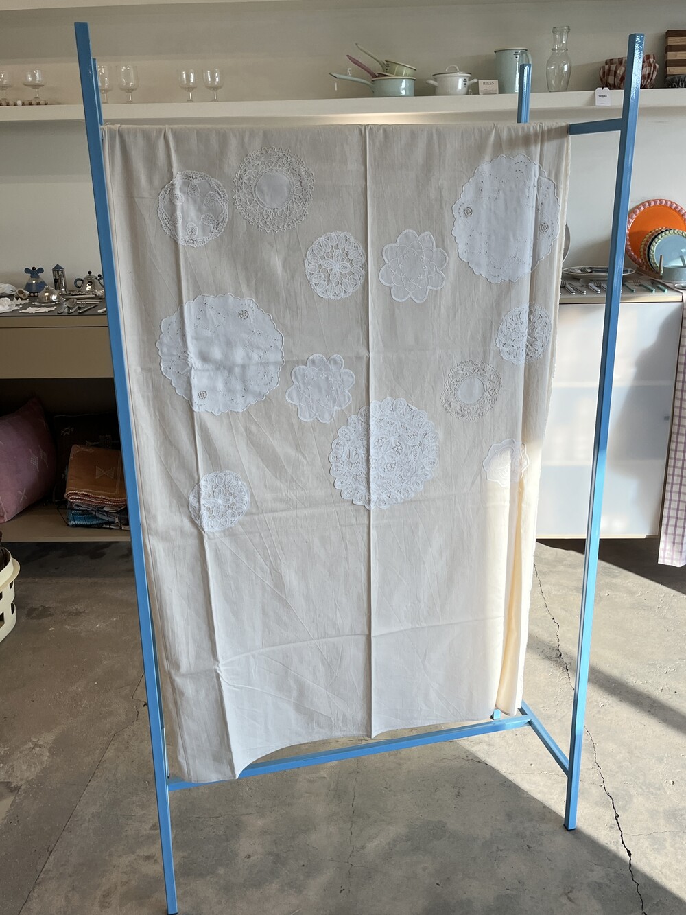 꽃 모양 크로쉐 자수 유닛이 수놓아진 테이블클로스입니다. 자수는 패브릭 중간에만 위치해있습니다.