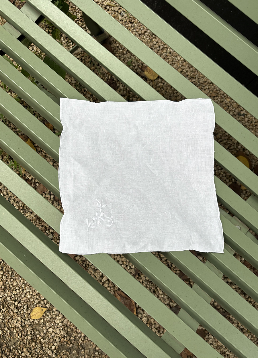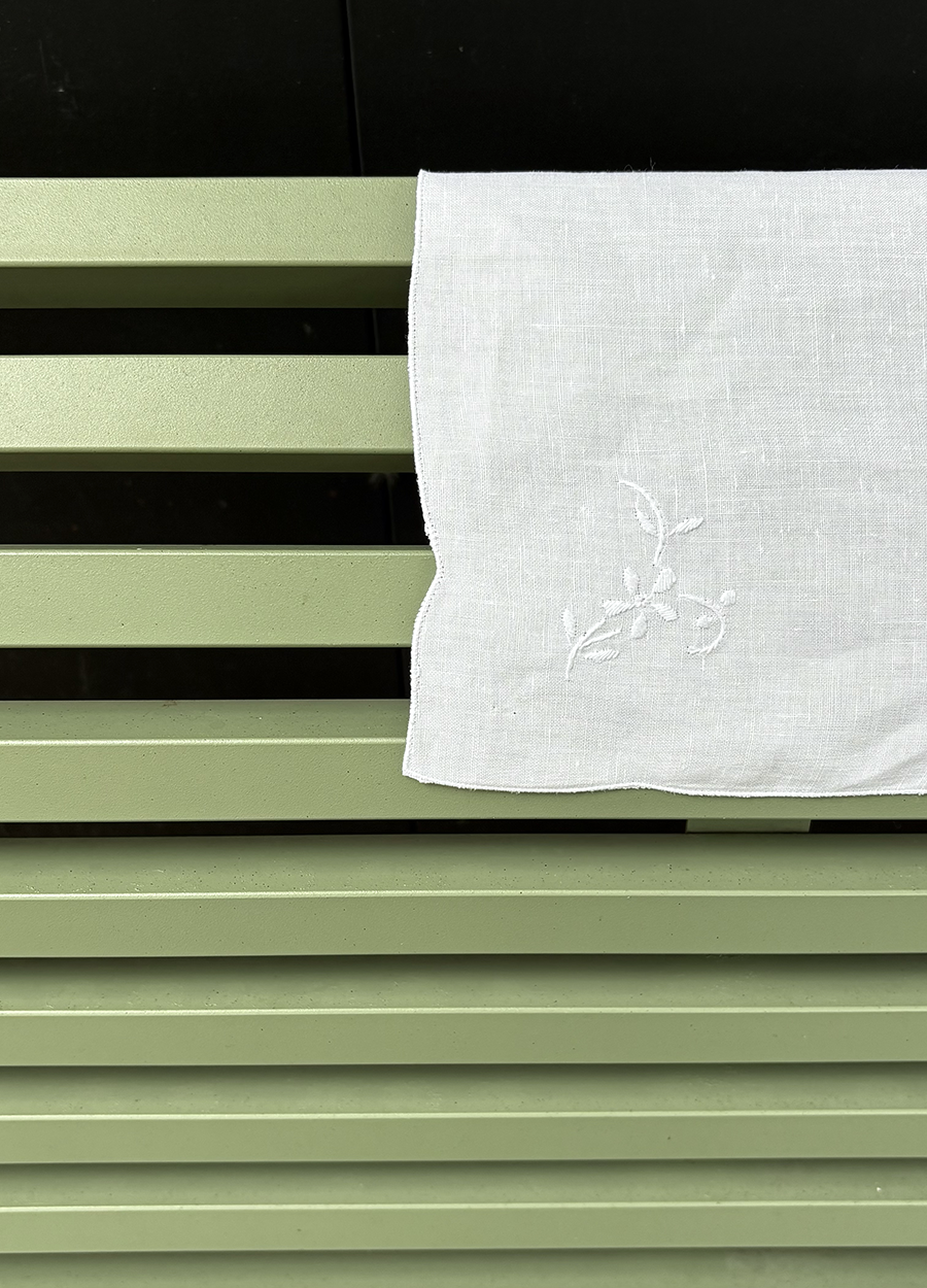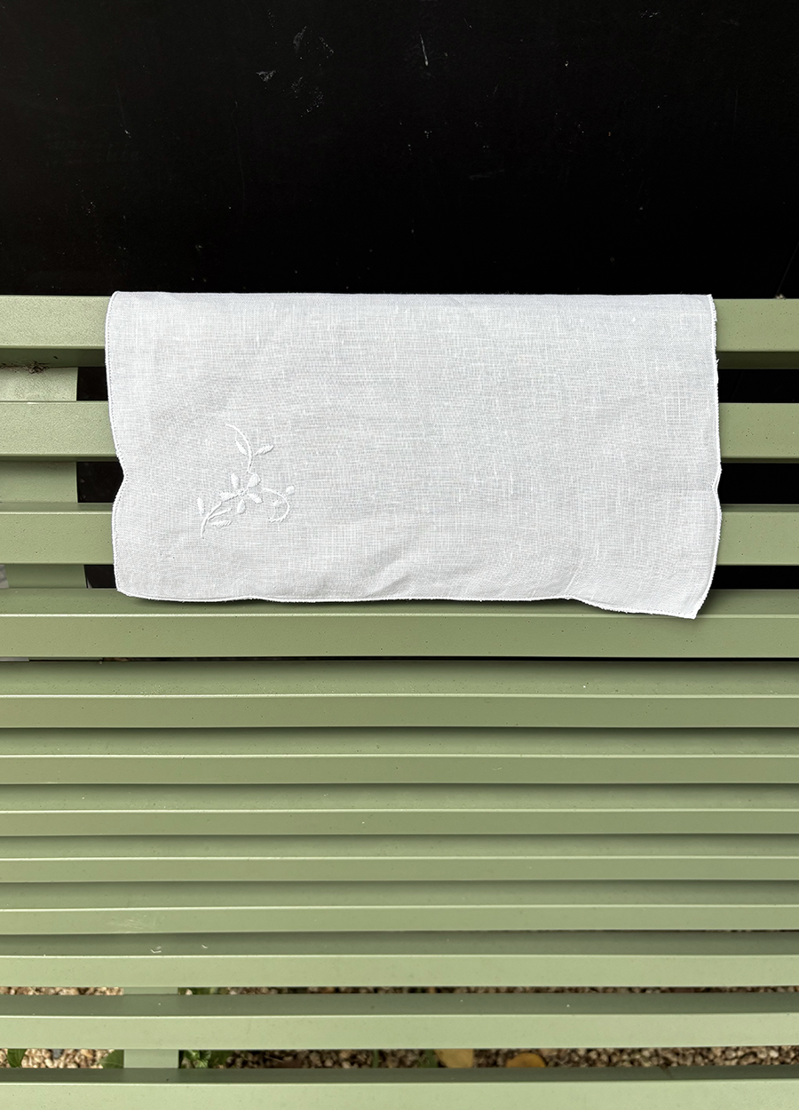 한쪽에 섬세하게 놓인 자수가 포인트인 린넨 냅킨입니다.