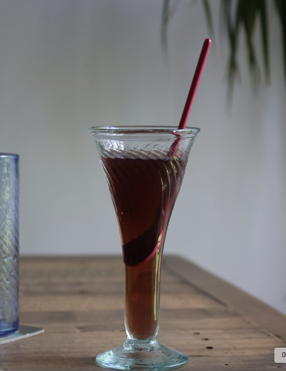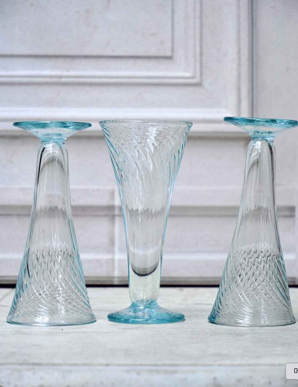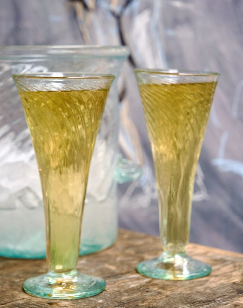 재활용 유리를 입으로 불어 만든 길고 가느다란 샴페인 잔입니다.