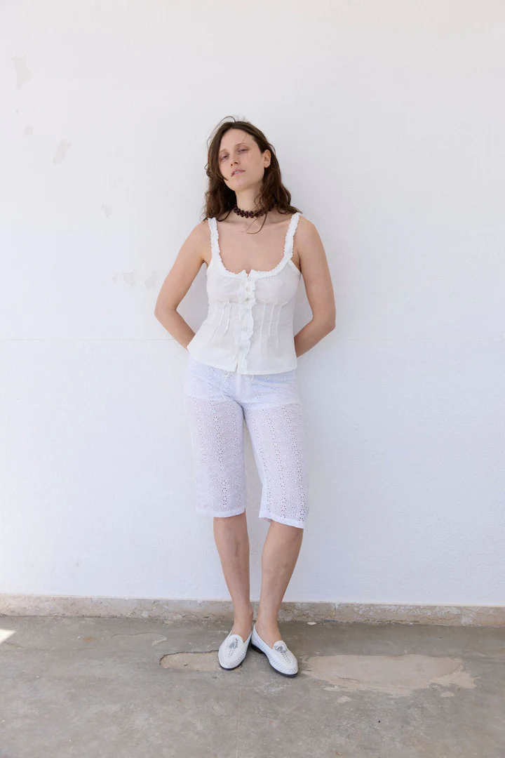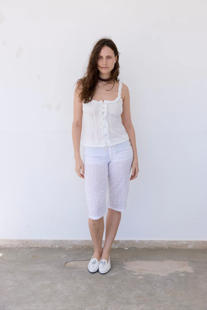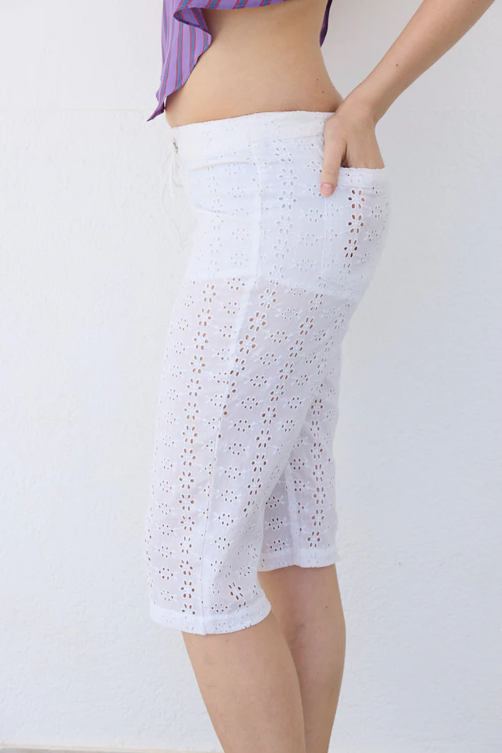 빈티지 감성 가득한 Broderie Anglaise 카프리 팬츠앞면 지퍼와 타이 디테일이 돋보이는 디자인입니다.