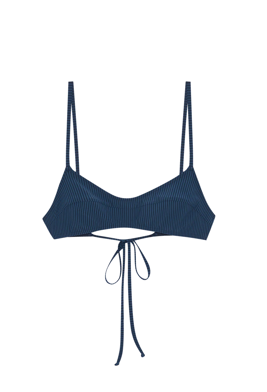 데드스톡 스트라이프 소재로 제작된 새로운 타이 백 비키니 탑입니다.