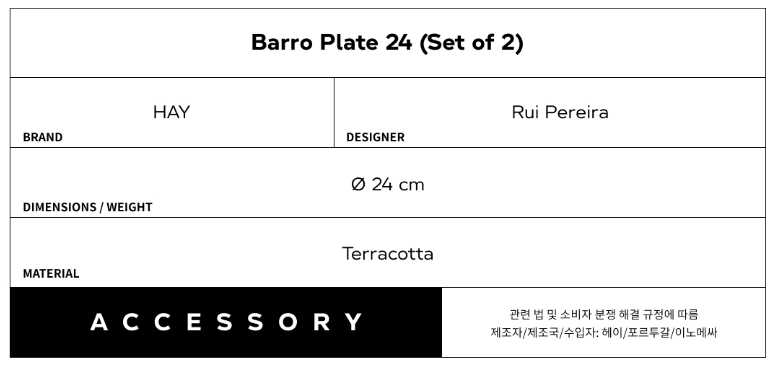 부드러운 촉감과 비율이 결합된 바로 플레이트의 롤 엣지 디테일은 플레이트의 사용감을 즐겁게 해주는 안정감을 제공합니다. 포르투갈에서 내구성이 뛰어난 테라코타로 제작된 Barro Plate는다양한 고광택 색상으로 유약 처리되어 무수히 많은 개인화된 조합으로 매치하거나 혼합할 수 있습니다. 접시는 두 개 세트로 제공됩니다.