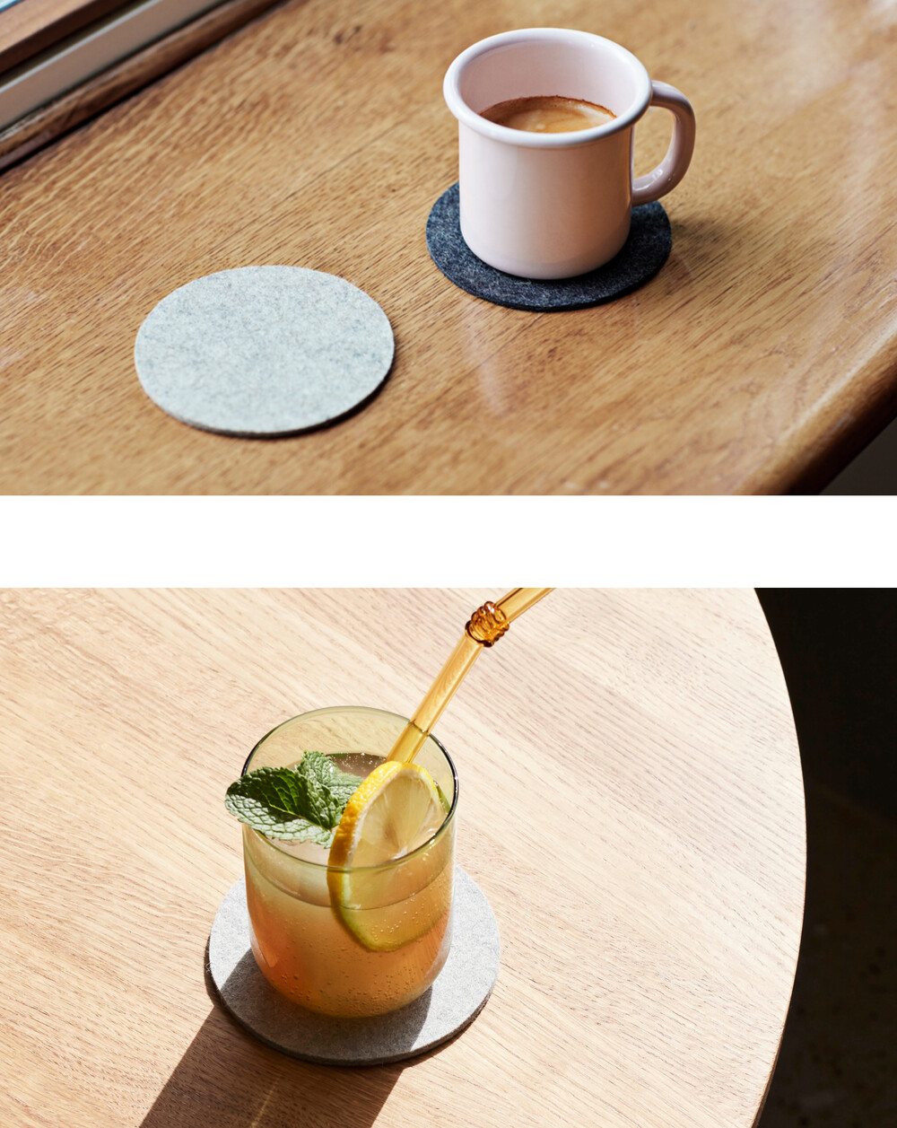 A coaster in felted dark grey or sand-coloured wool that will protect delicate surfaces from glass marks and spillages.