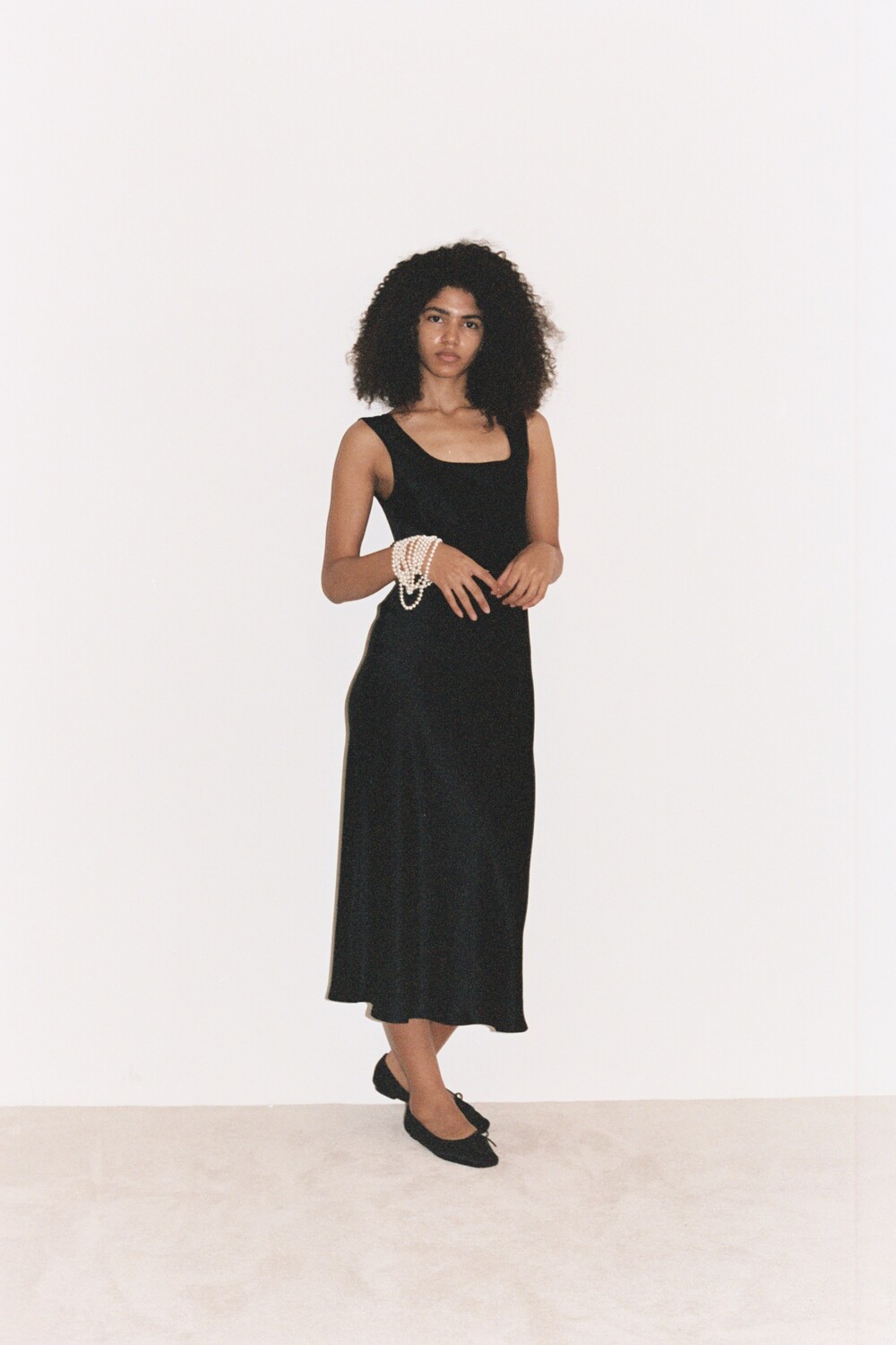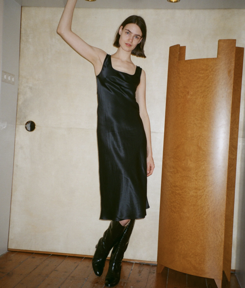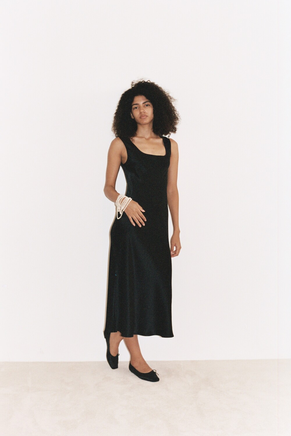 실크 소재가 유려하게 몸을 따라 흘러 몸선을 아름답게 보여줍니다.