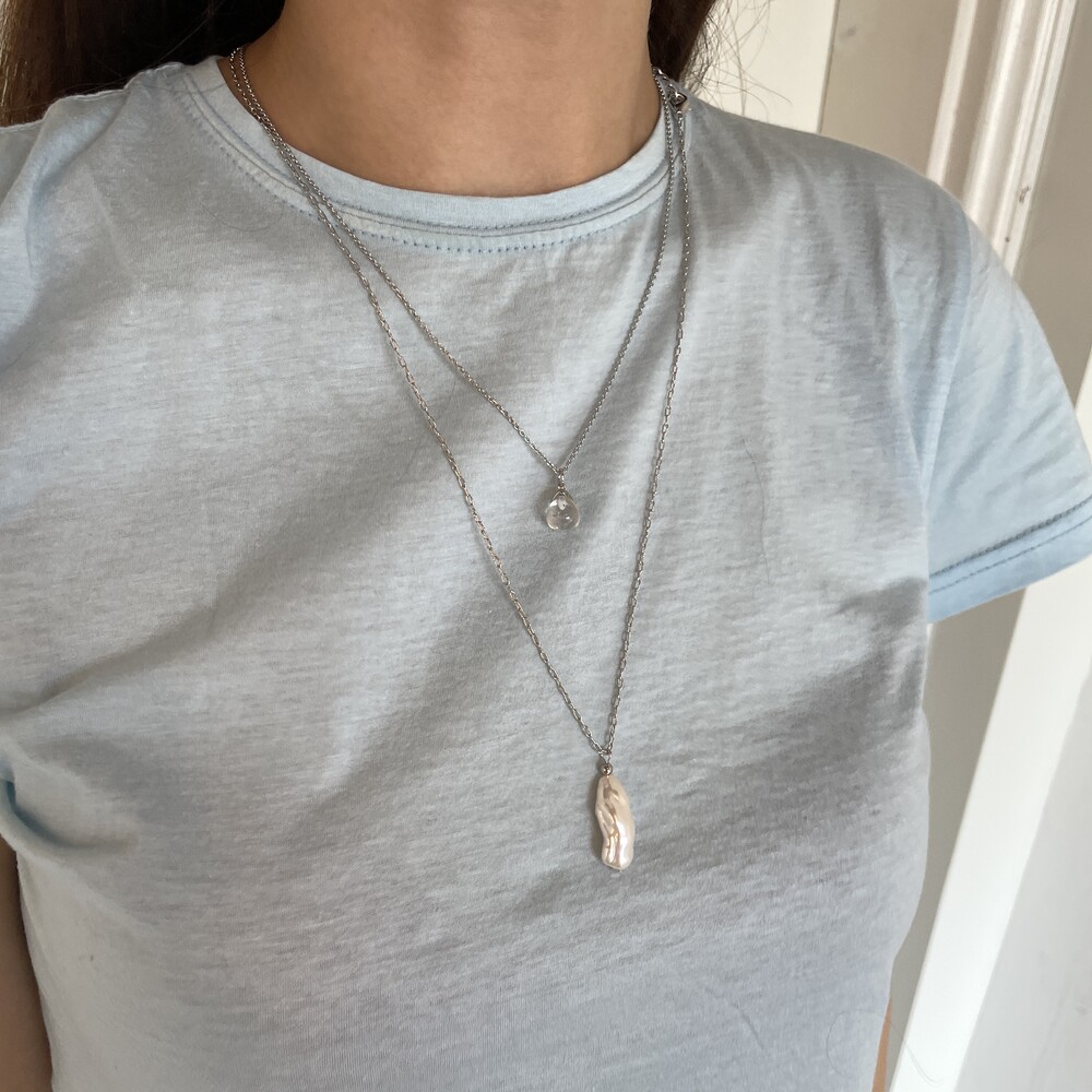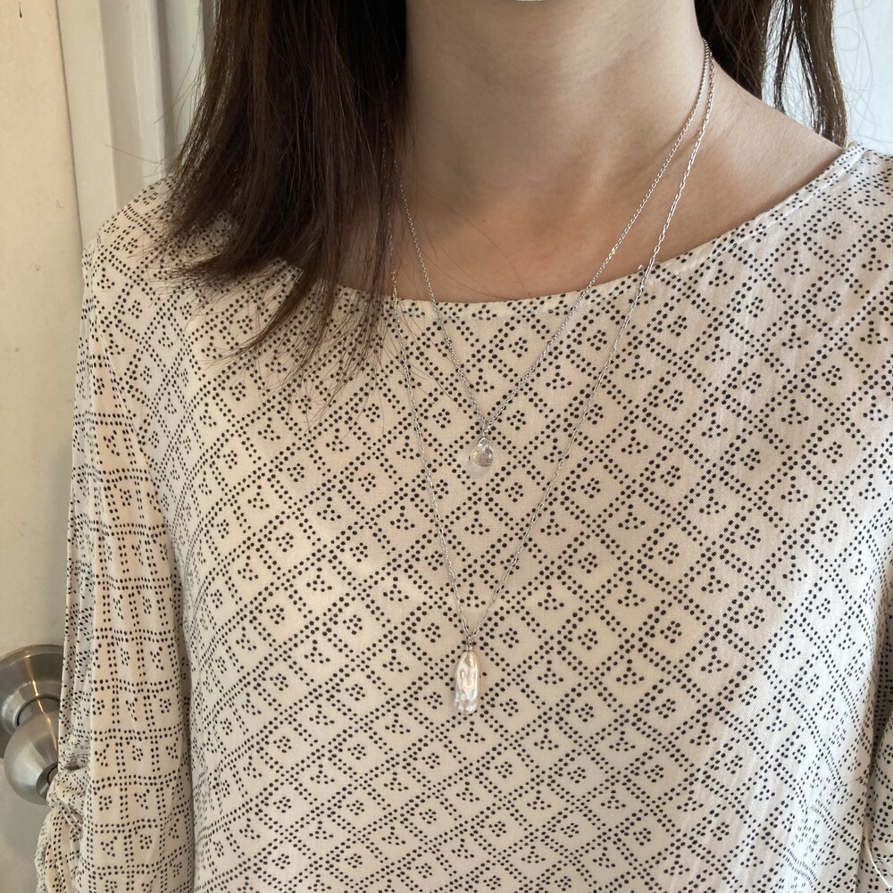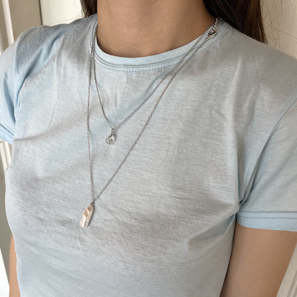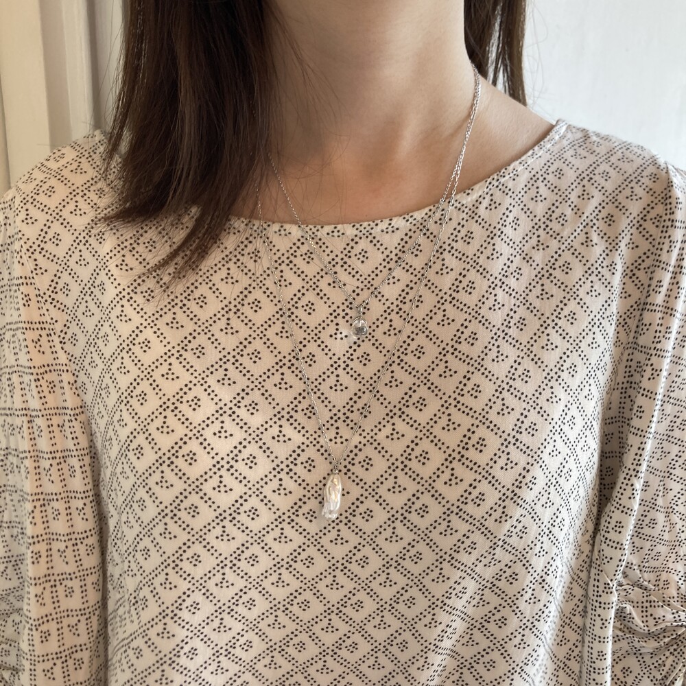 이번에는 레이어드용으로도 단품으로도 착용하기 좋은 슬림하고 롱 스타일의 Knobbly Long Pearl Necklace를 소개합니다. 펜던트는 담수진주로 청순하고 여성스러운 느낌을 줍니다. 체인 자체가 과하게 굵지 않은 미들 체인으로 나와서 다른 실버 체인 목걸이와 함께 레이어드 하기에도 적합합니다!