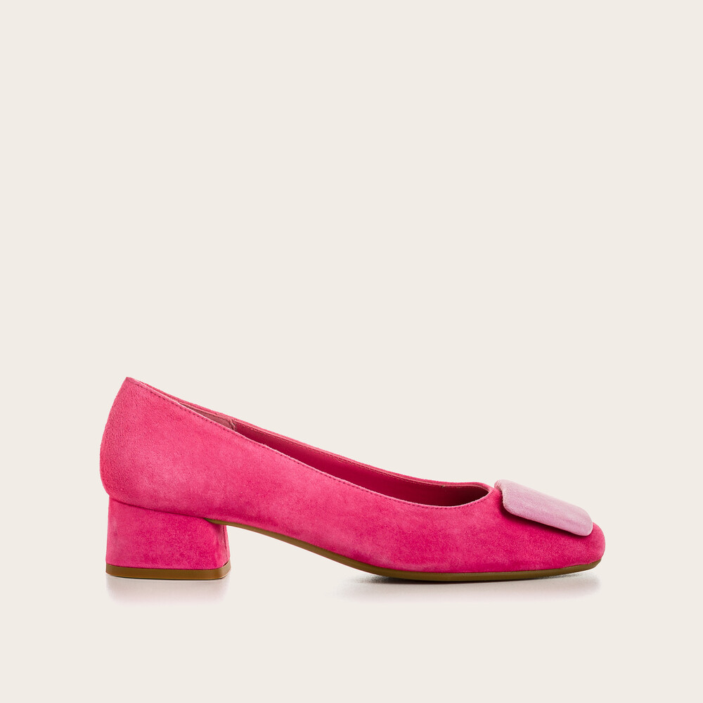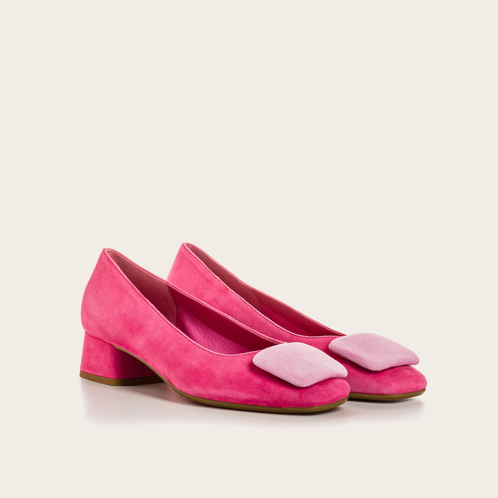 앞코 스퀘어 모양의 코르사쥬로 귀엽고 사랑스러운 무드가 느껴지는 펌프스 슈즈입니다.