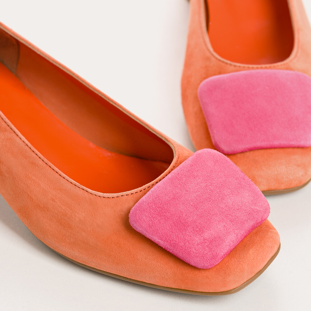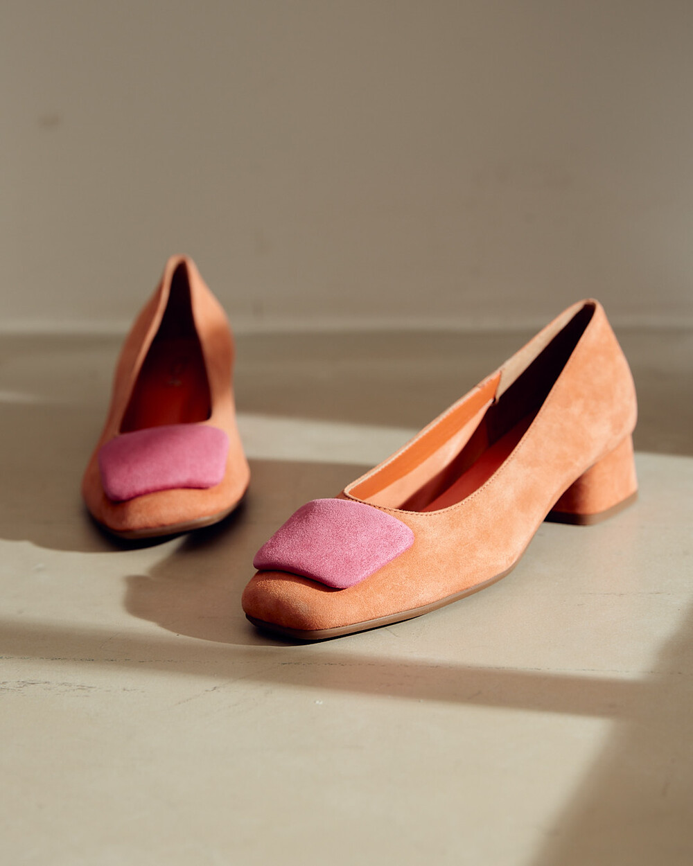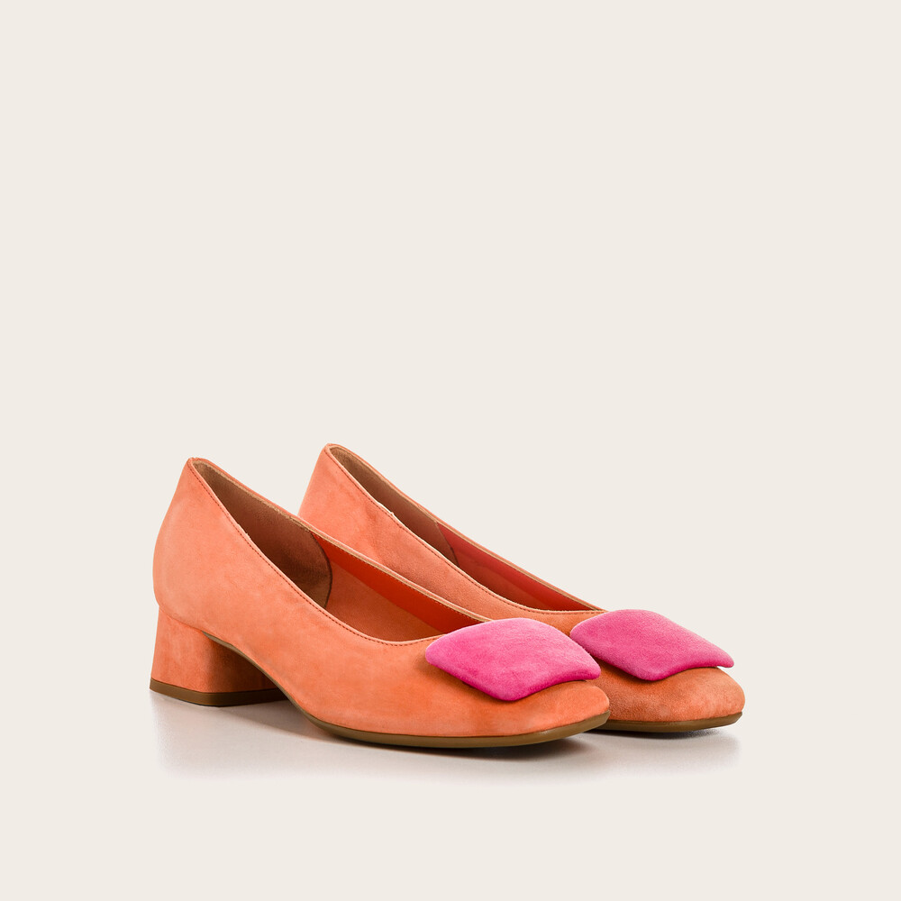 앞코 스퀘어 모양의 코르사쥬로 귀엽고 사랑스러운 무드가 느껴지는 펌프스 슈즈입니다.