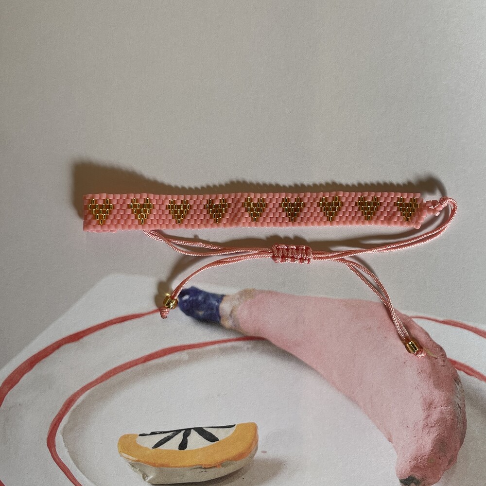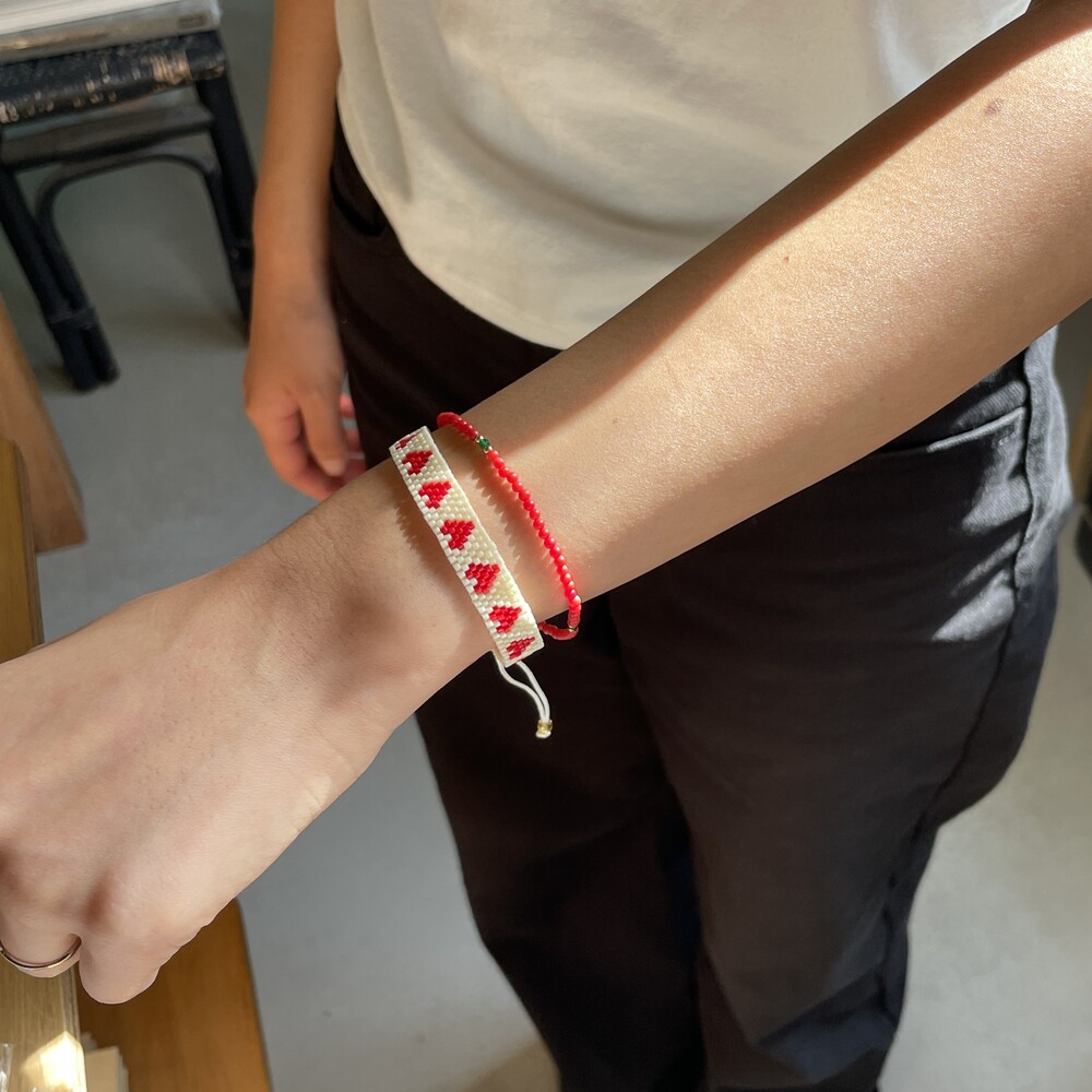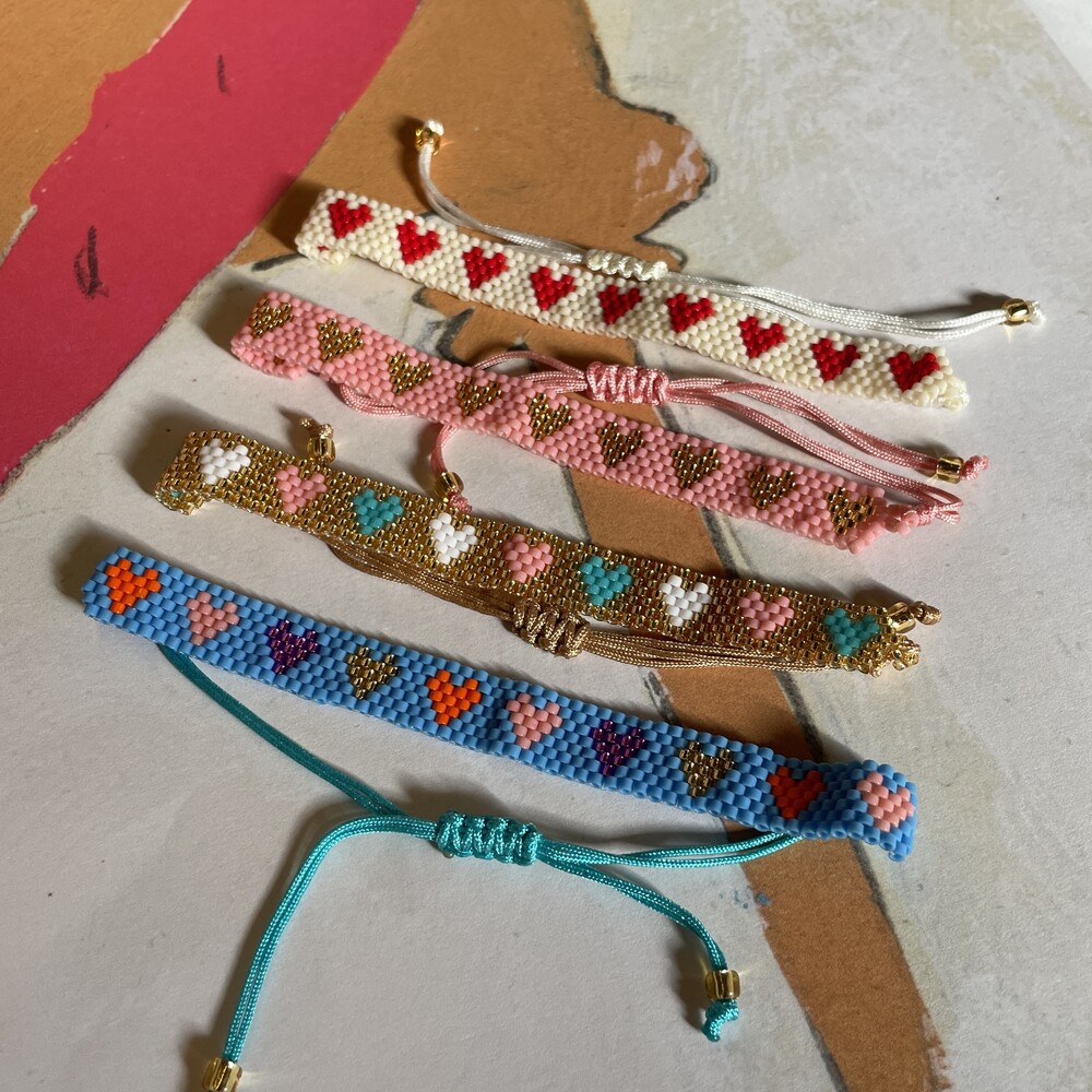 사랑스러운 하트 무늬와 매력적인 색감이 어우러진 비즈 팔찌로 포인트 주기 좋은 아이템입니다.