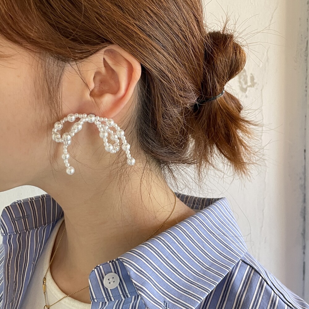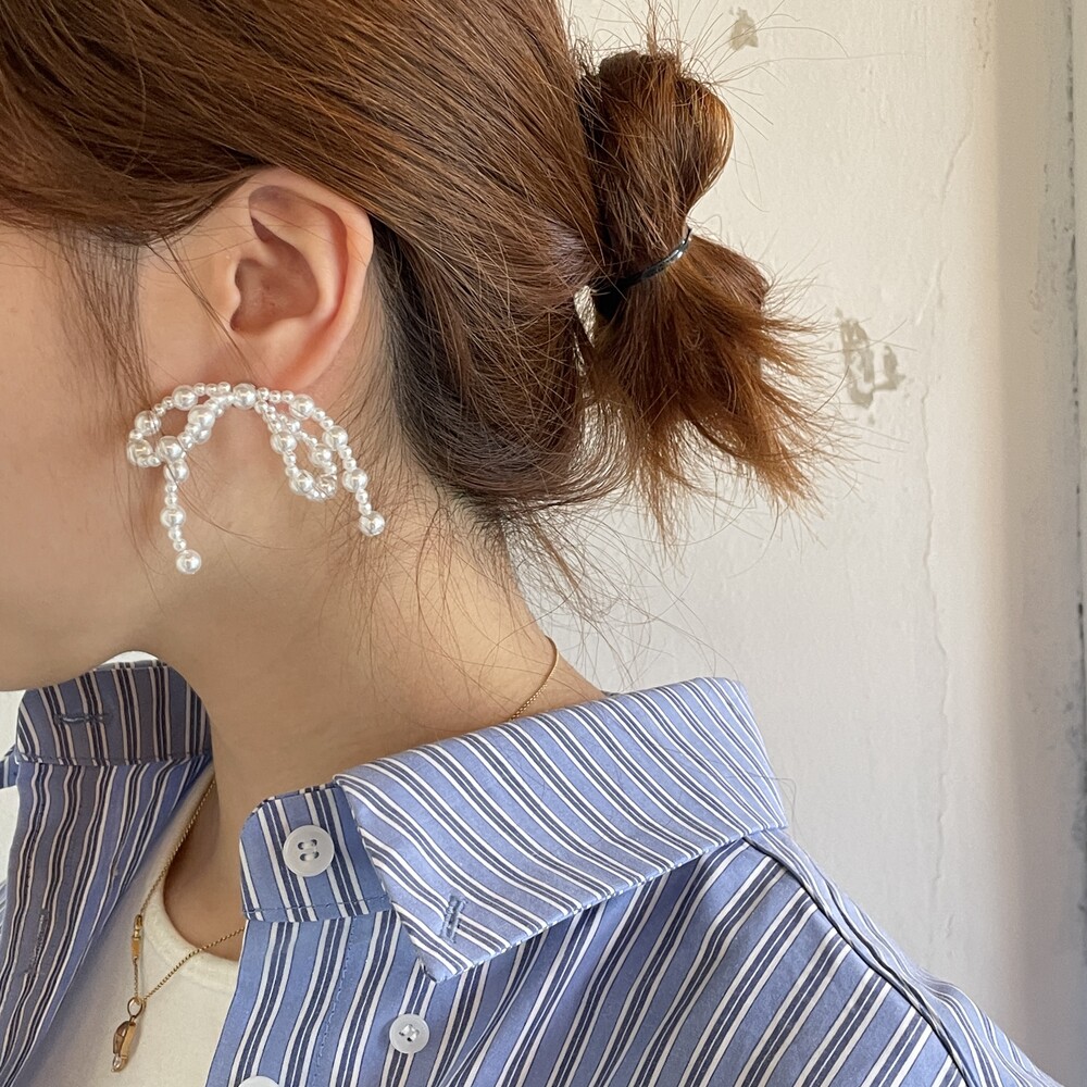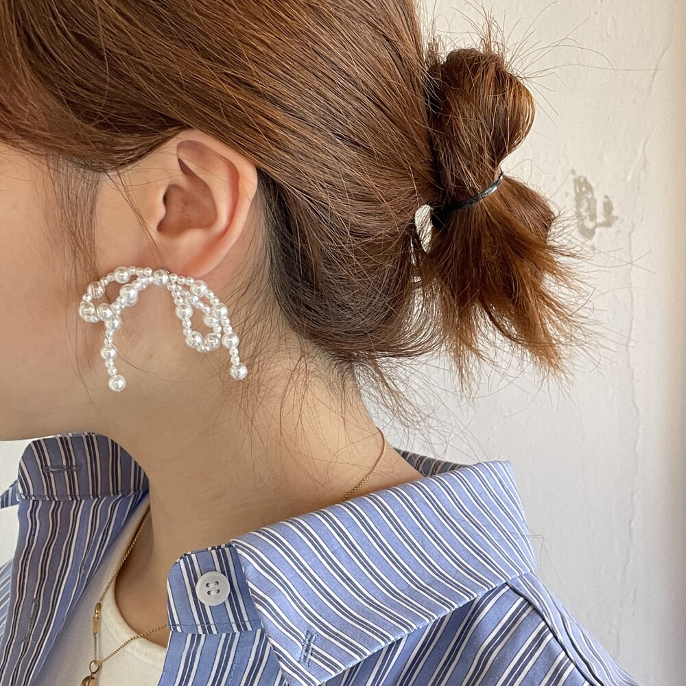 두가지 사이즈의 아크릴 진주로 엮어진 러블리한 리본 팬던트가 포인트인 Mia Earring 입니다.