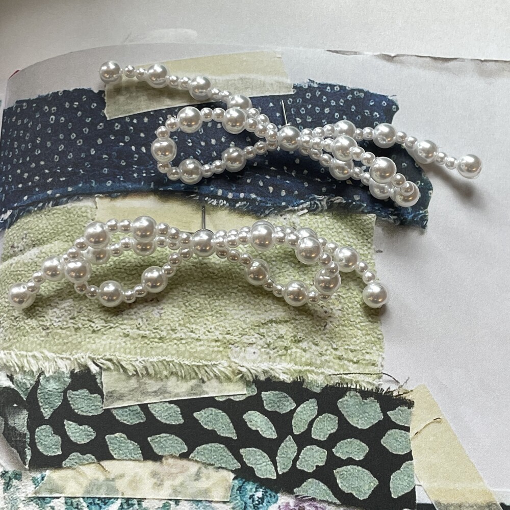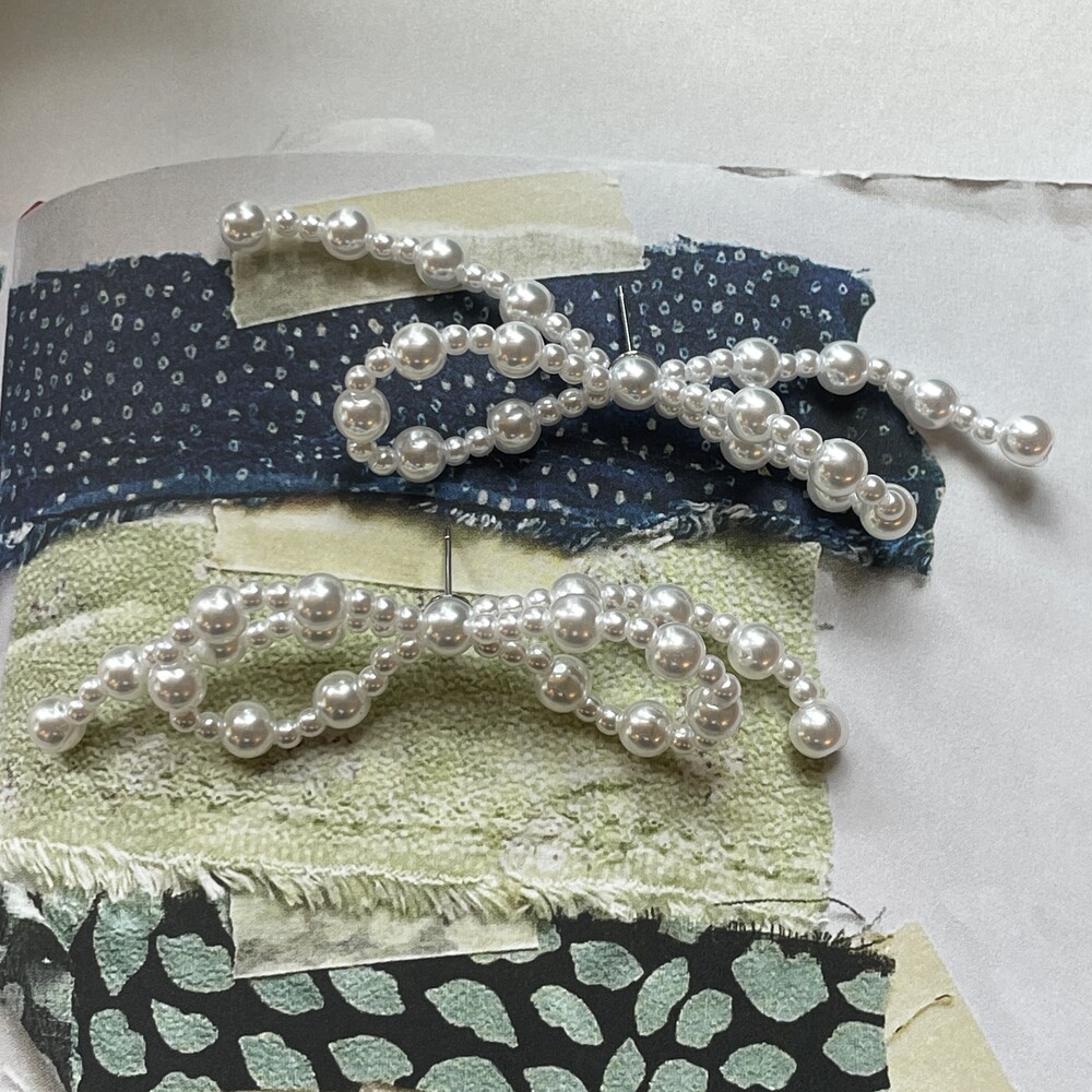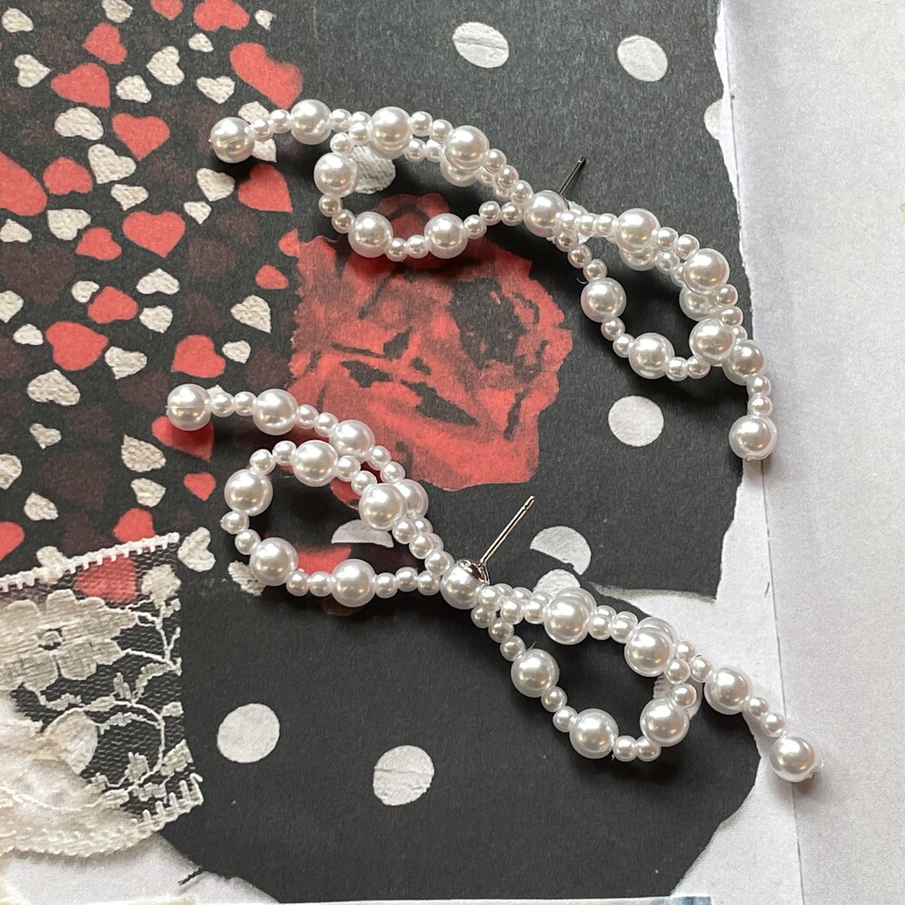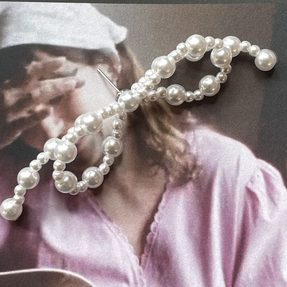 두가지 사이즈의 아크릴 진주로 엮어진 러블리한 리본 팬던트가 포인트인 Mia Earring 입니다.