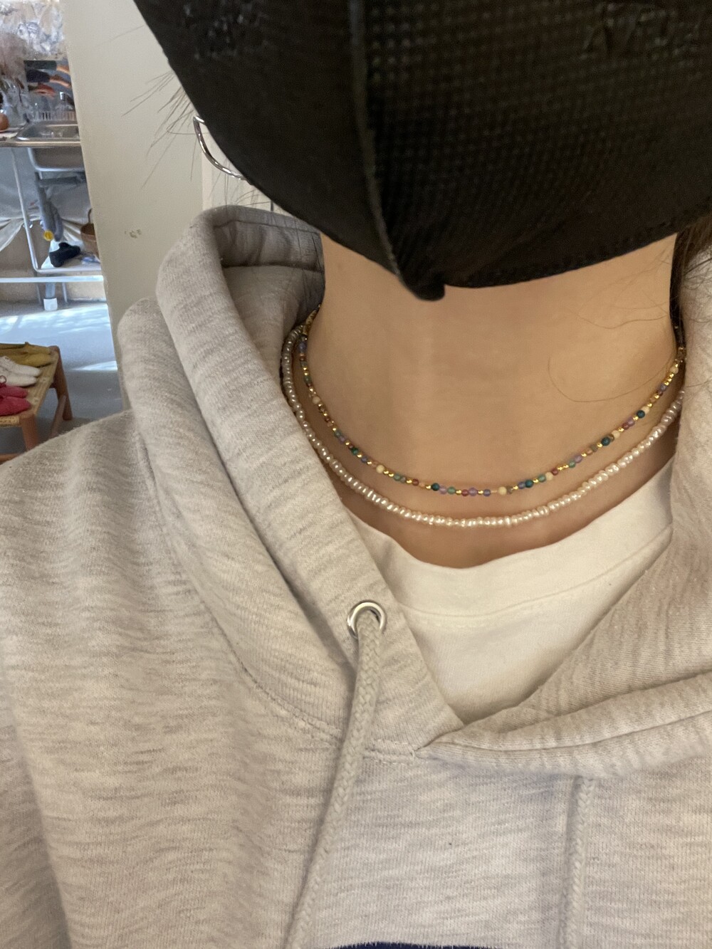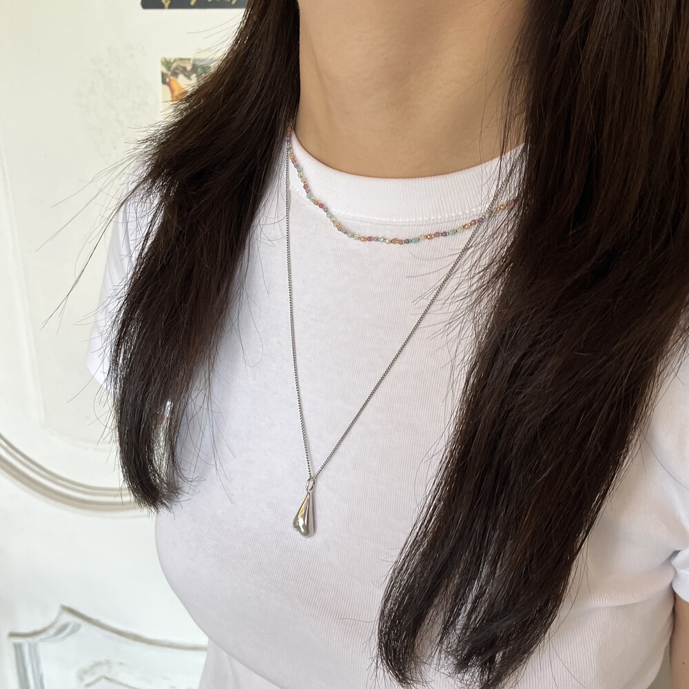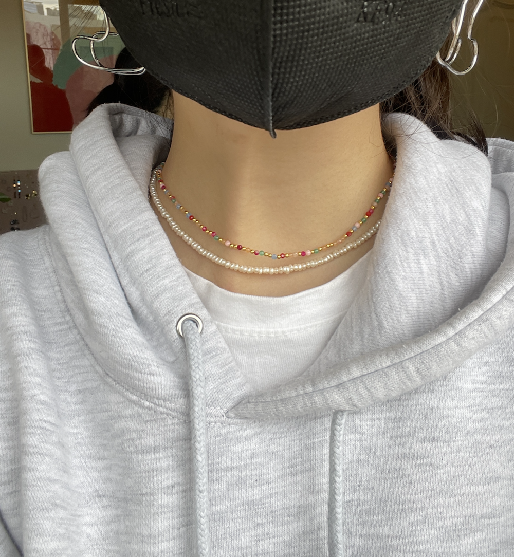 길이는 짧은 편으로 착용샷에서처럼 다른 목걸이와 레이어드 혹은 초커처럼 착용하시기 좋은 상품입니다.