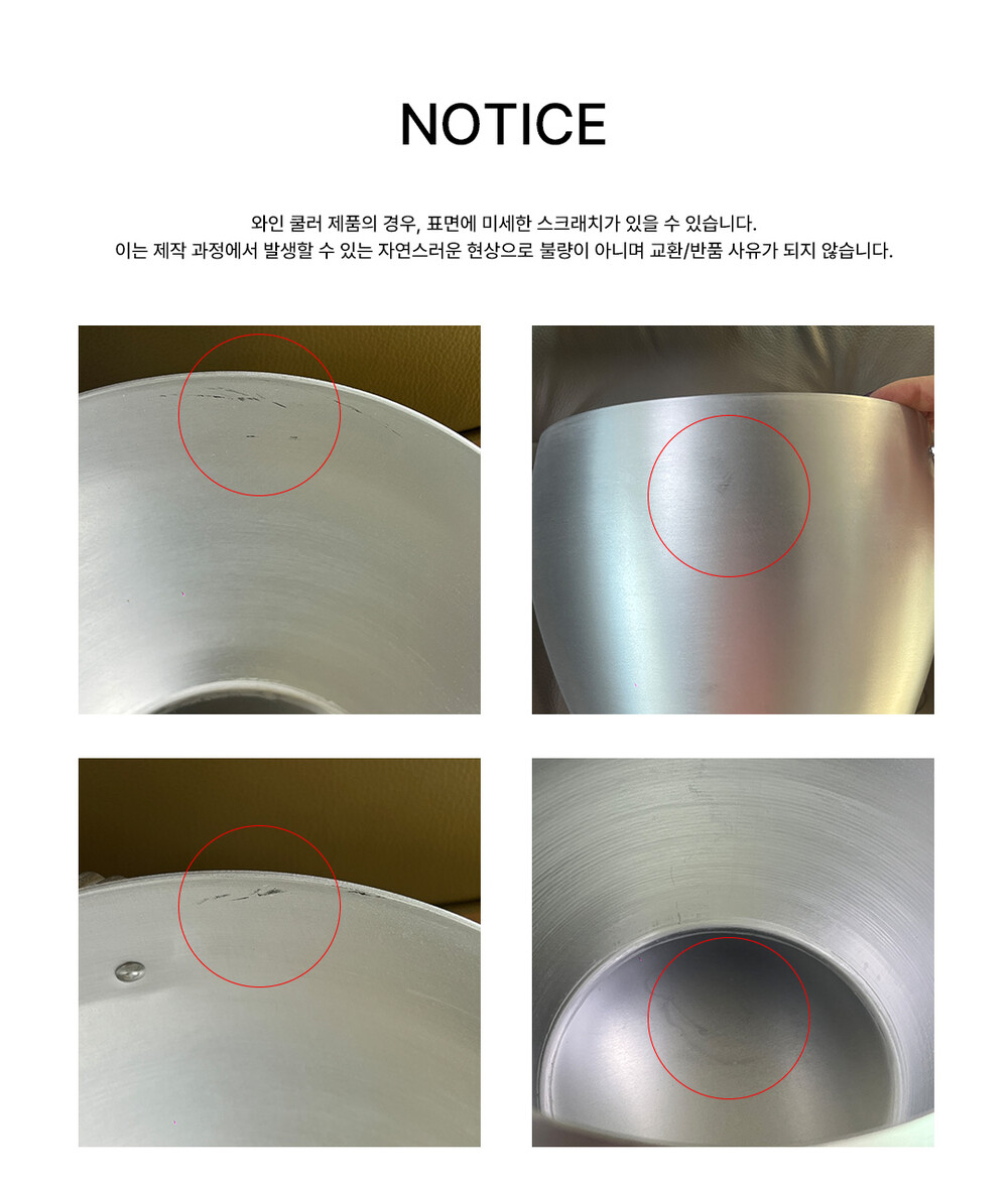 -알루미늄 소재 특성상 제품 내.외부에 전반적으로 잔 스크래치, 표면이 벗겨진듯한 유광 스크래치, 물이 흐른듯한 얼룩 자국, 검은 스크래치 등이 발생할 수 있습니다.