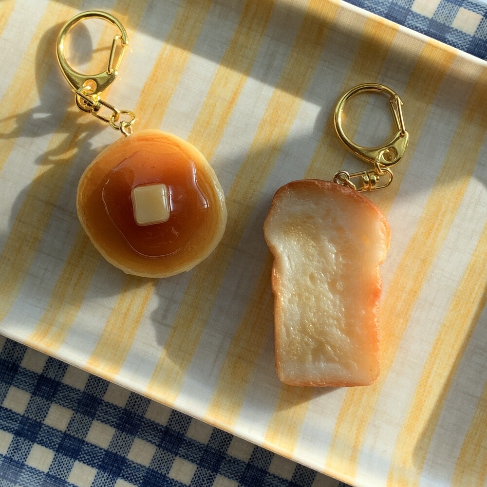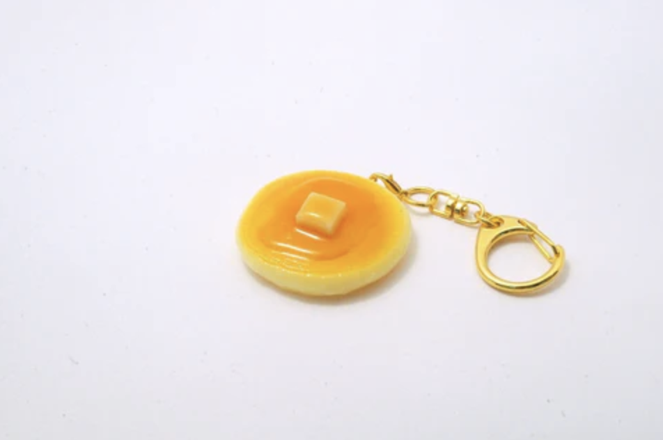 - 시럽이 뿌려진 팬케이크 위에 버터 조각이 올라간 키링으로 브런치 가게에서 판매하는 듯한 비주얼을 가지고 있습니다.