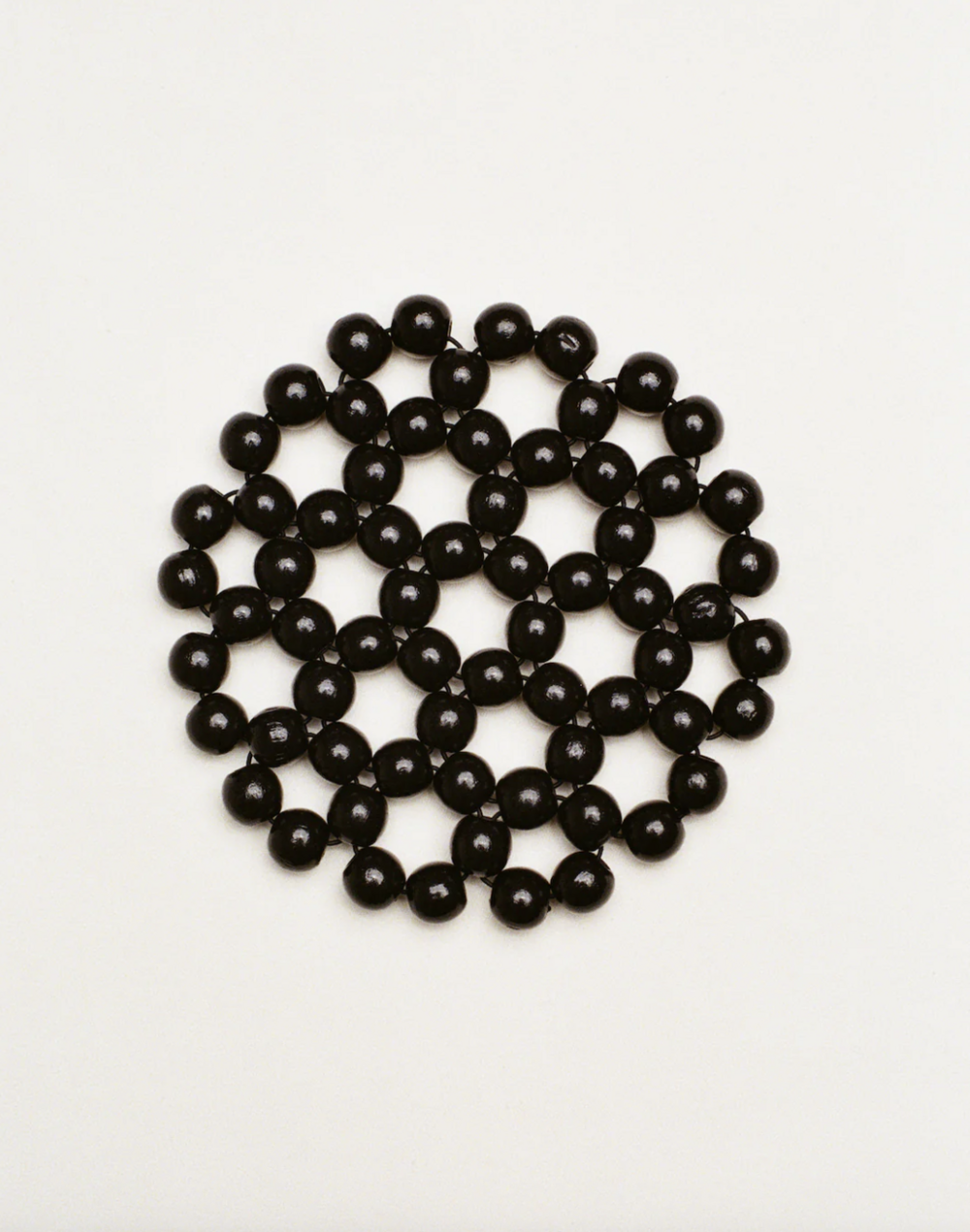 유광 마감 처리를 한 검정색 내추럴 우드 비즈를 엮은 코스터입니다.