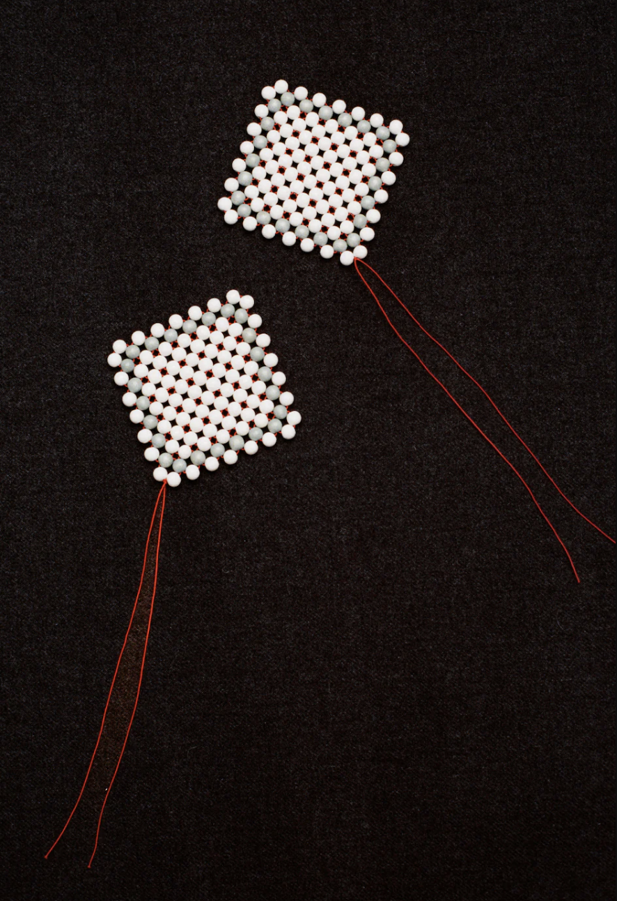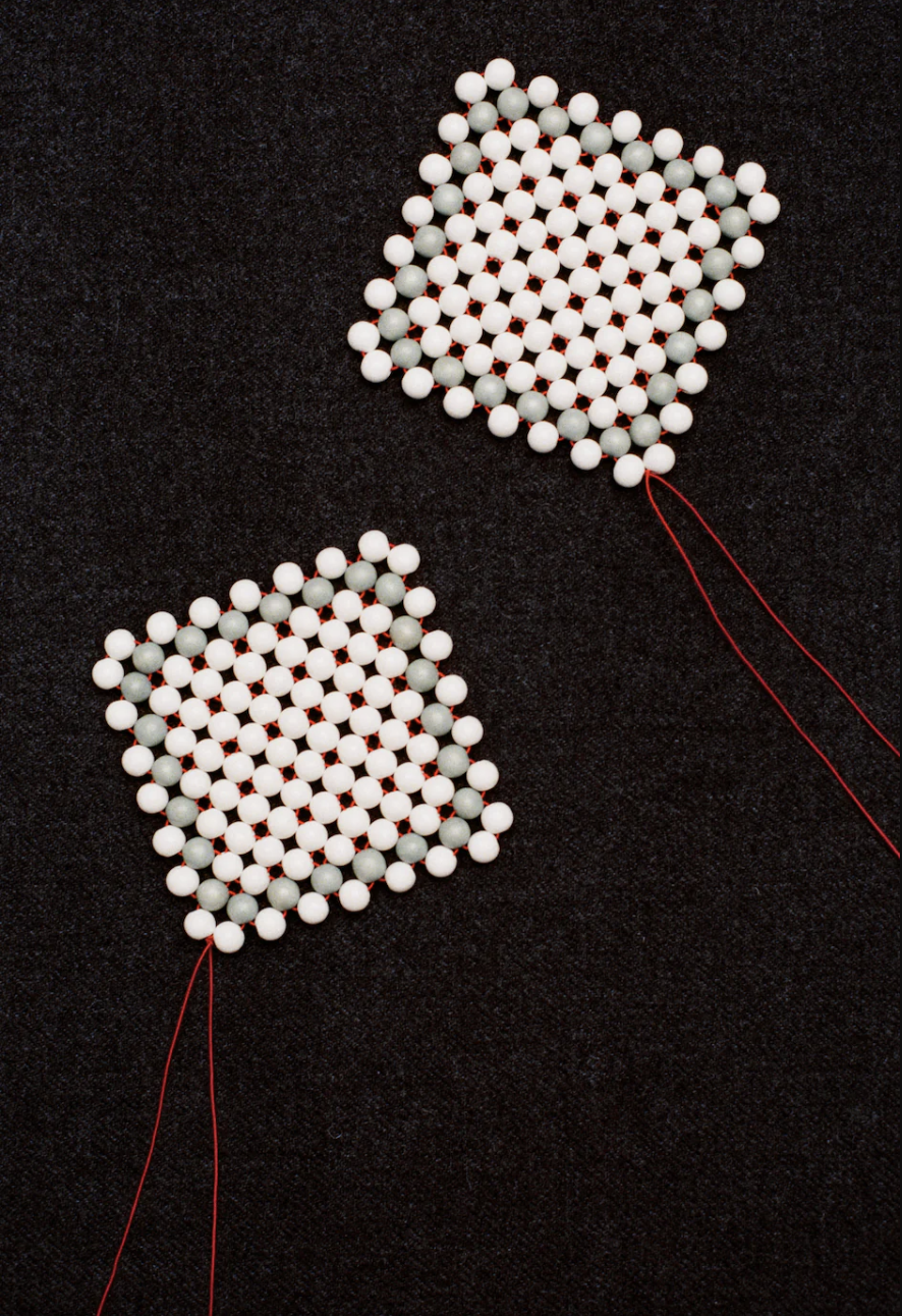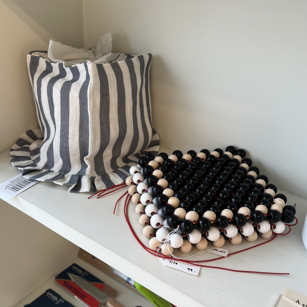 유광 마감 처리된 회색의 나무 비즈와 백색의 나무 비즈를 빨간색의 포인트 실로 엮은 Wooden beads coaster 입니다.