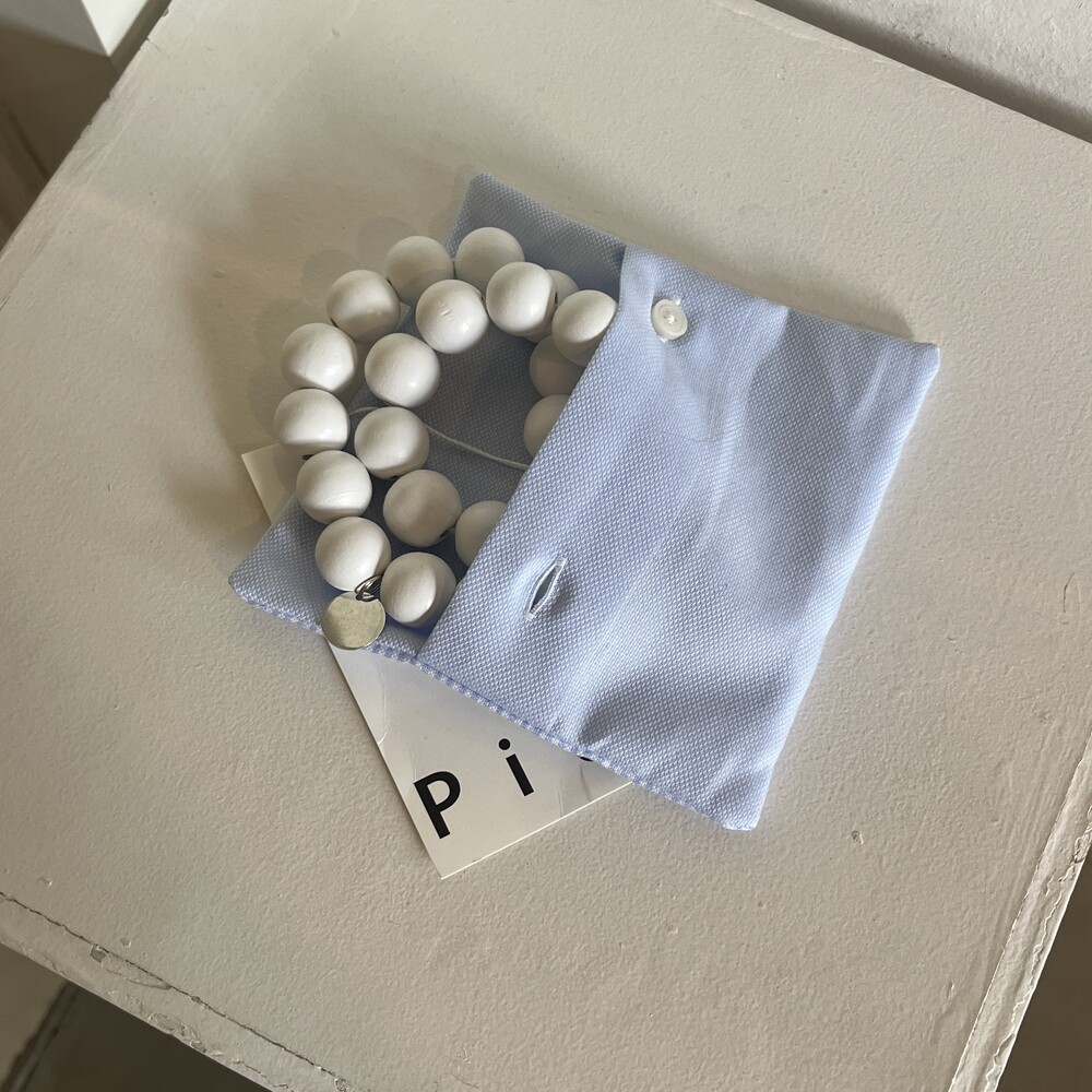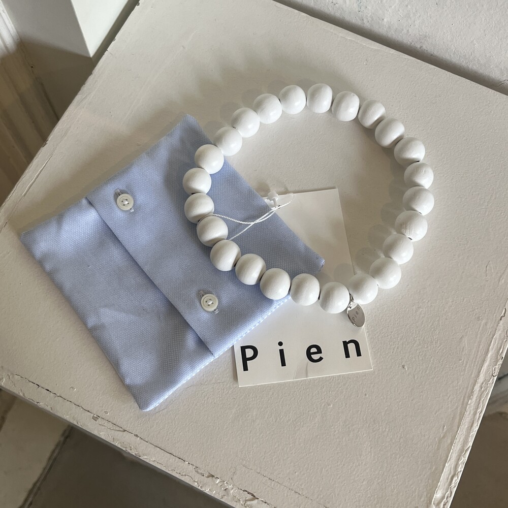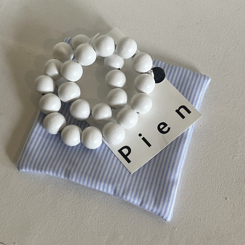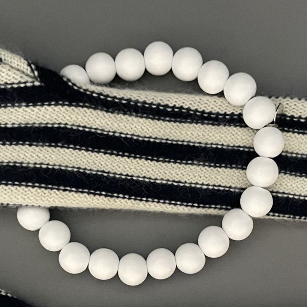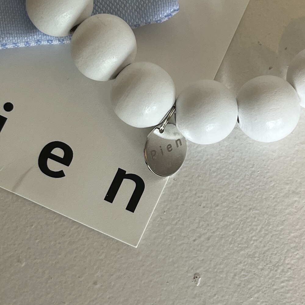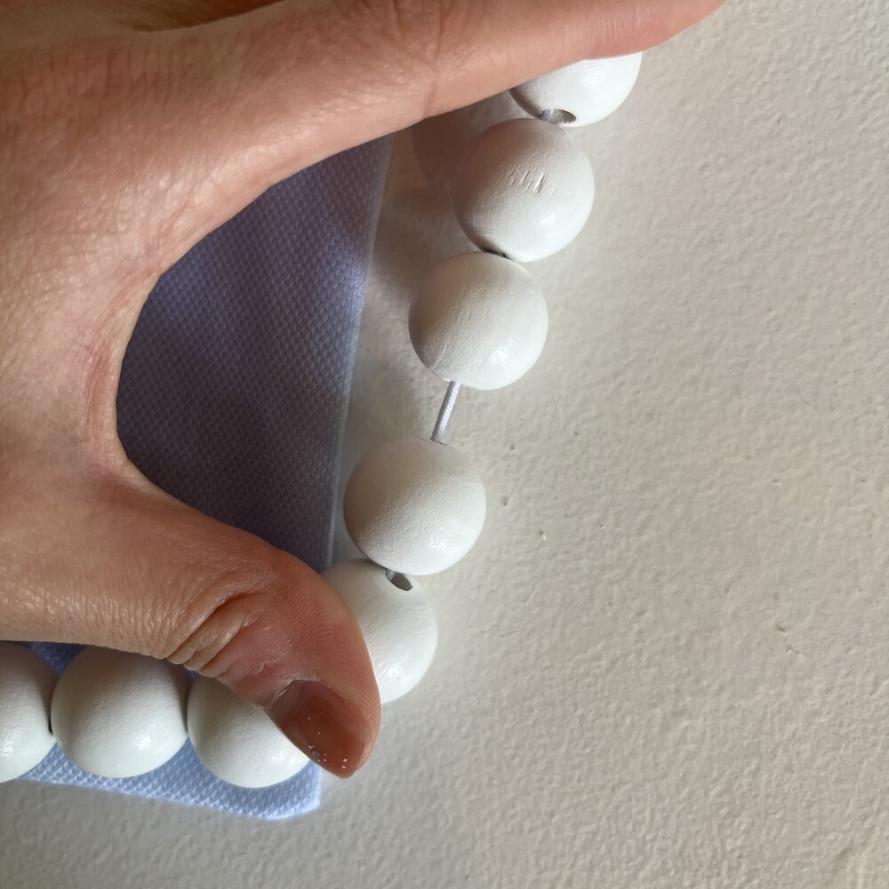white wooden beads with elastic cord.