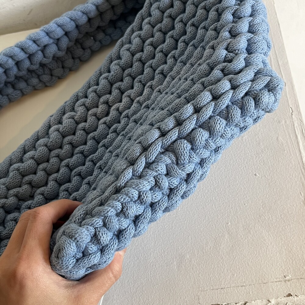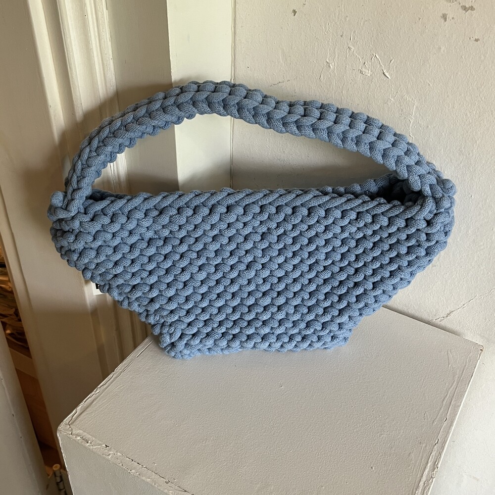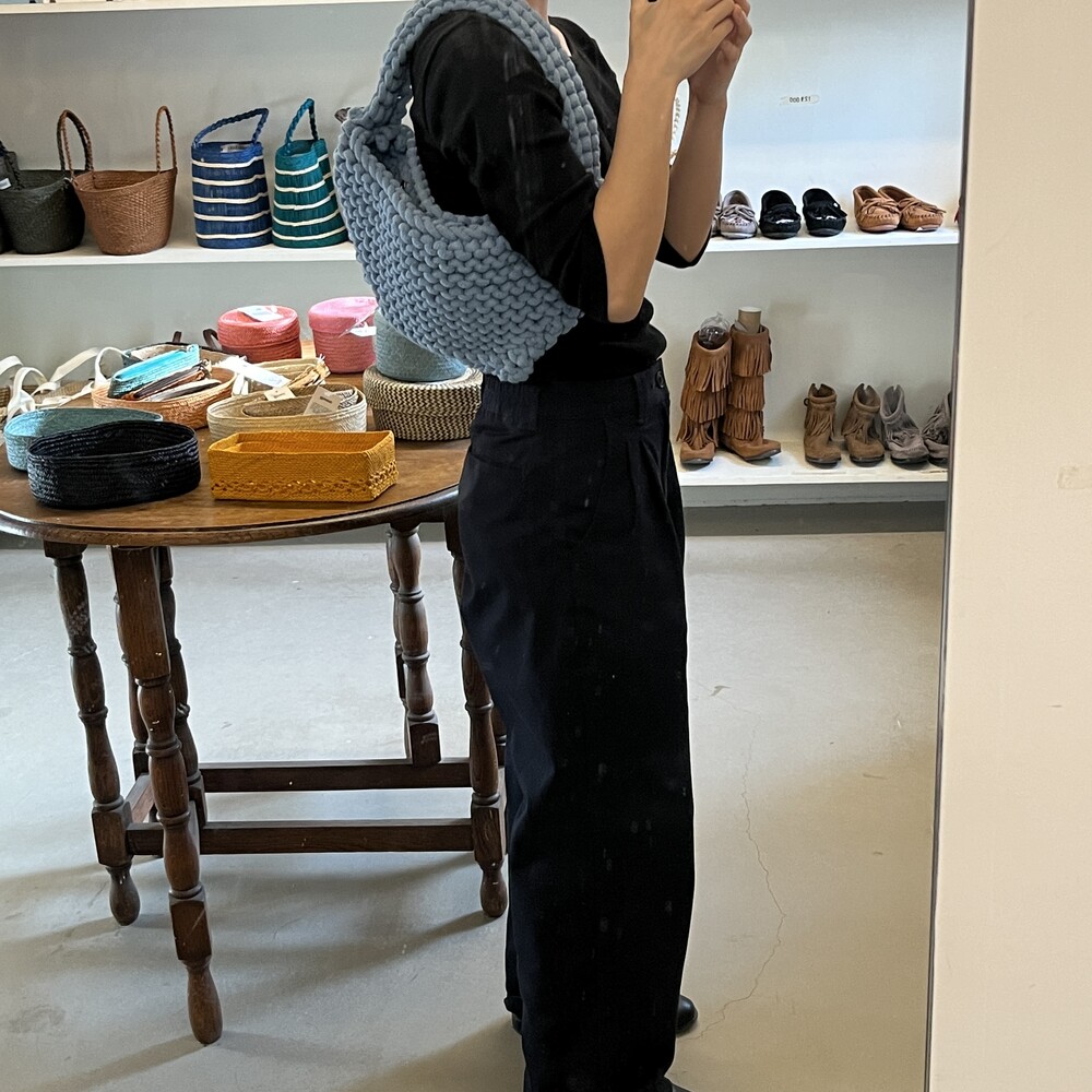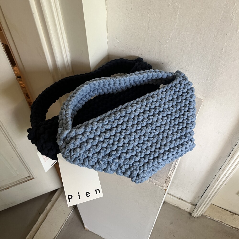 재활용된 코튼으로 만들어진 니팅 가방입니다. 넉넉한 크기로 제작되어 여러 소지품을 편하게 넣고 다니기 좋습니다. 탄탄하고 촘촘한 조직감을 가지고 있어, 물건이 빠질 위험은 없습니다.