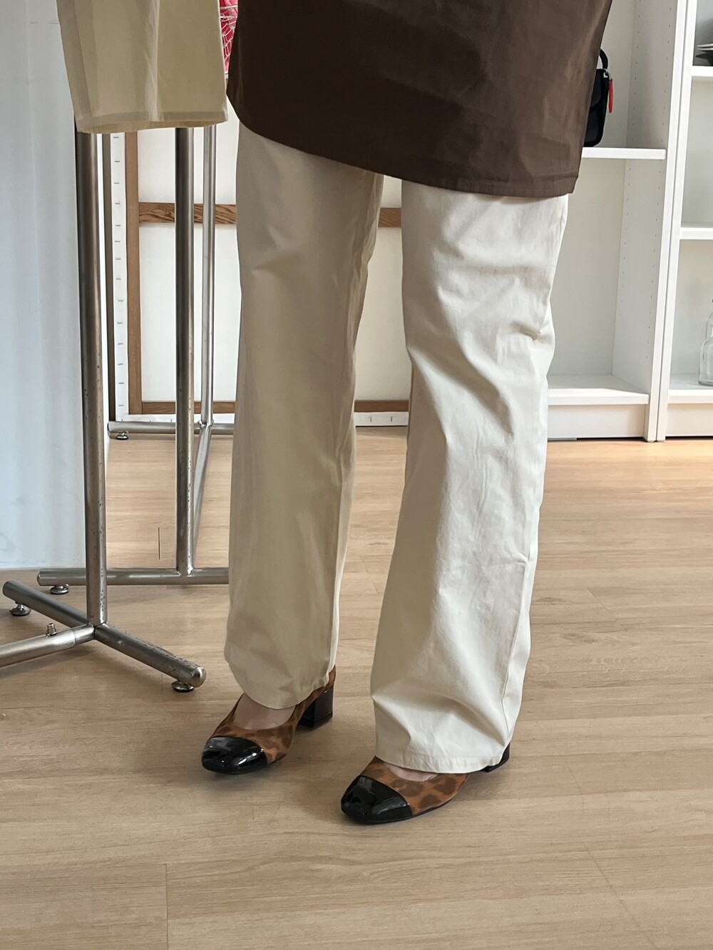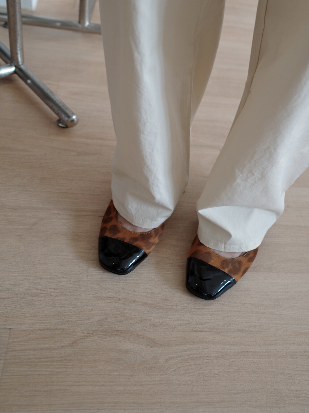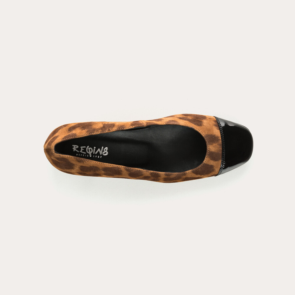 트렌디한 레오파드 패턴의 스웨이드 소재로 제작된 클래식 미들힐 모델입니다.