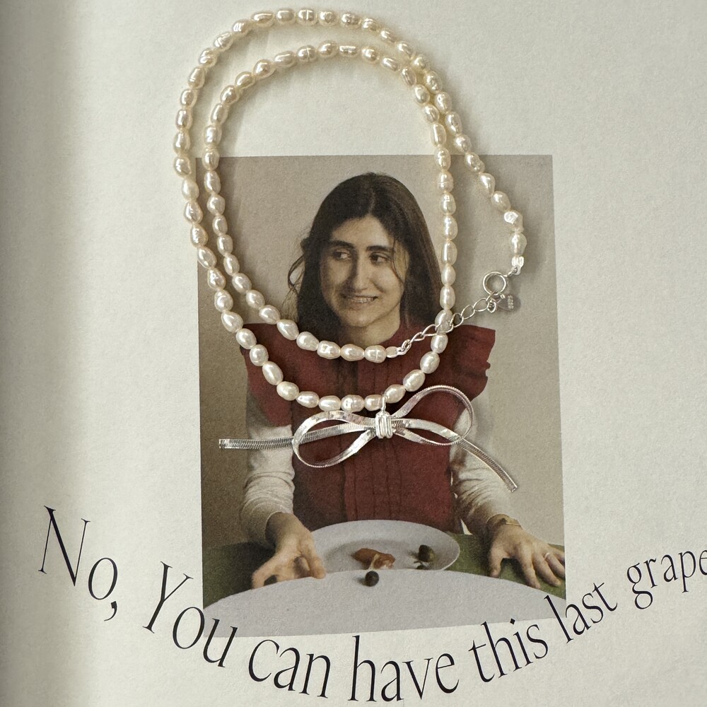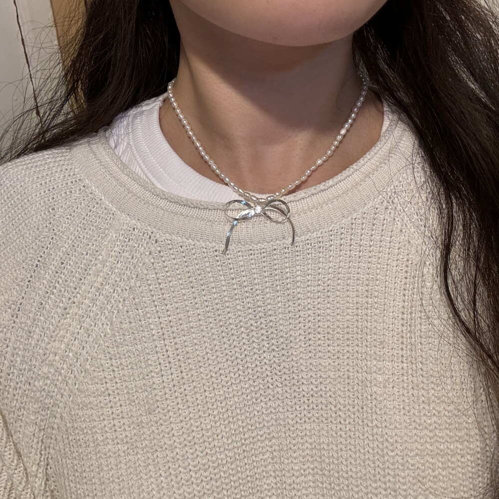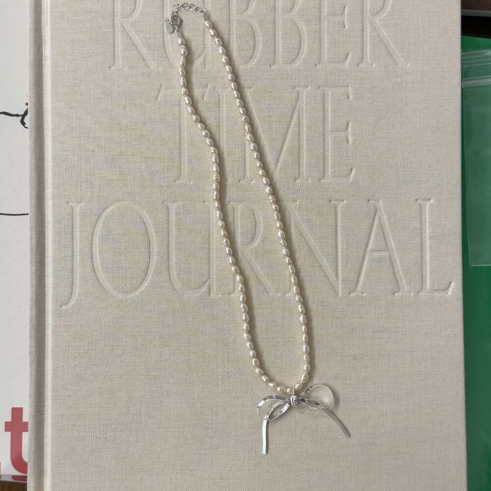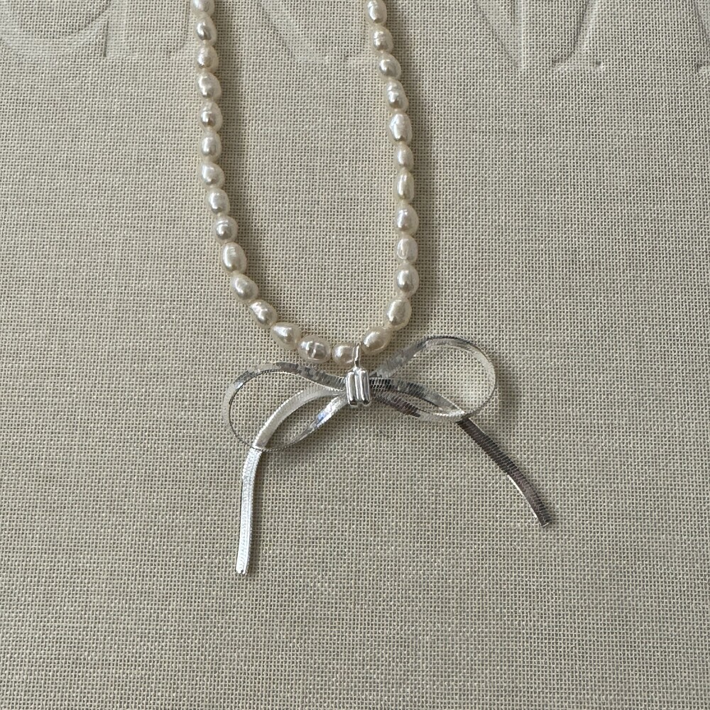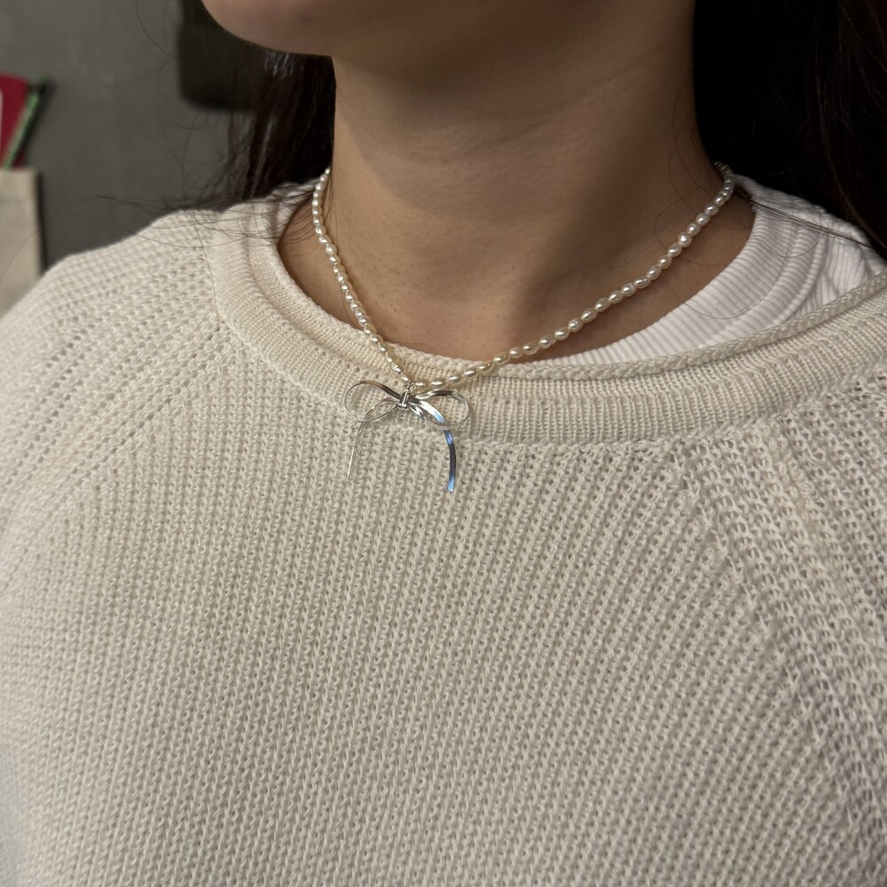 아담한 크기의 진주 네크리스에 실버 리본이 포인트가 되는 제품을 소개해드립니다.