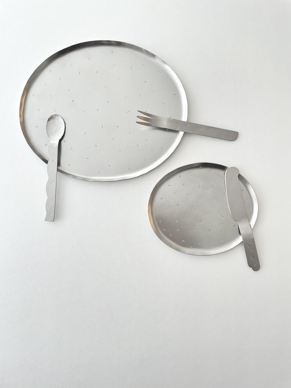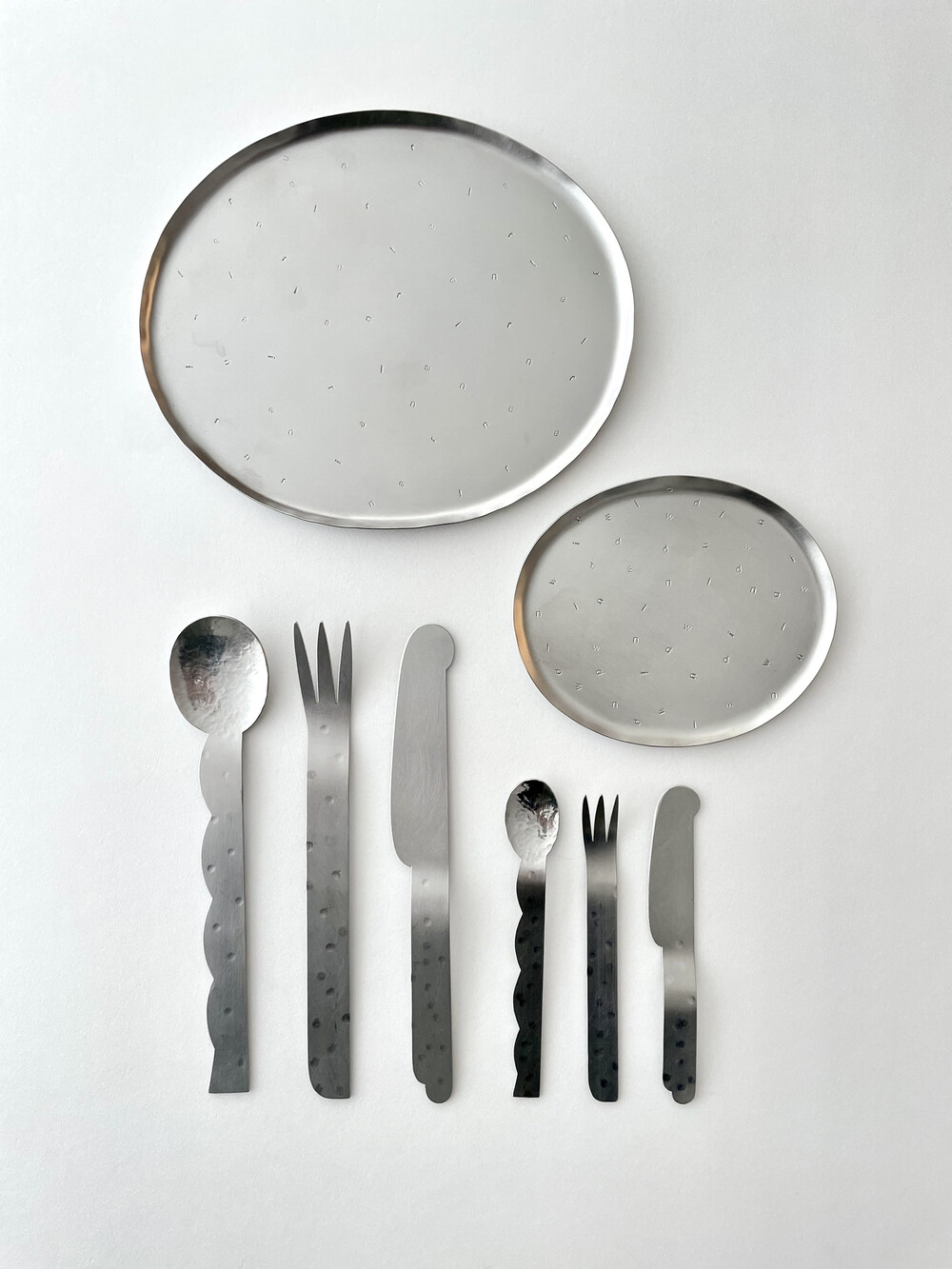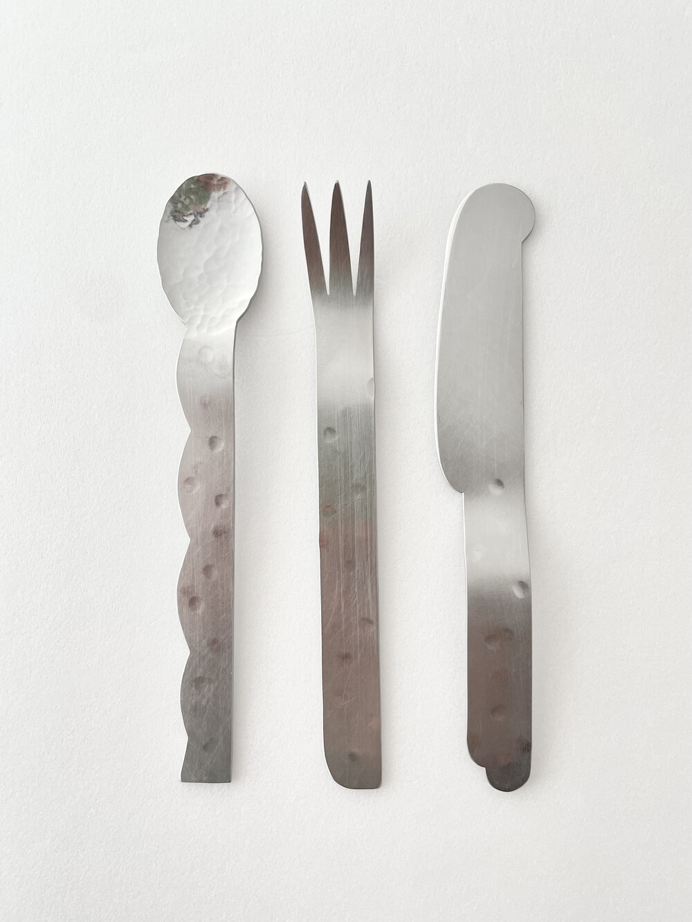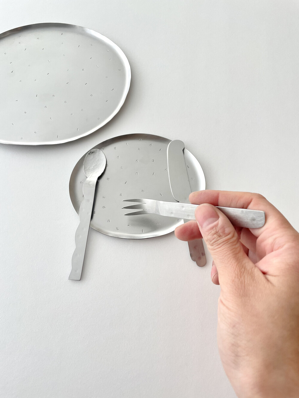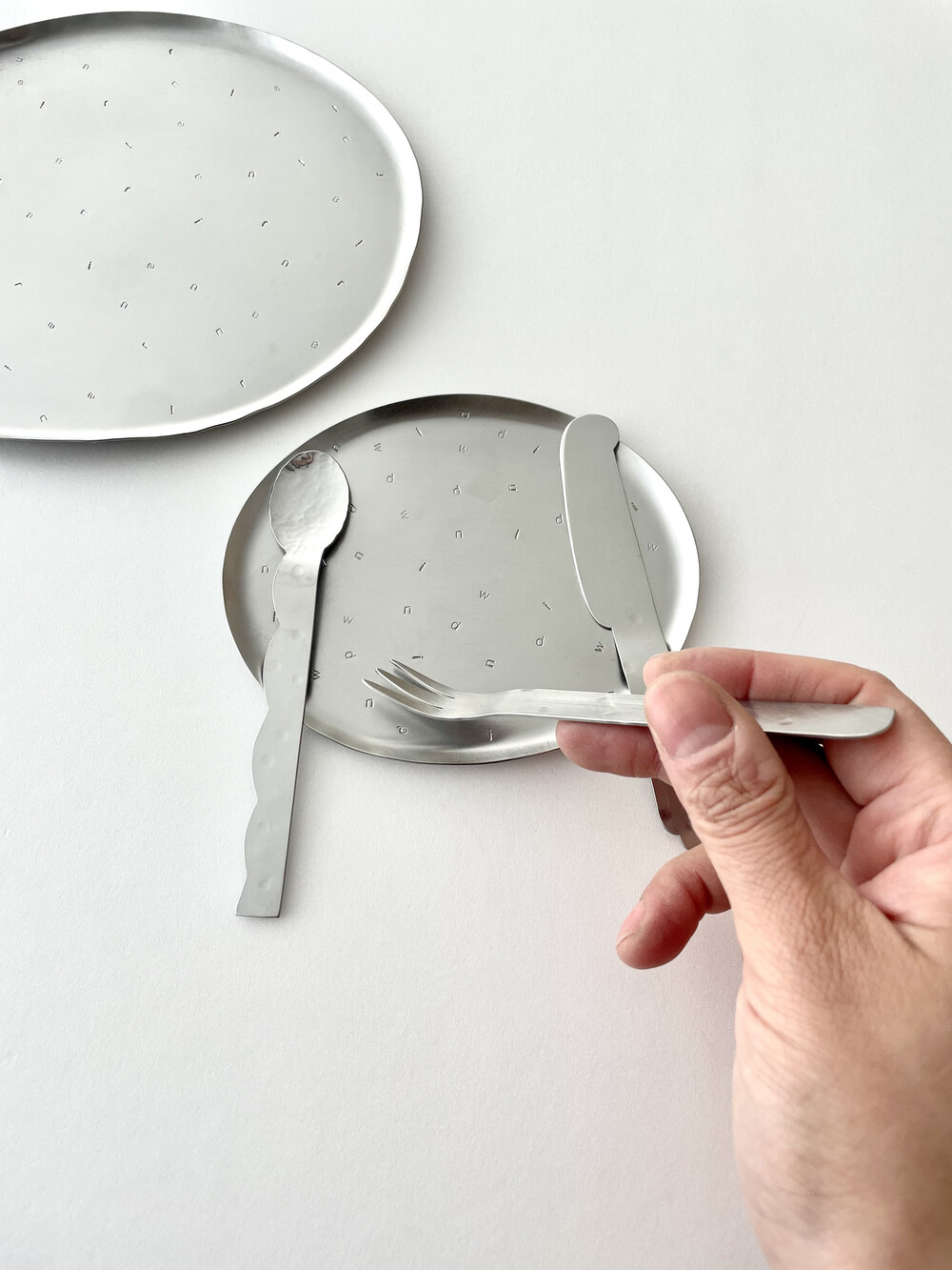 눈이 쌓인 나뭇가지 포크, 따스한 버선을 닮은 나이프입니다. 모든 커트러리에 망치 텍스쳐가 눈처럼 내려있습니다.