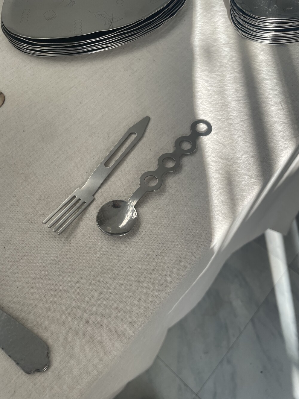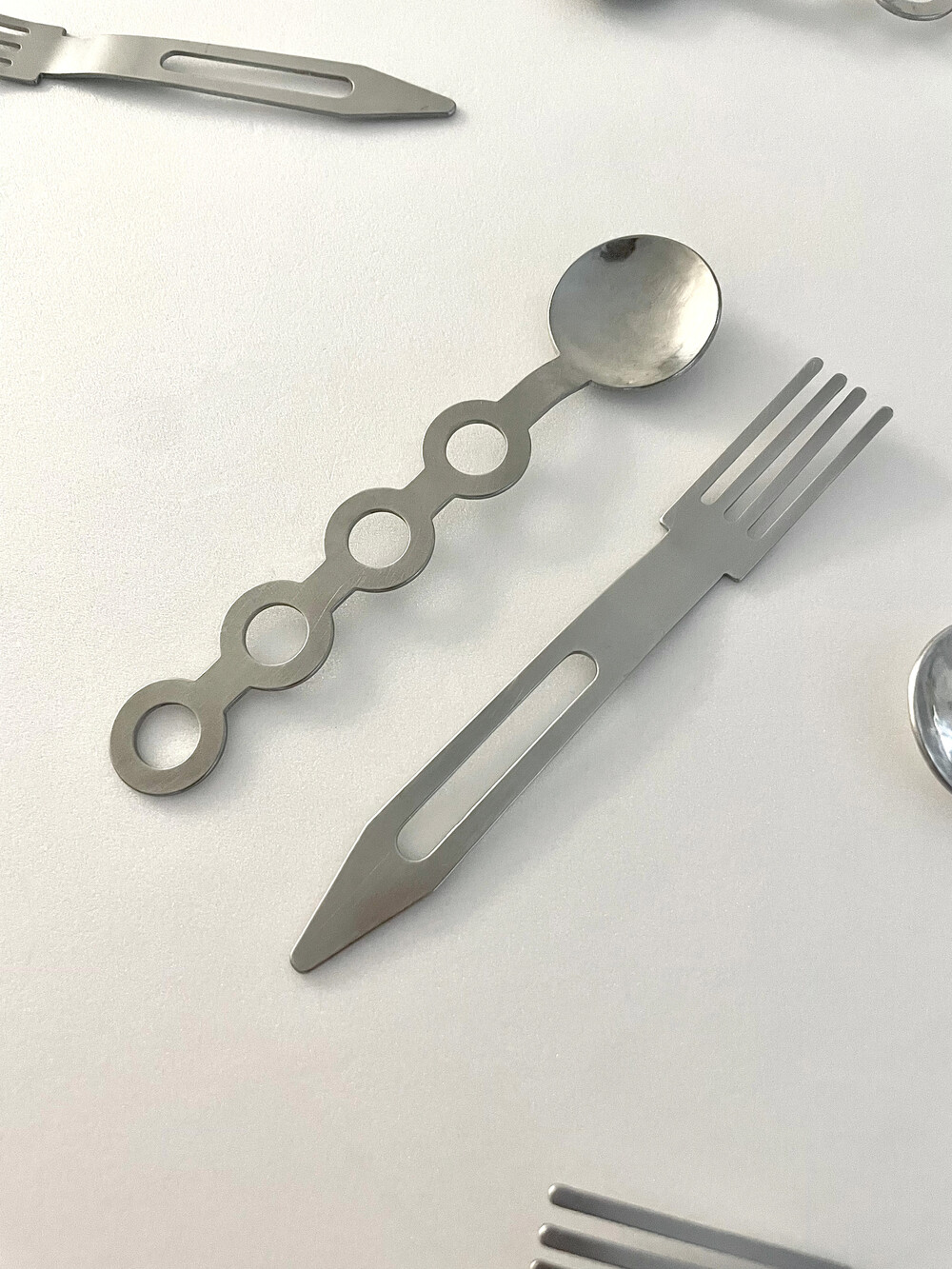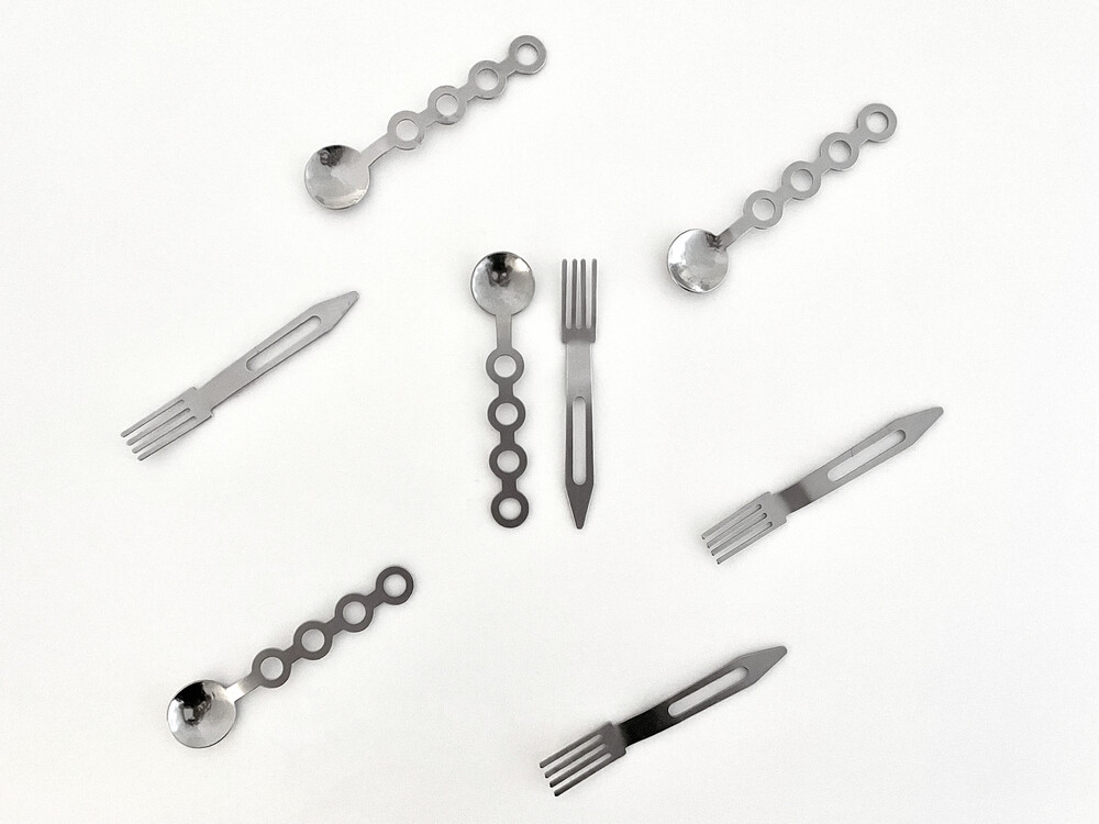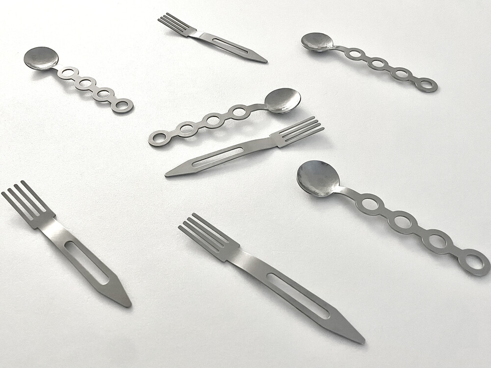 포크는 우주선의 이미지를 단순화 시켰습니다.커트러리는 디저트의 용도에 맞게 작은 크기를 지니고 있습니다.