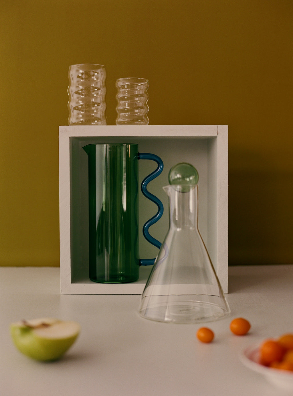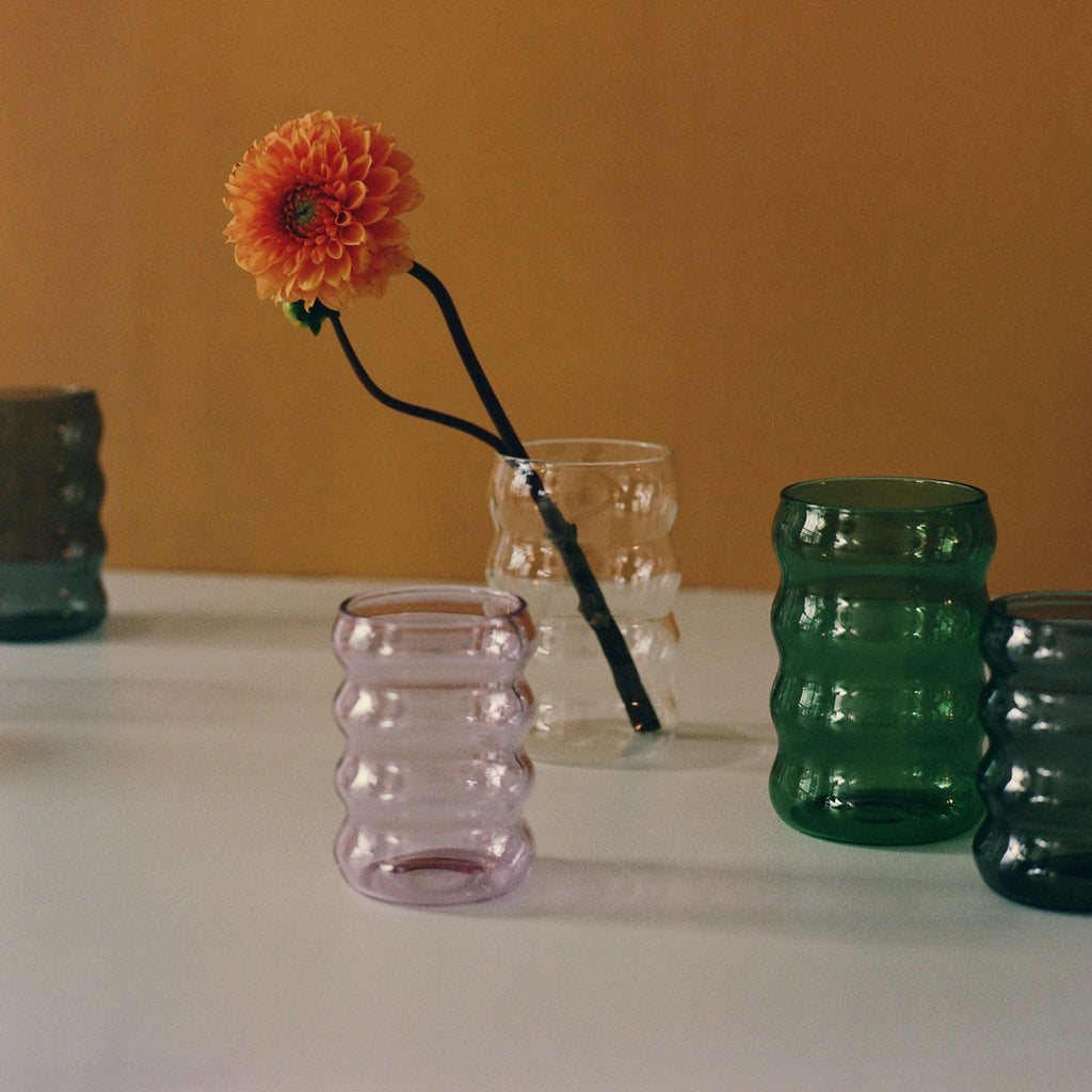 시그니처 물결무늬 붕규산 유리 컵입니다. 작은 꽃병처럼 귀엽기도 한 리플 컵은 와인, 증류주, 칵테일, 생수 등