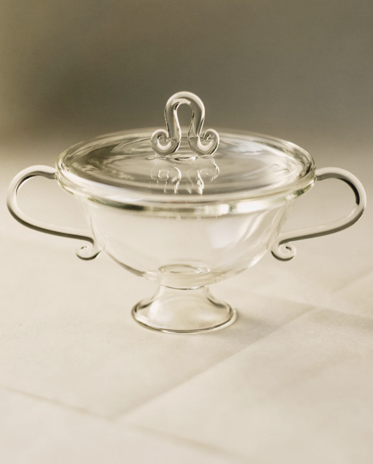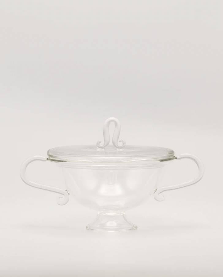 섬세하면서도 튼튼한 손잡이 두 개와 뚜껑 중앙에 유리 띠 장식이 특징입니다.