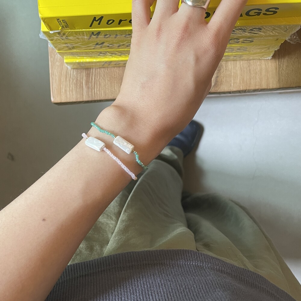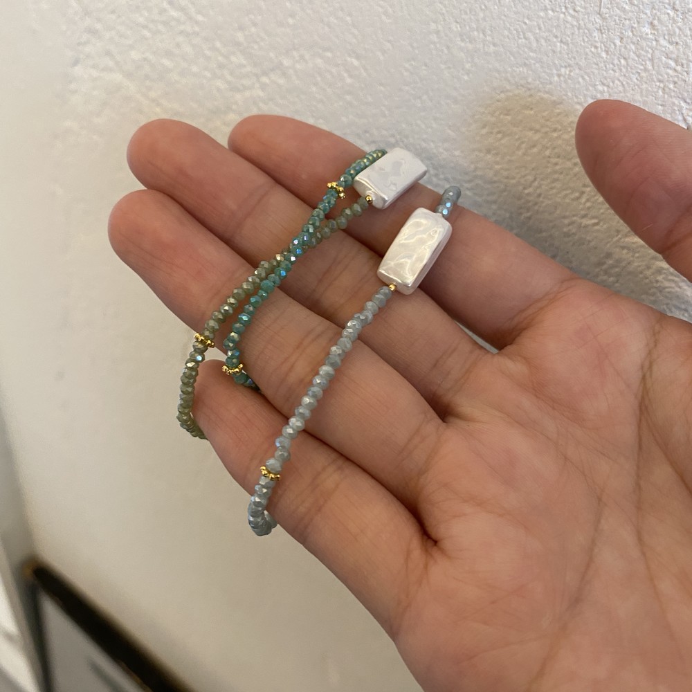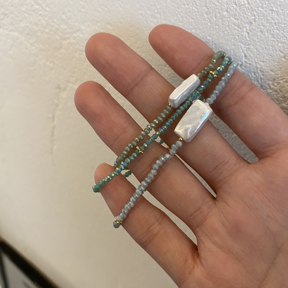 요 제품은 원석은 아니구 비즈로 이루어져있고 진짜 진주로 만든 네모 모양의 포인트가 있어요.