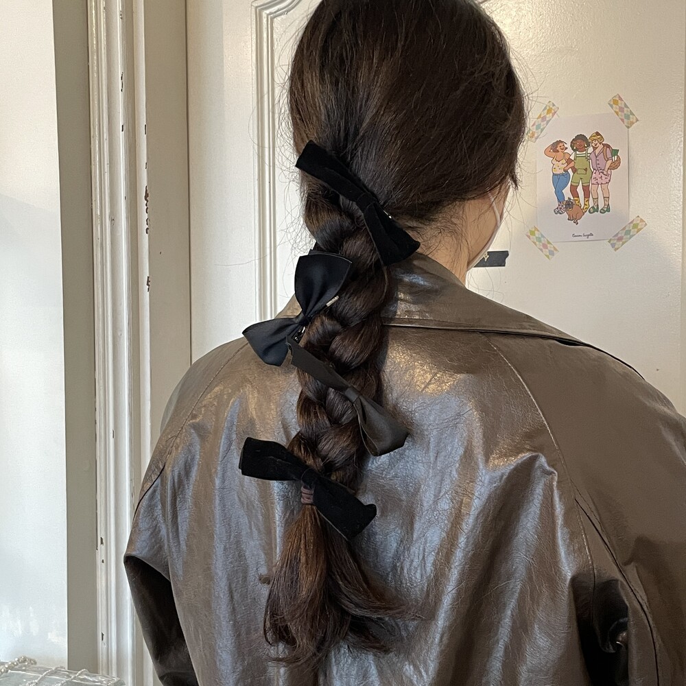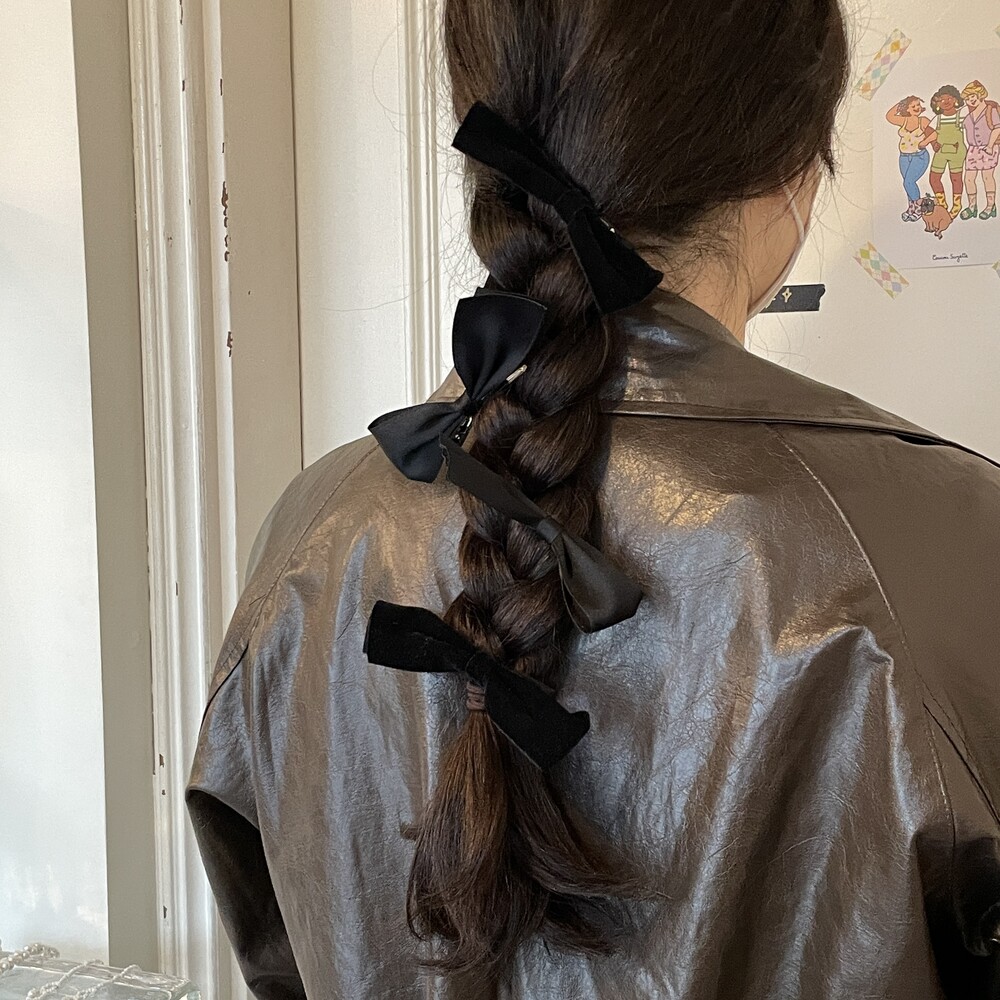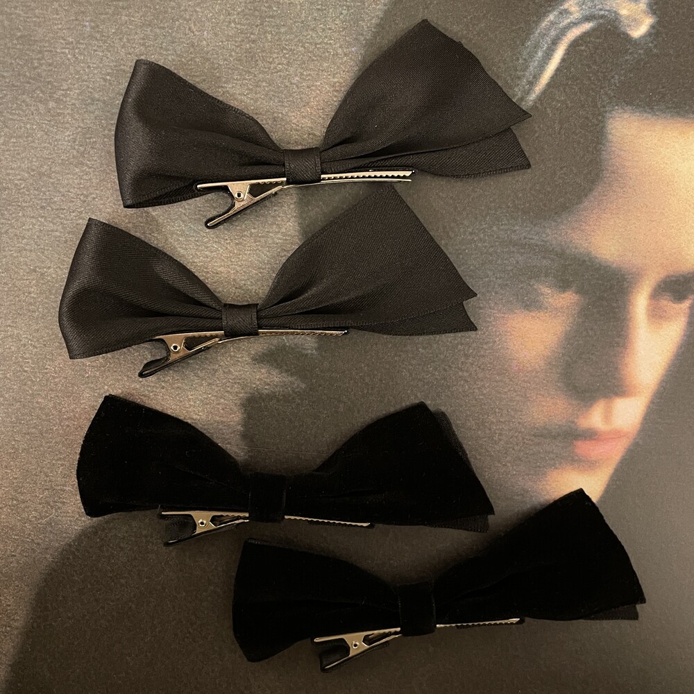 두개의 리본핀이 한 세트인 제품이며 양옆으로 착용하는 것을 추천드립니다.