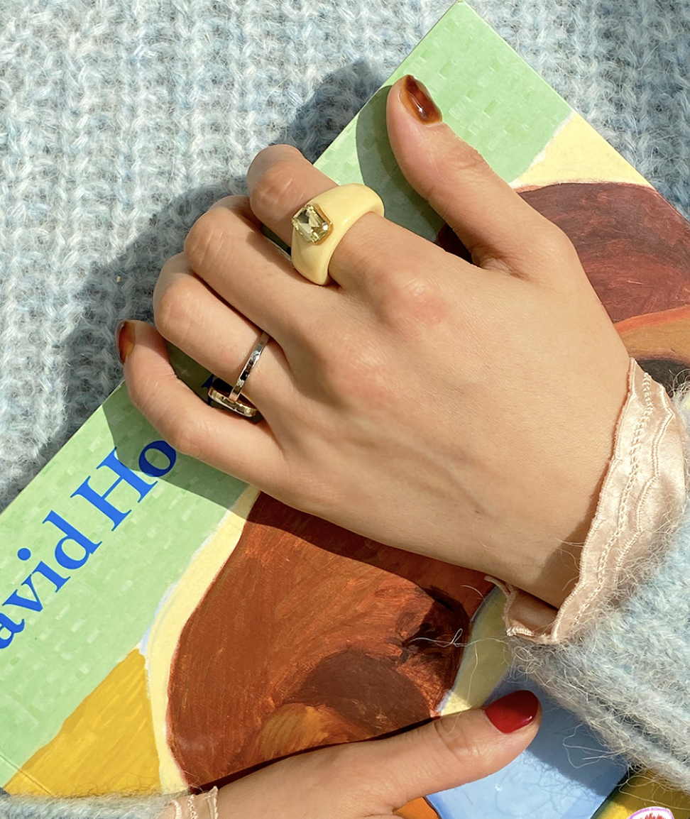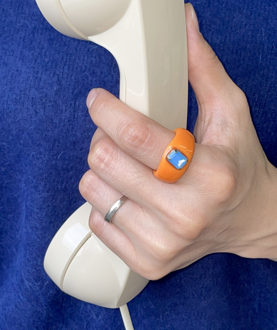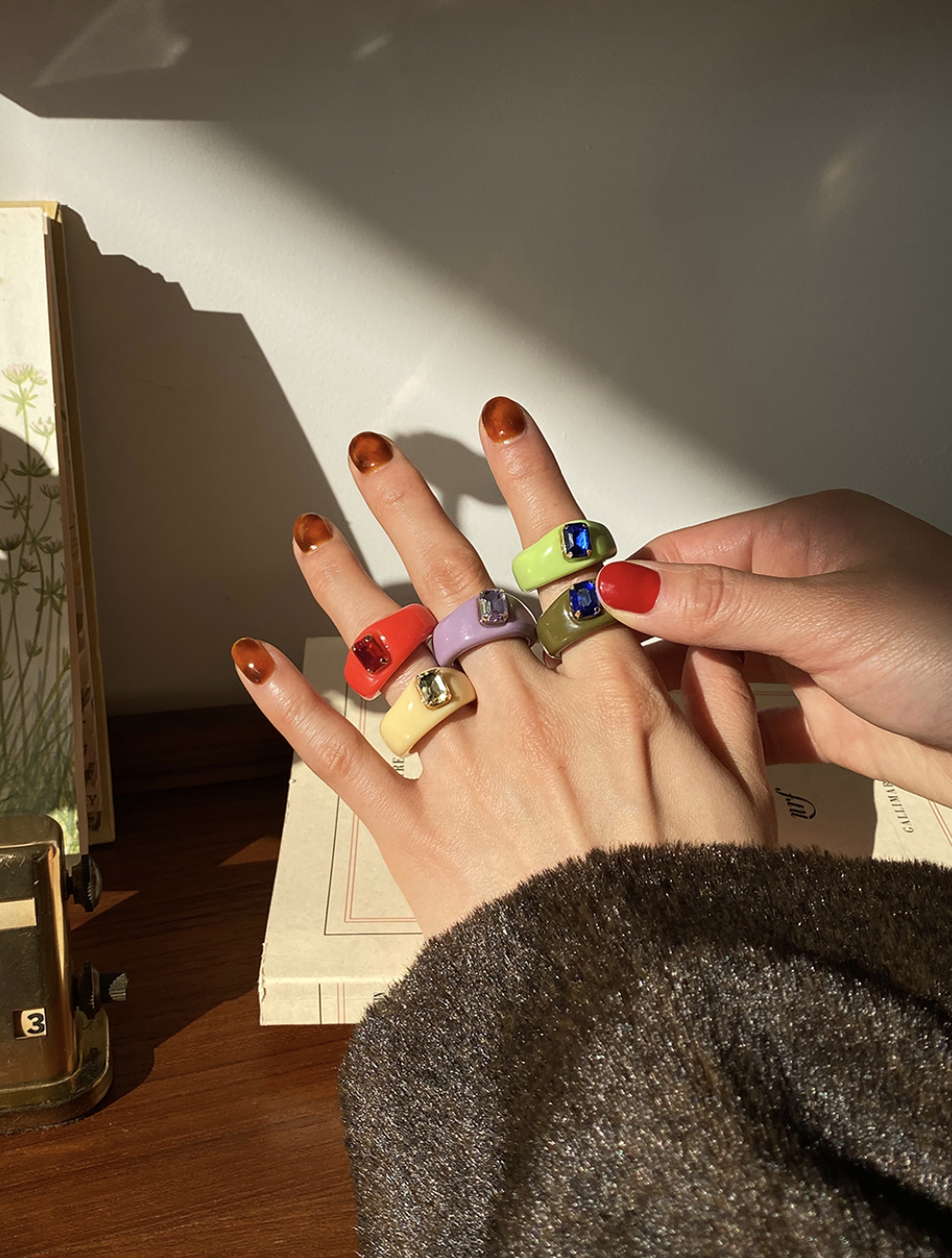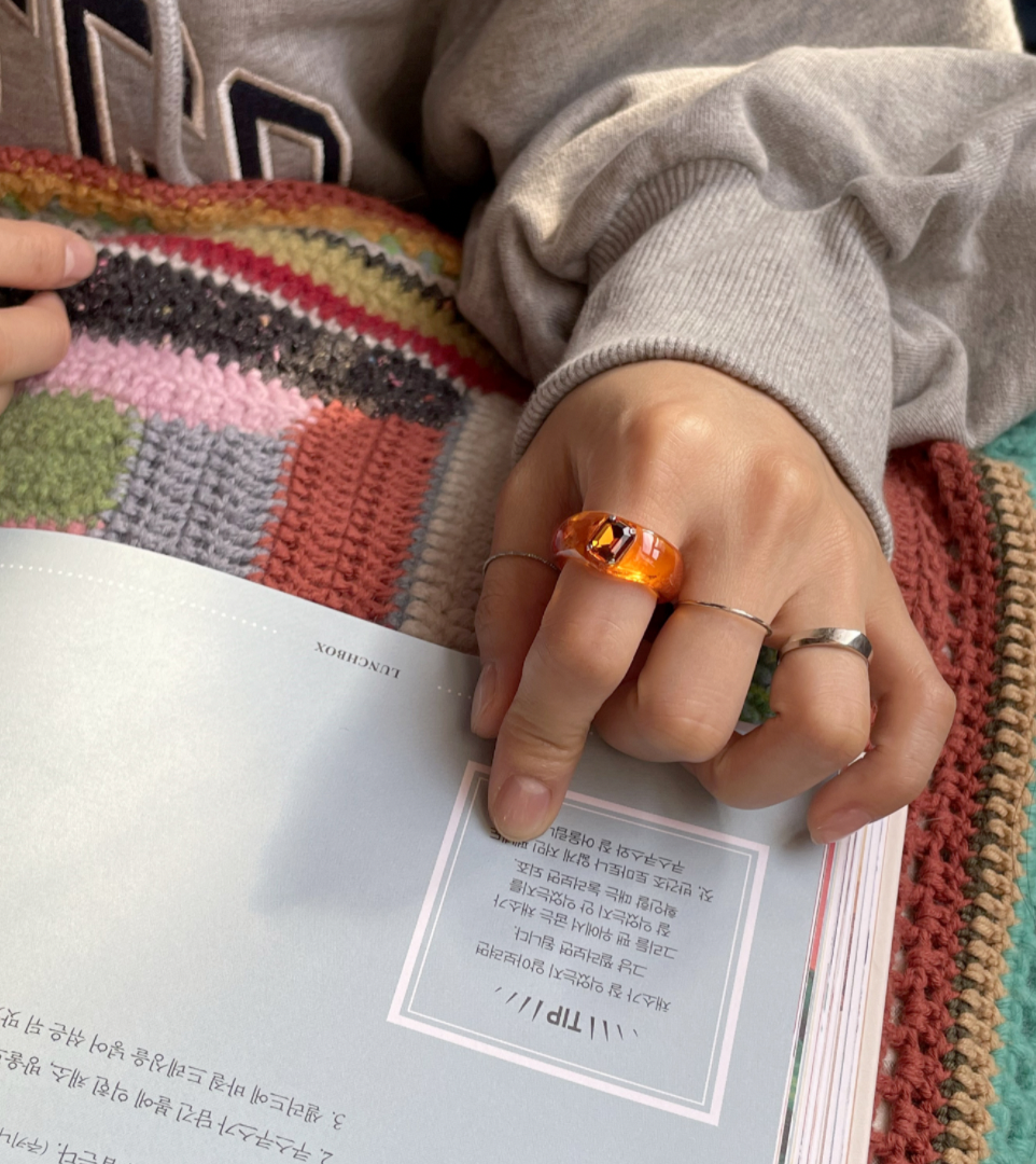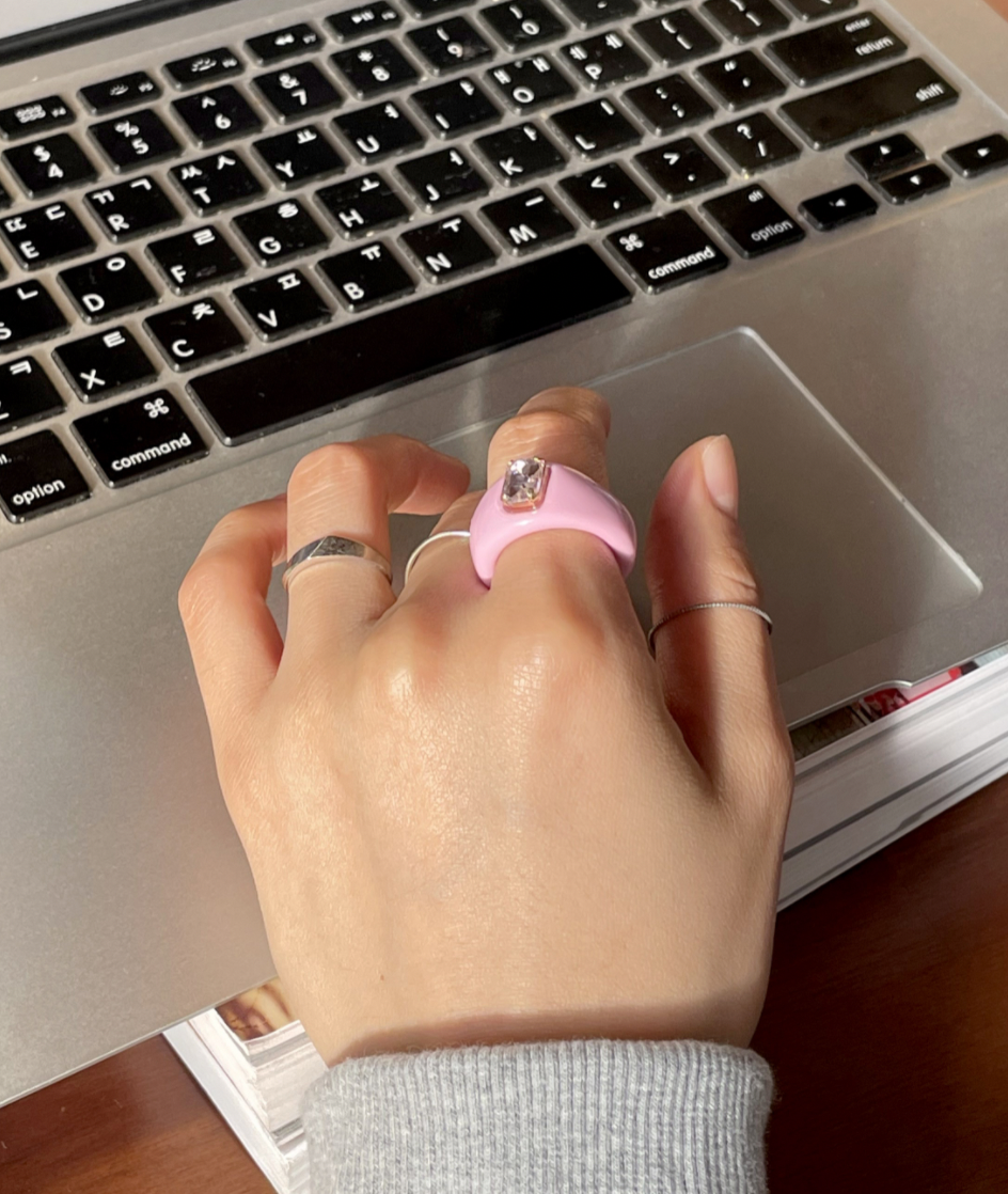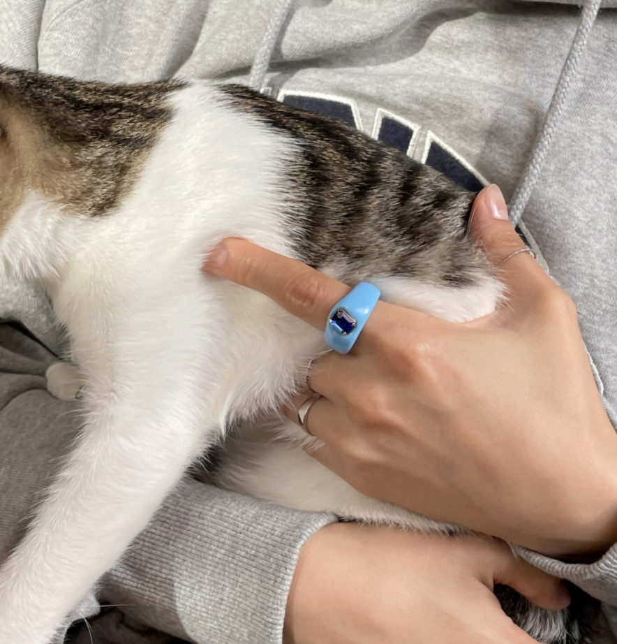 영리영리의 커스텀 주얼리 라인에서는 가벼운 소재로 몸을 편안하게 하면서도 키치한 디자인으로 자유롭게 자신을 표현할 수 있습니다. 직사각 스톤이 비스듬히 세팅되어 있는 토푸링은 도시적인 무드를 자아냅니다.