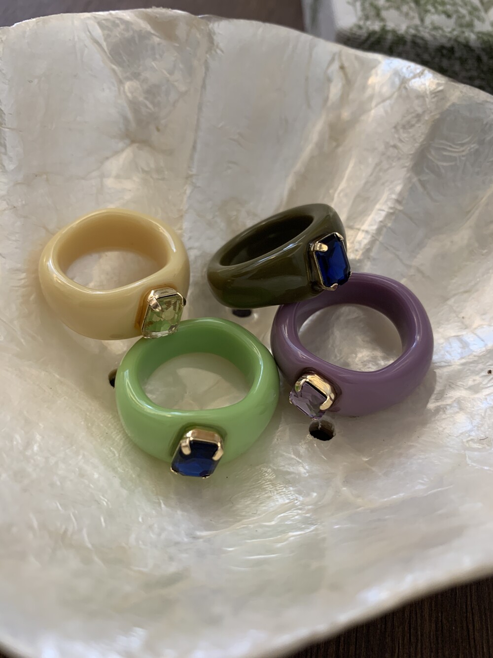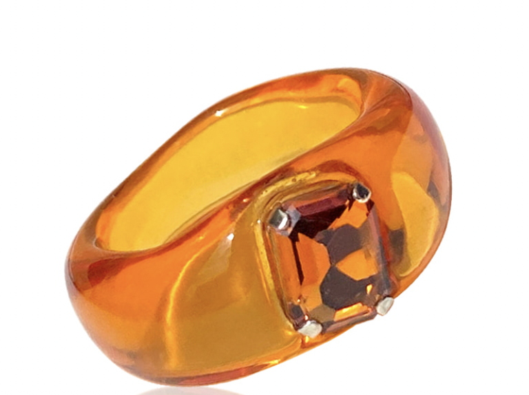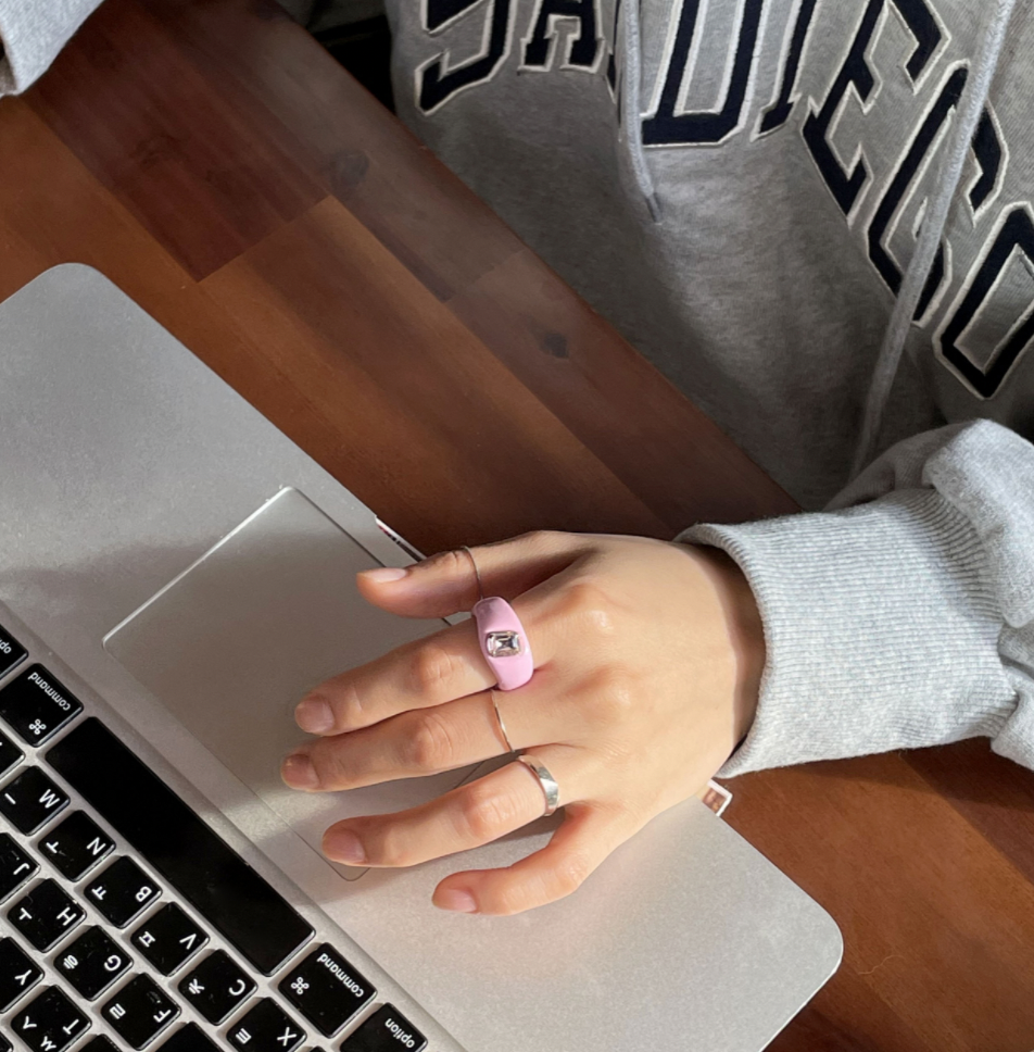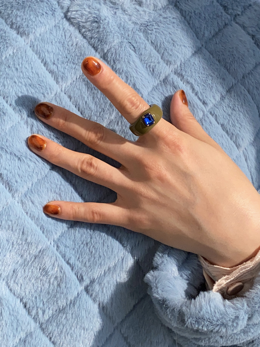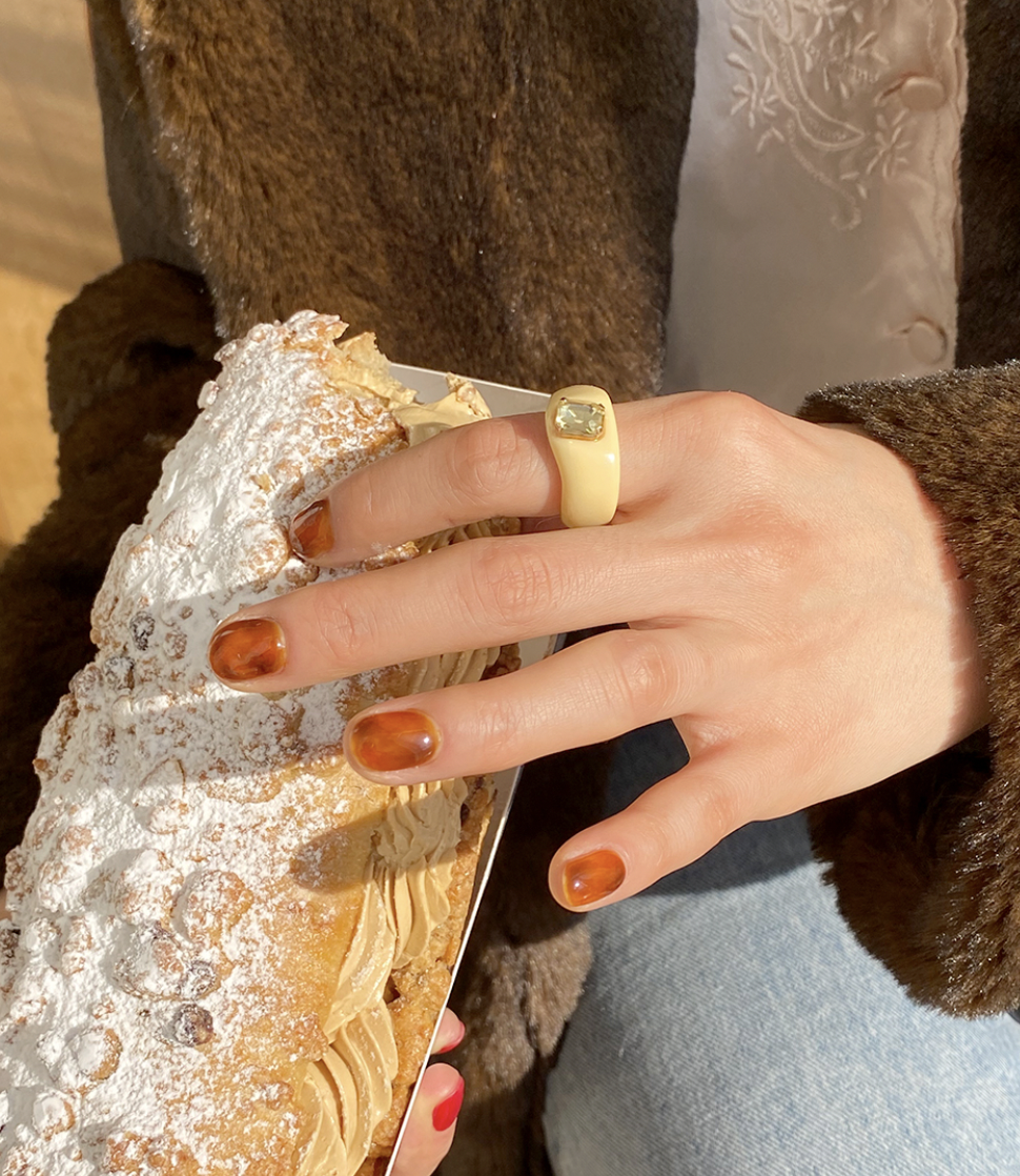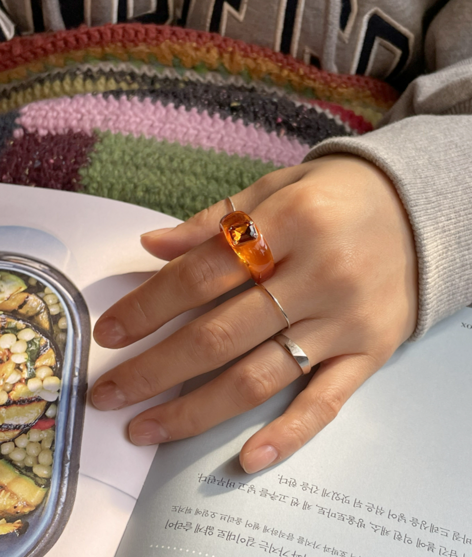 영리영리의 커스텀 주얼리 라인에서는 가벼운 소재로 몸을 편안하게 하면서도 키치한 디자인으로 자유롭게 자신을 표현할 수 있습니다. 직사각 스톤이 비스듬히 세팅되어 있는 토푸링은 도시적인 무드를 자아냅니다.