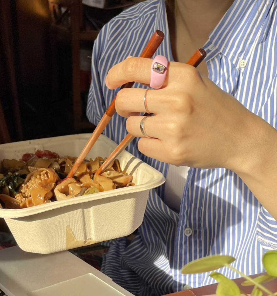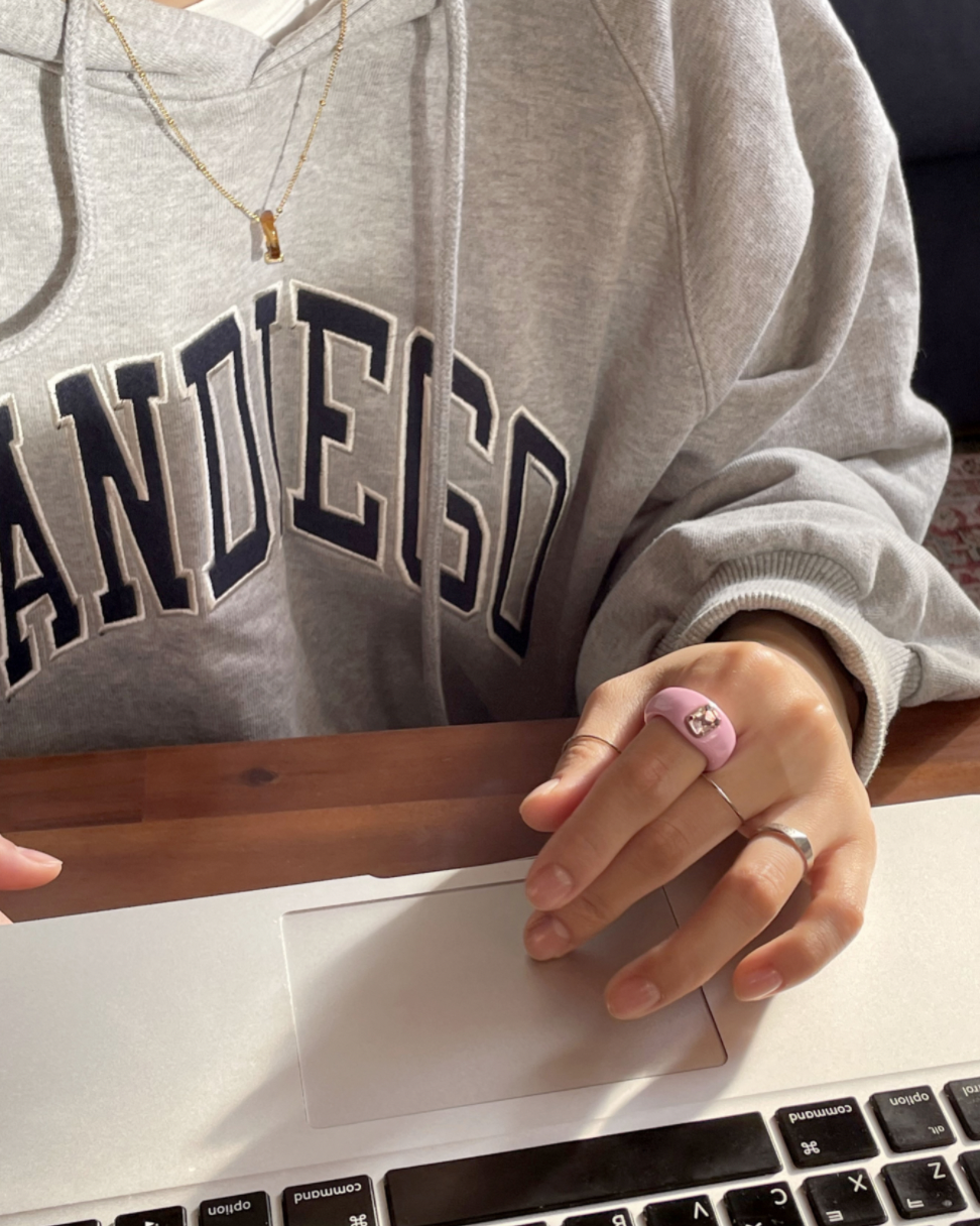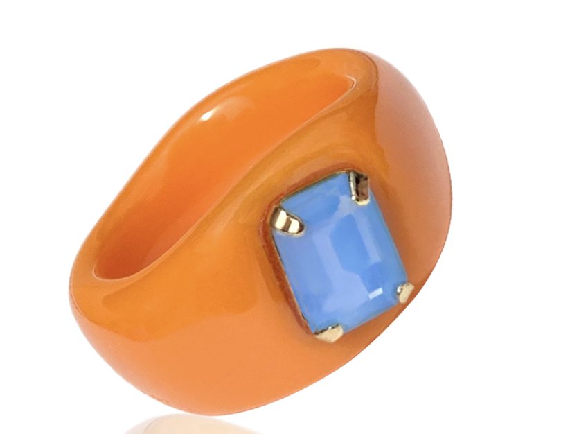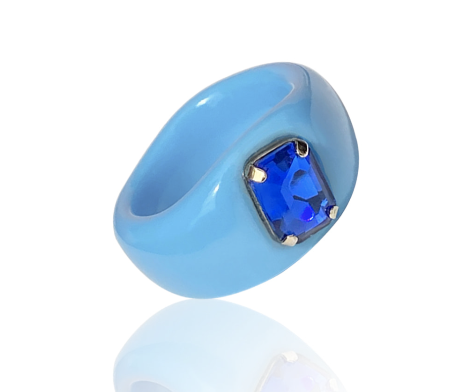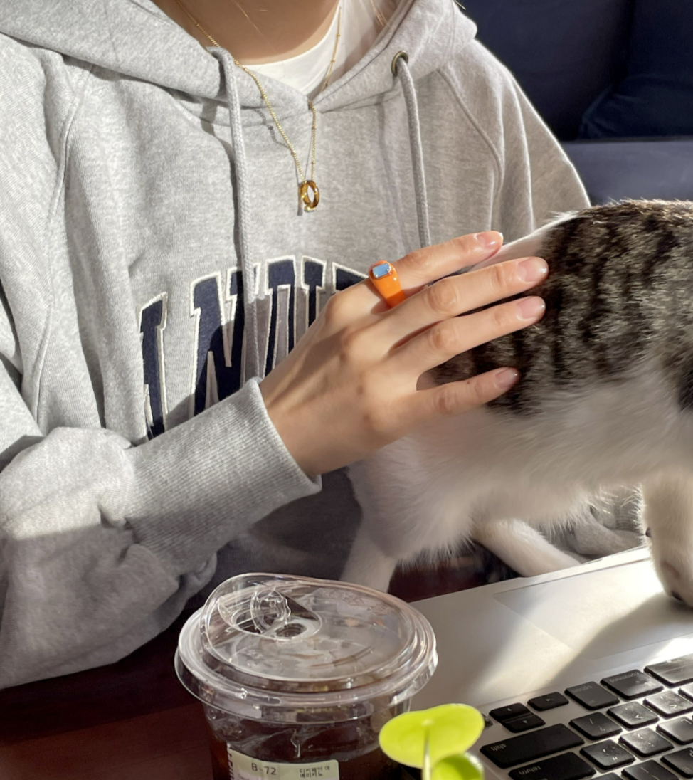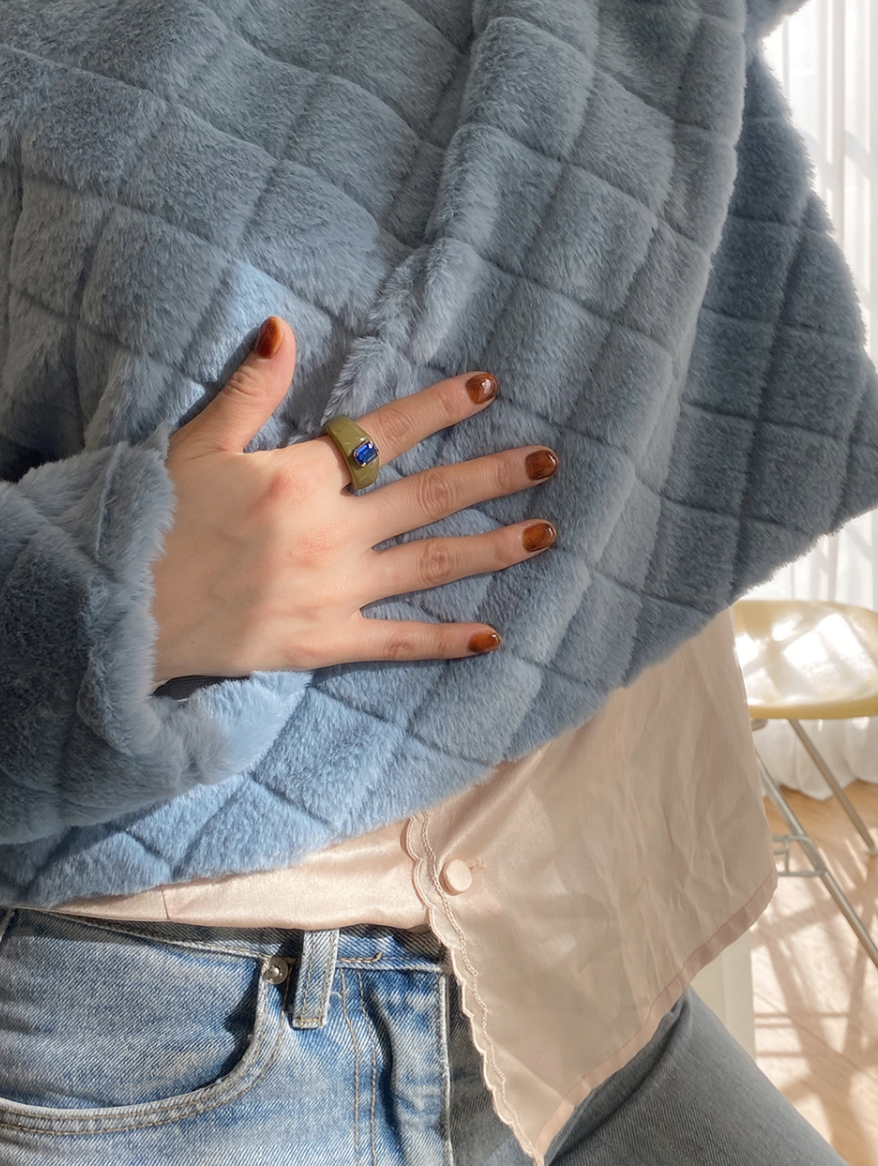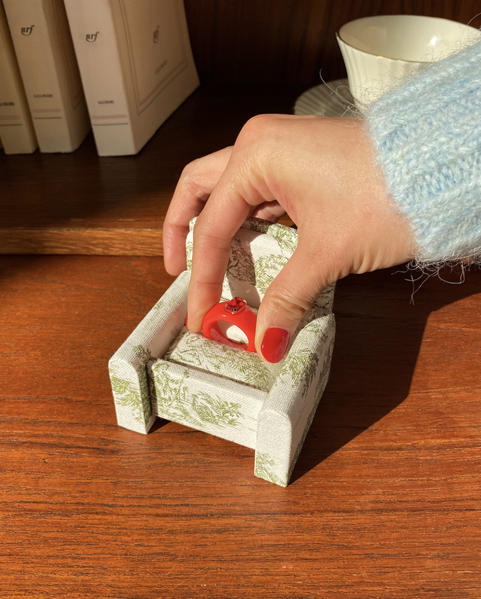 영리영리의 커스텀 주얼리 라인에서는 가벼운 소재로 몸을 편안하게 하면서도 키치한 디자인으로 자유롭게 자신을 표현할 수 있습니다. 직사각 스톤이 비스듬히 세팅되어 있는 토푸링은 도시적인 무드를 자아냅니다.
