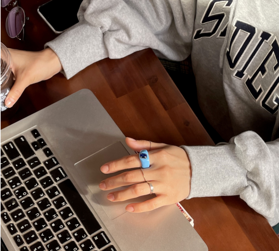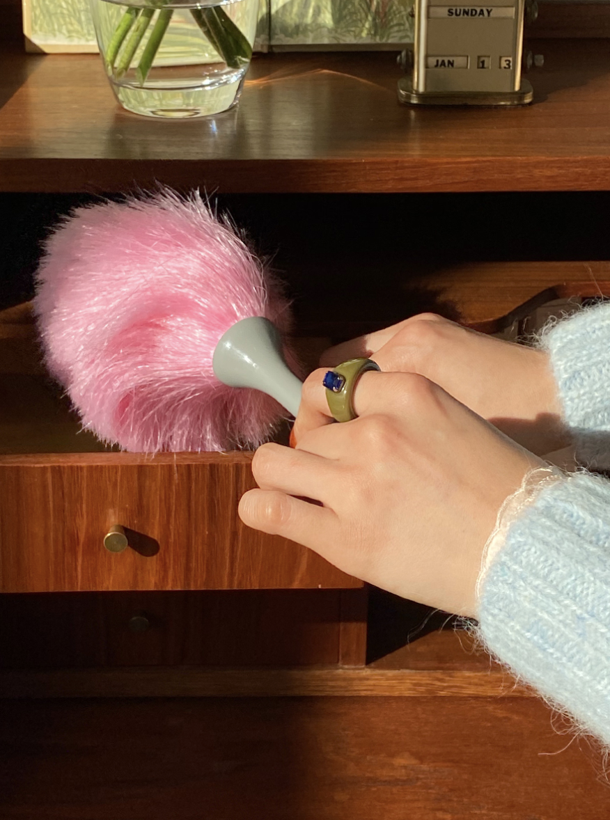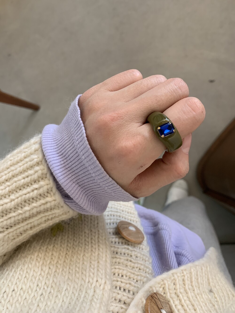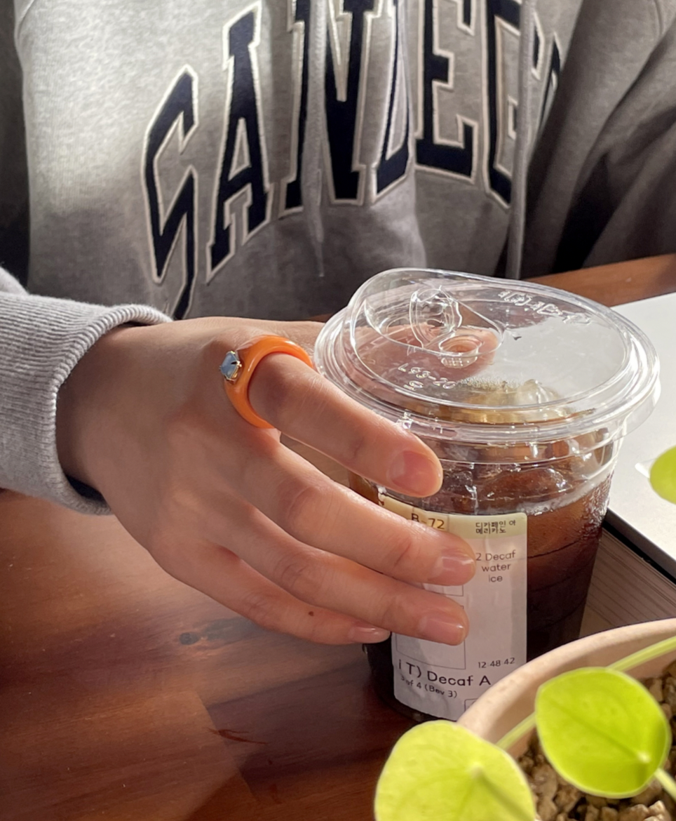 포마이카 소재의 반지입니다. 포마이카 소재의 바디는 변색에 강하나, 금속 부분은 물기가 닿지 않게 보관해주세요.