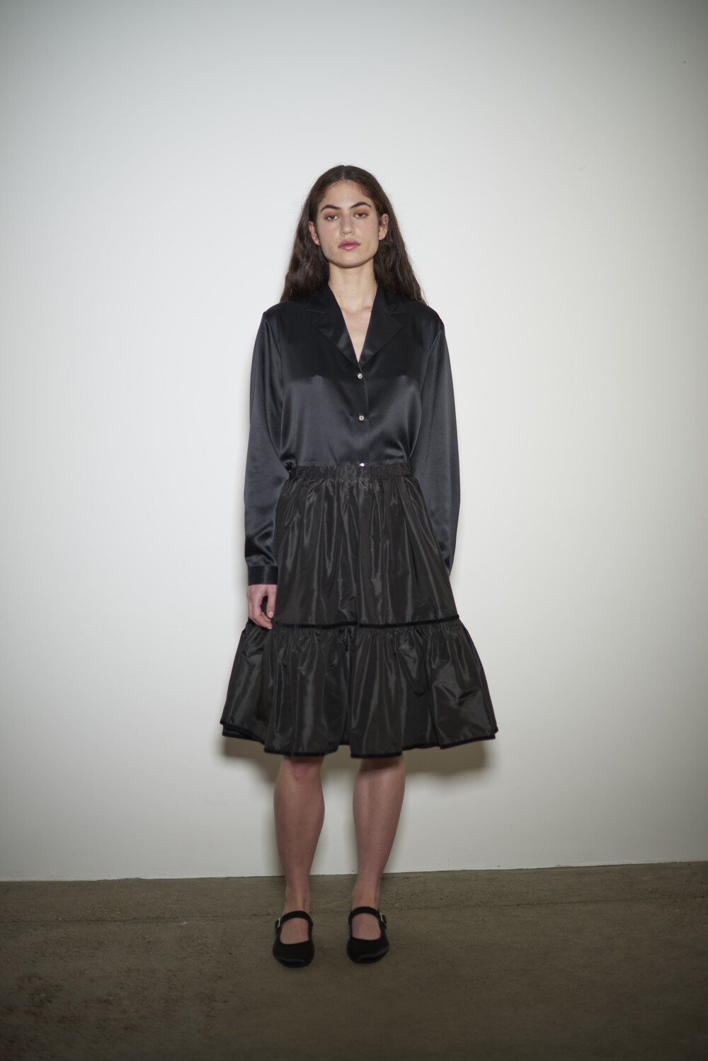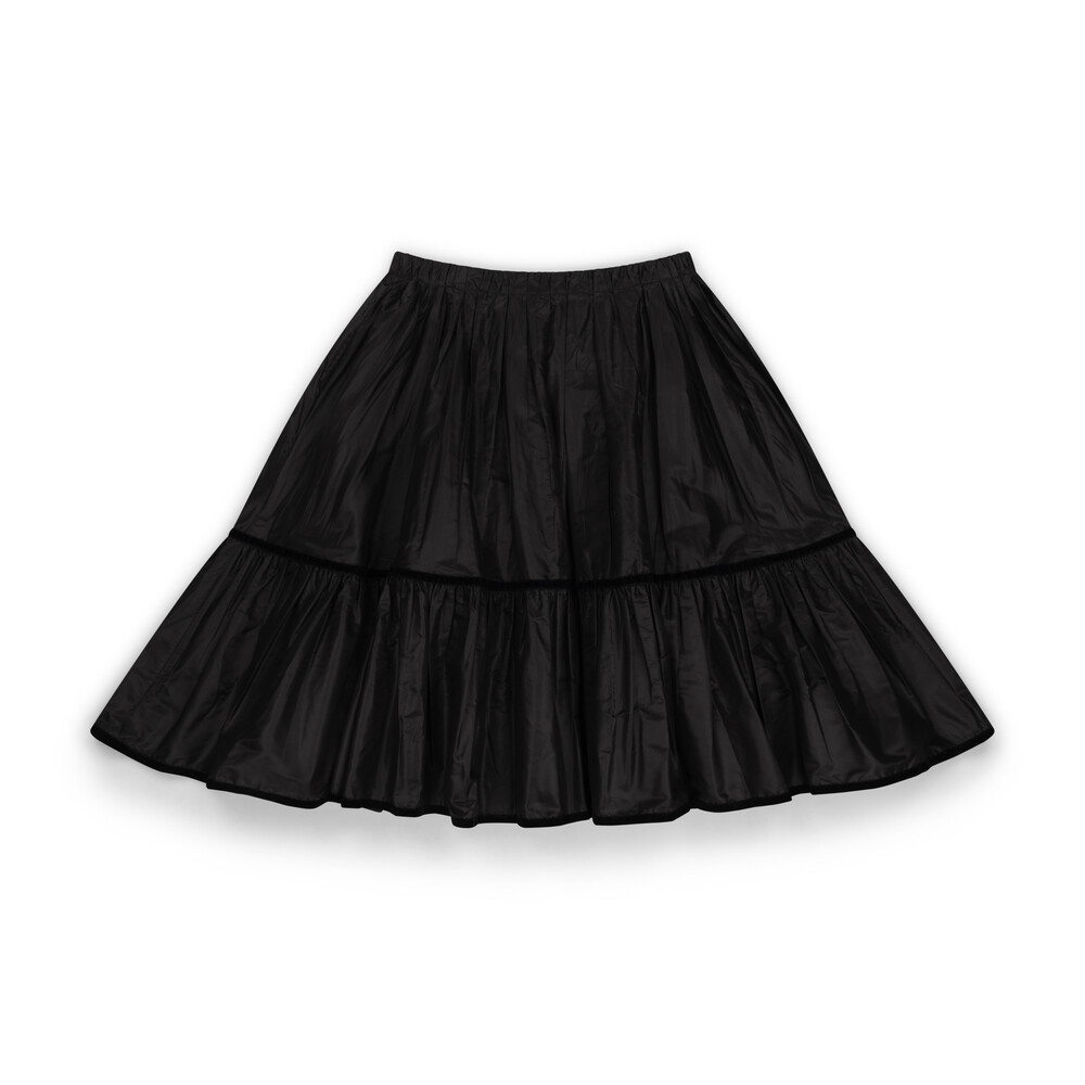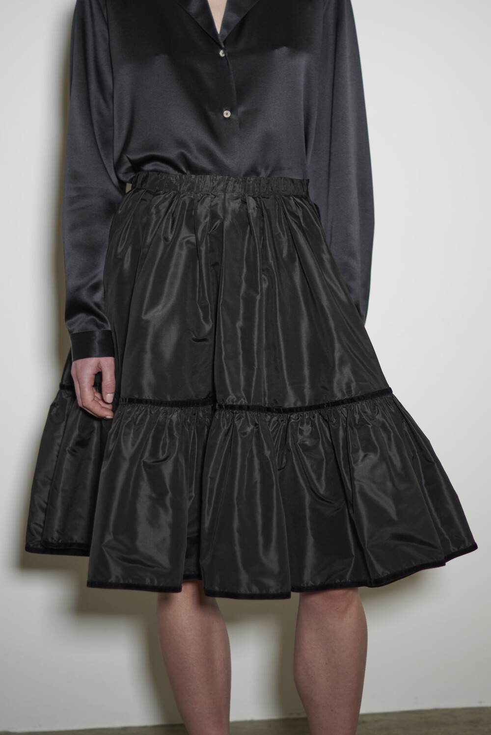 풍성함이 돋보이는 Ada Skirt 입니다. 종아리보다 살짝 아래로 내려오는 미디 기장으로, 밑단과 바디 중앙의 벨벳 트리밍으로 사랑스러움을 강조하였습니다.