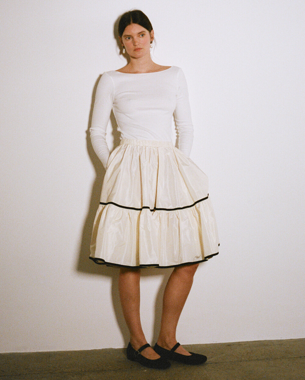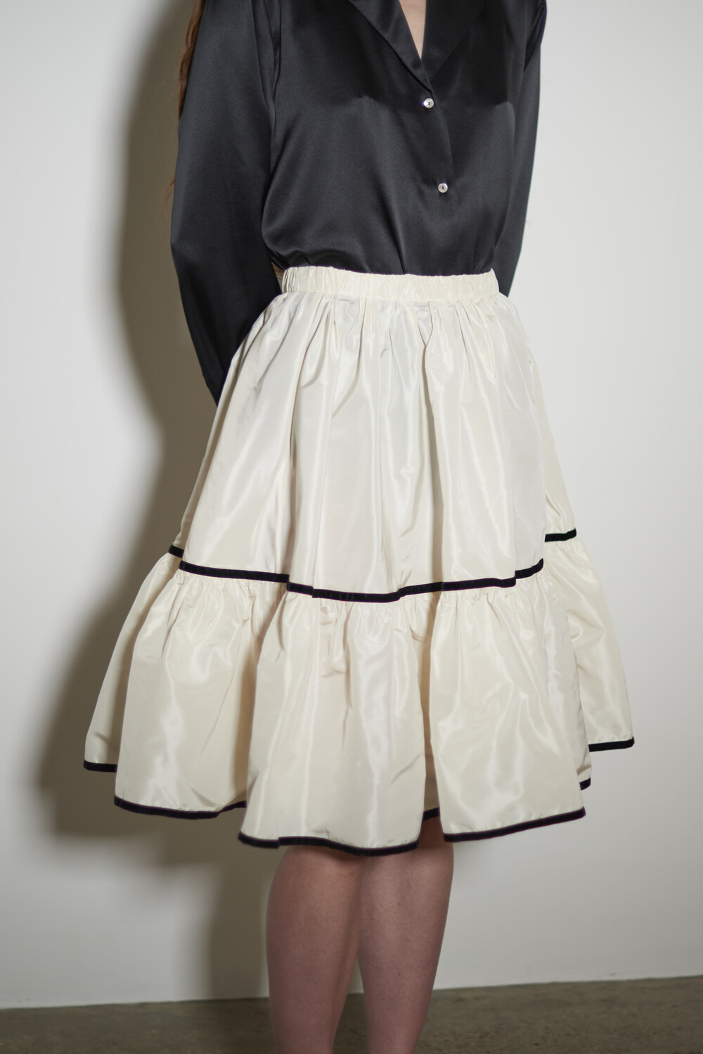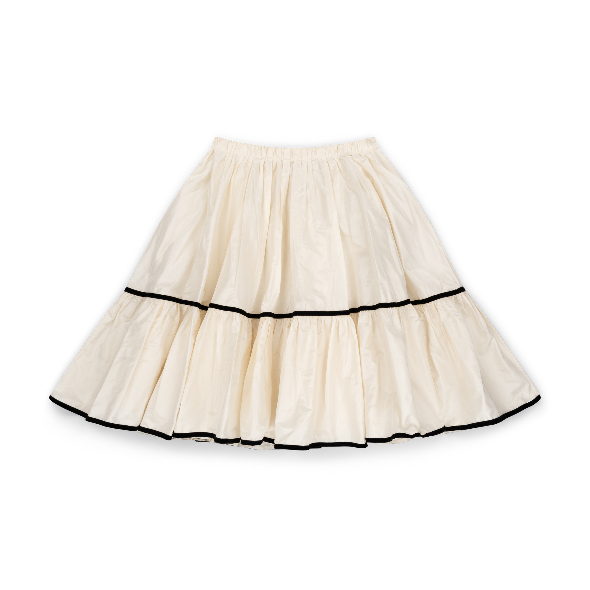 풍성함이 돋보이는 Ada Skirt 입니다. 종아리보다 살짝 아래로 내려오는 미디 기장으로, 밑단과 바디 중앙의 벨벳 트리밍으로 사랑스러움을 강조하였습니다.