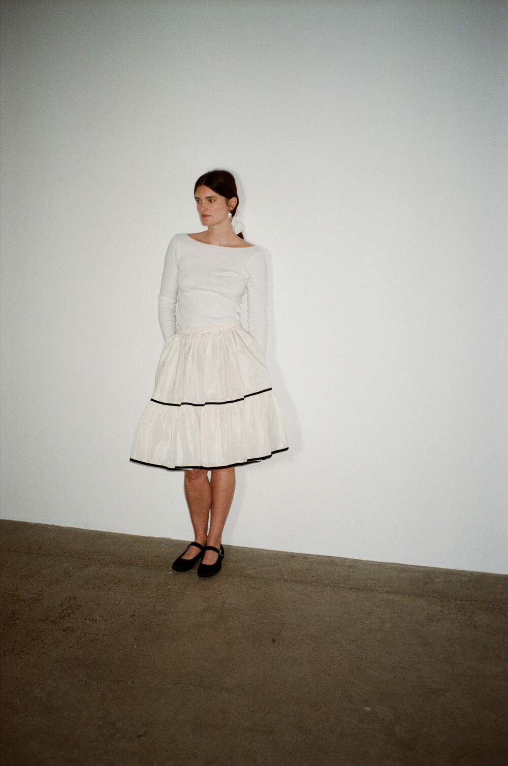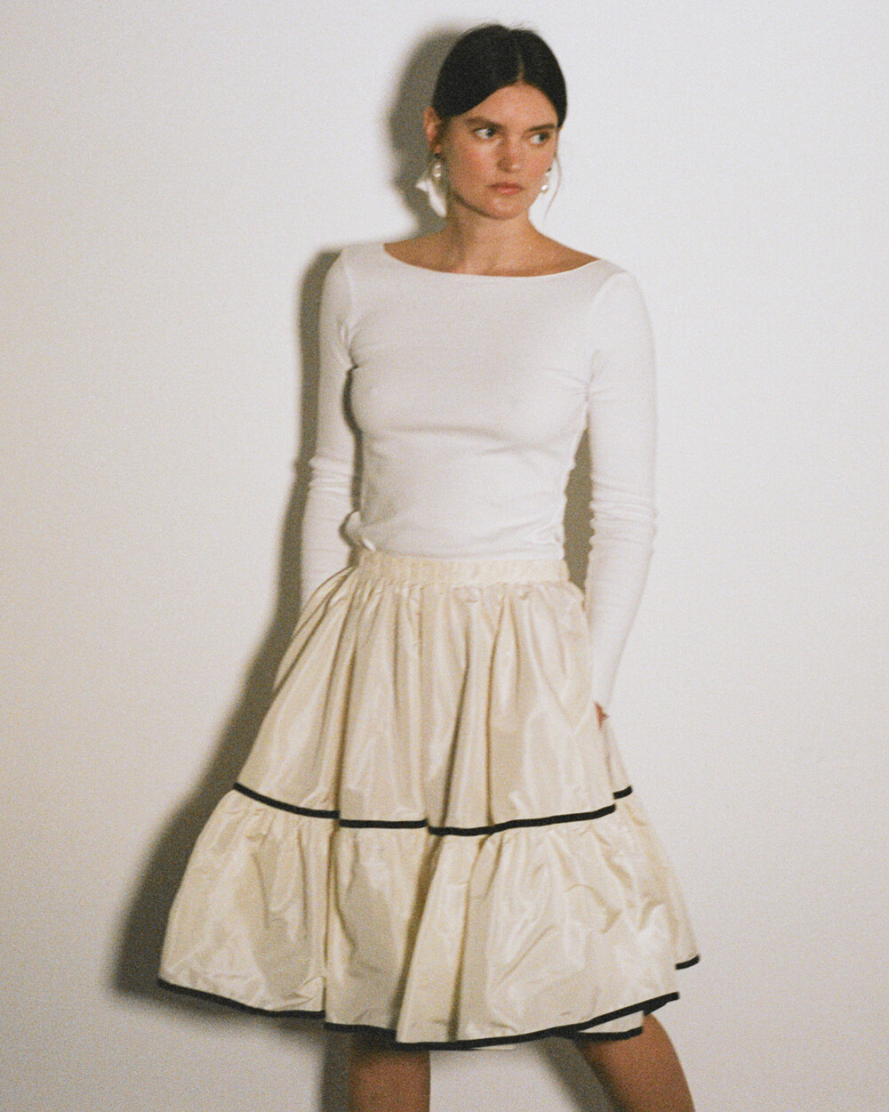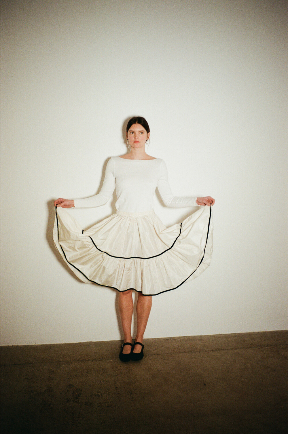 풍성함이 돋보이는 Ada Skirt 입니다. 종아리보다 살짝 아래로 내려오는 미디 기장으로, 밑단과 바디 중앙의 벨벳 트리밍으로 사랑스러움을 강조하였습니다.