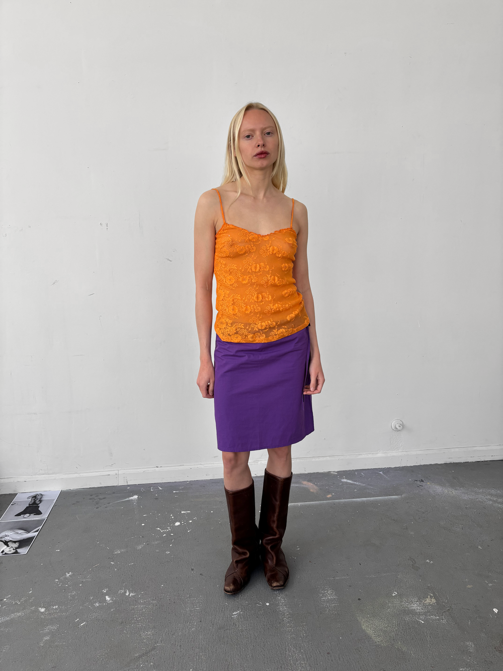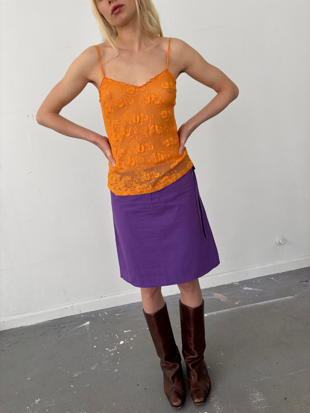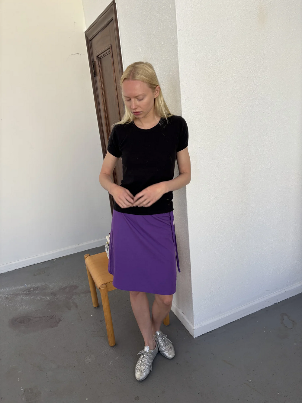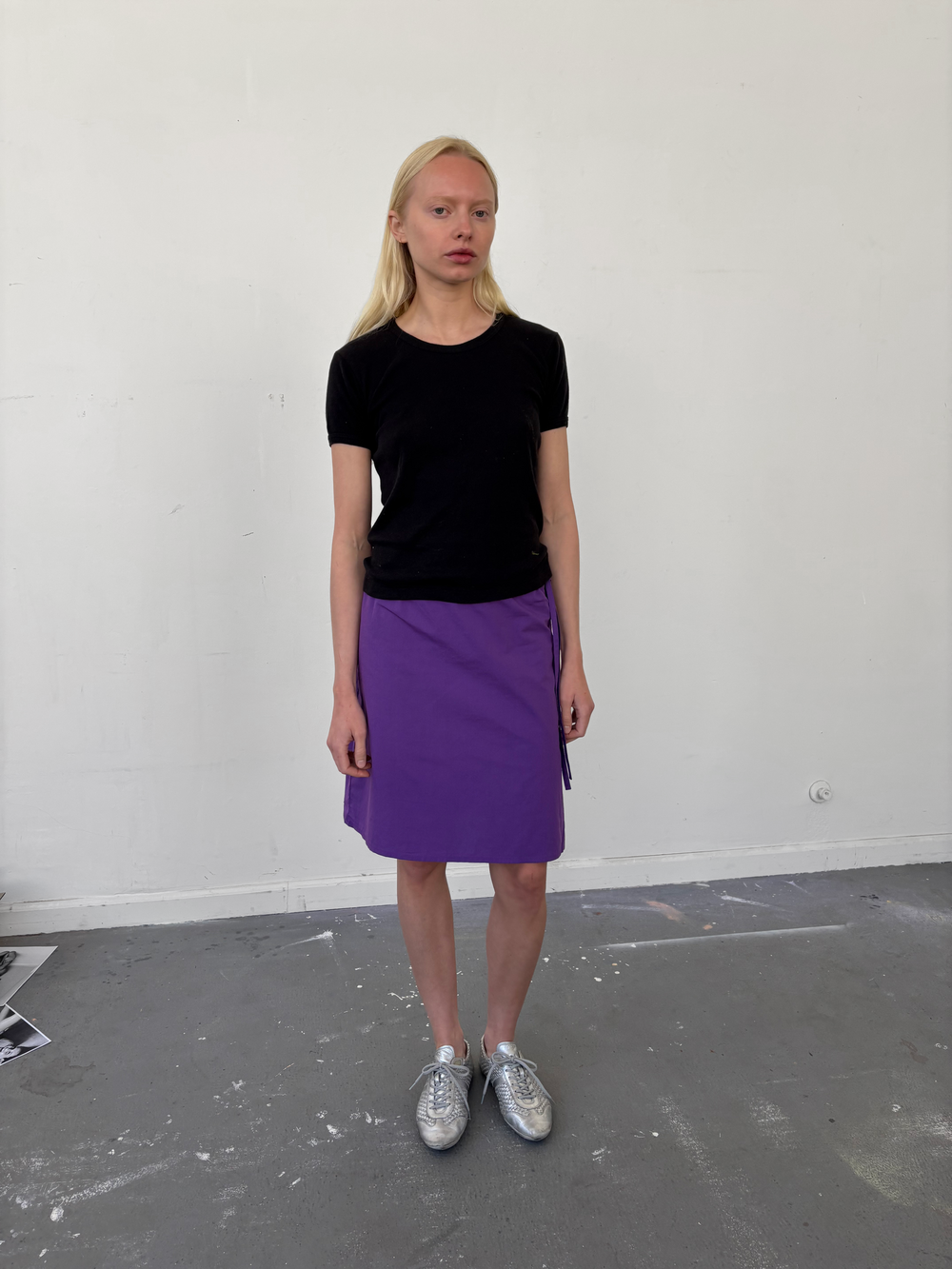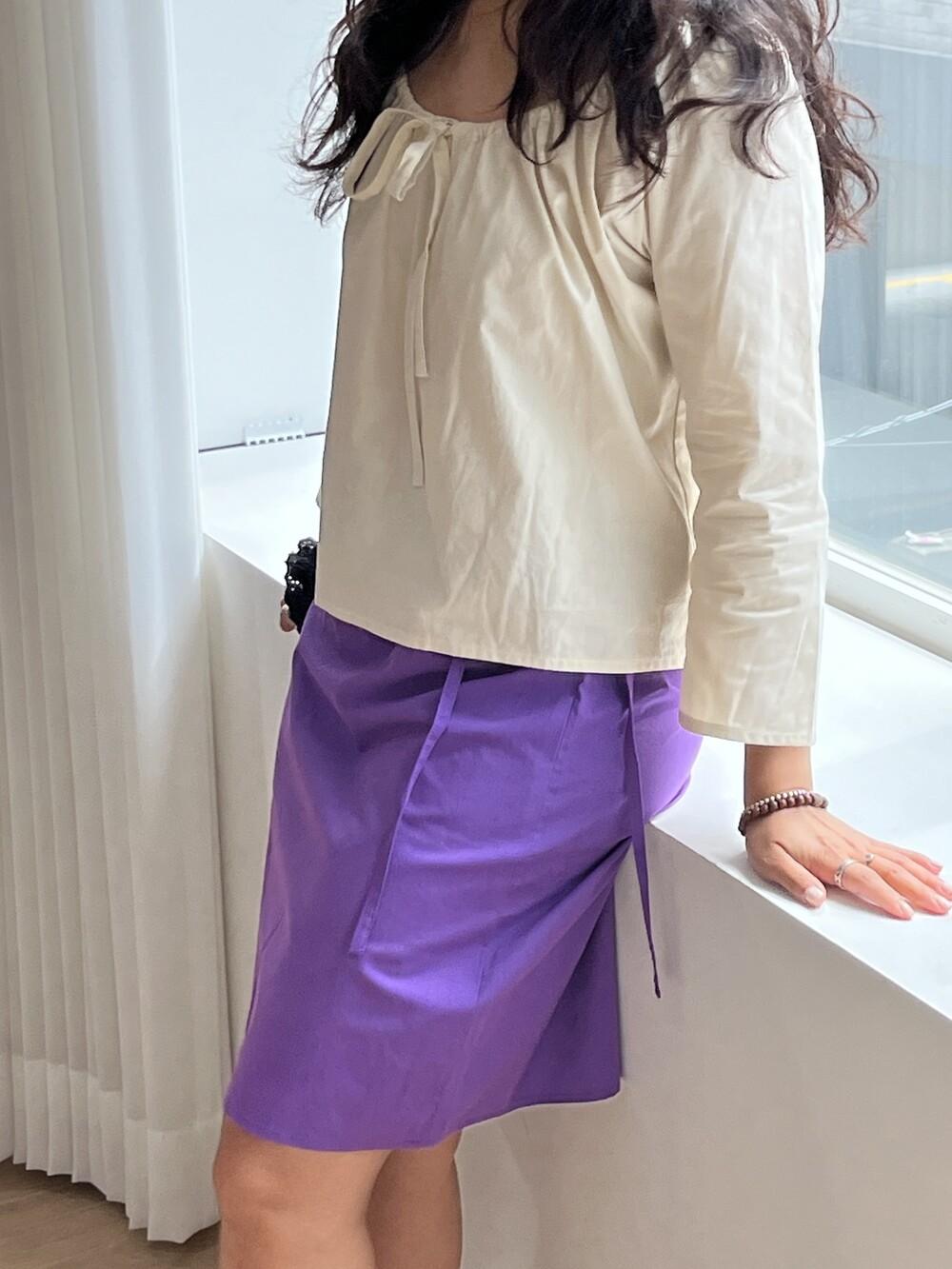 허리의 끈을 통해 사이즈 조절을 자유롭게 할 수 있으며, 플레어가 살짝 들어간 디테일이 특징입니다.